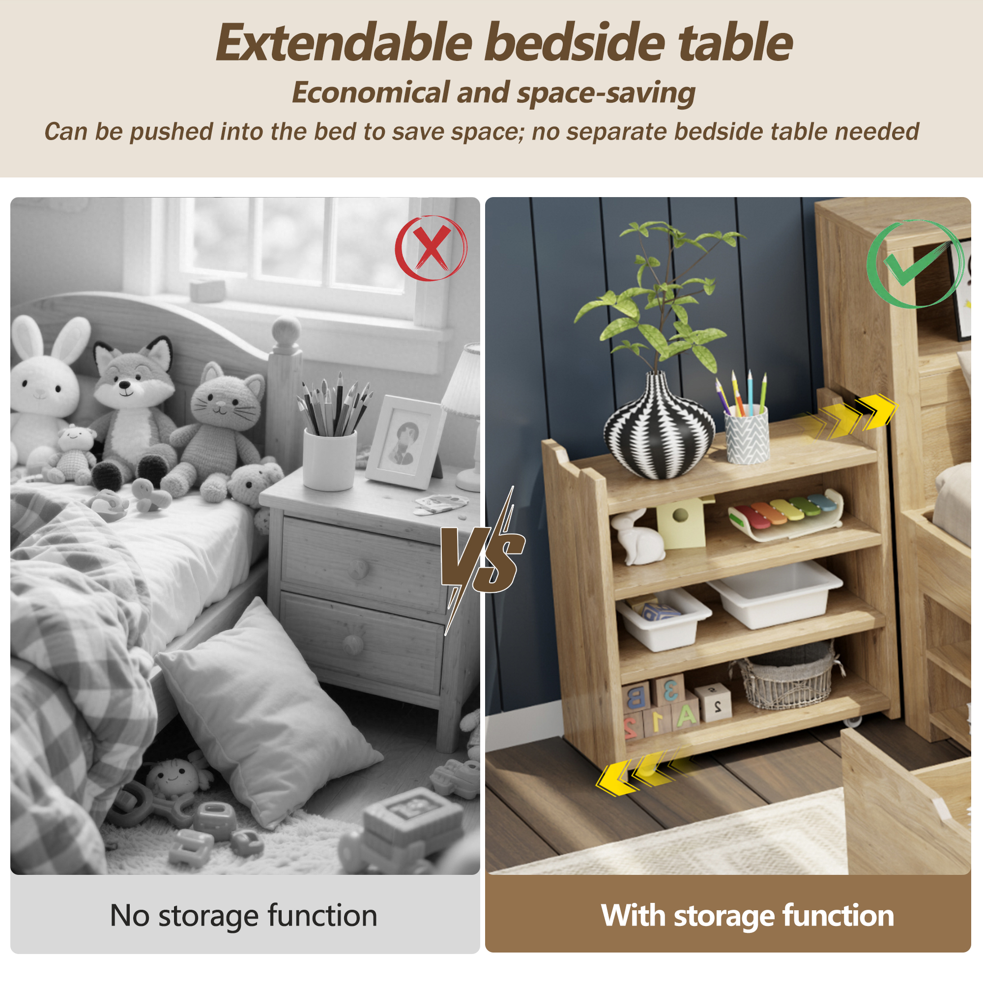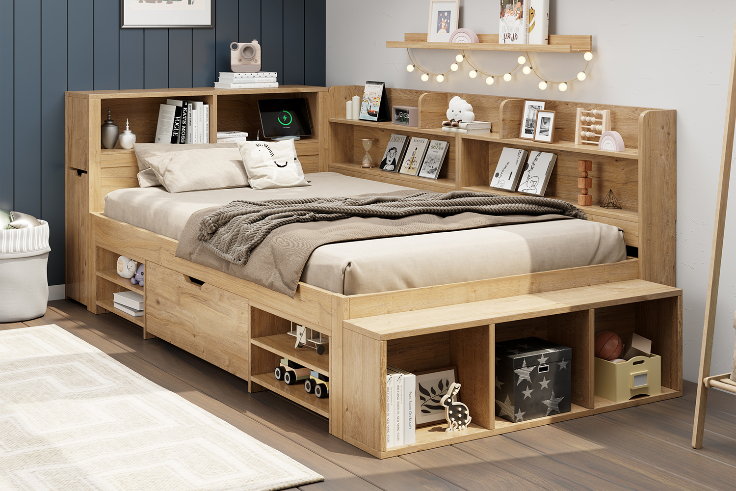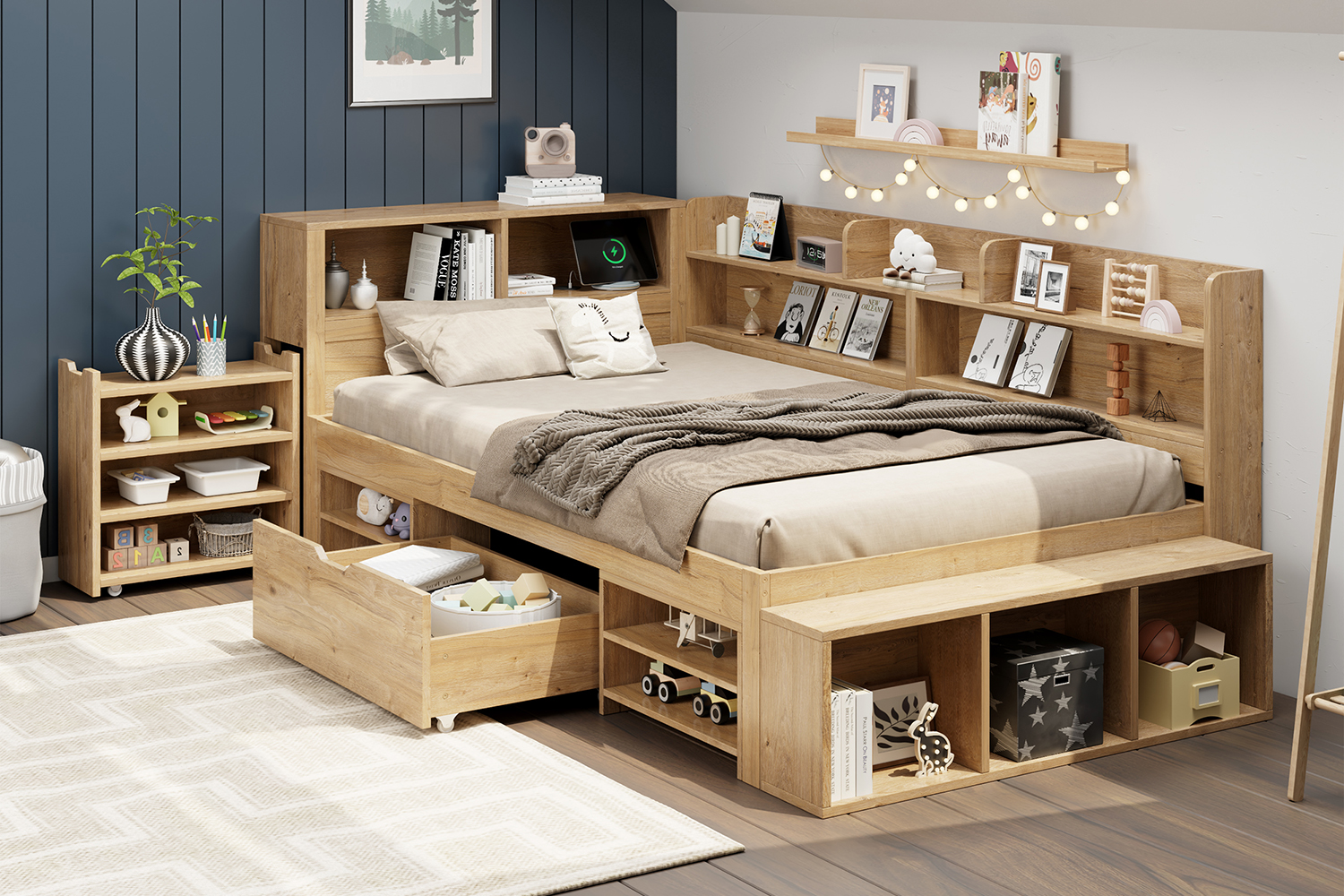 - LARGE STORAGE SPACE: Hidden storage cabinet at the head of the bed, a drawer on the side of the bed and cabinets around the bed, which can store various items such as clothes, toys, books, etc.