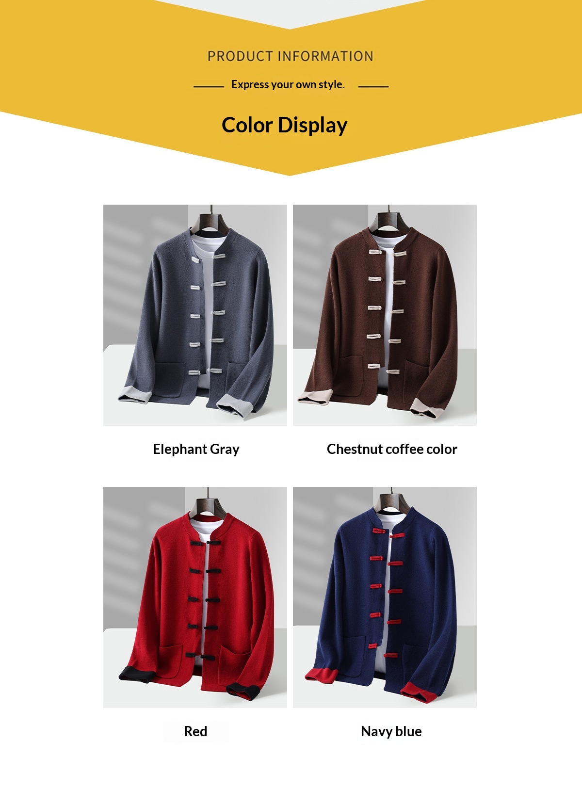 Colors: Navy Blue, Elephant Gray, Chestnut Brown, Jujube Red
