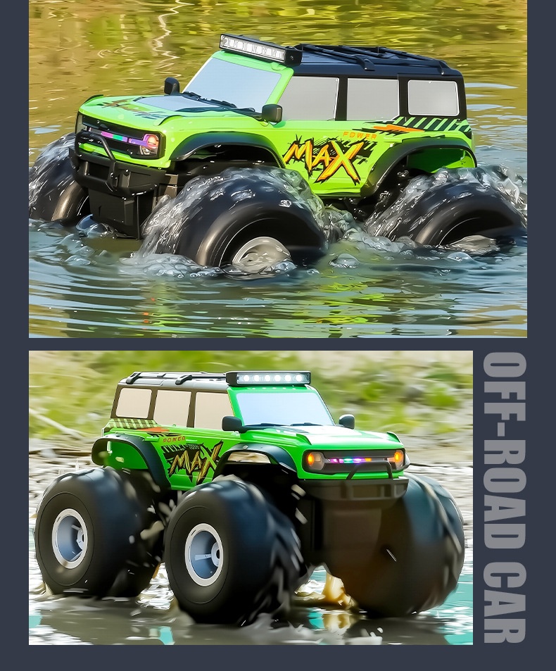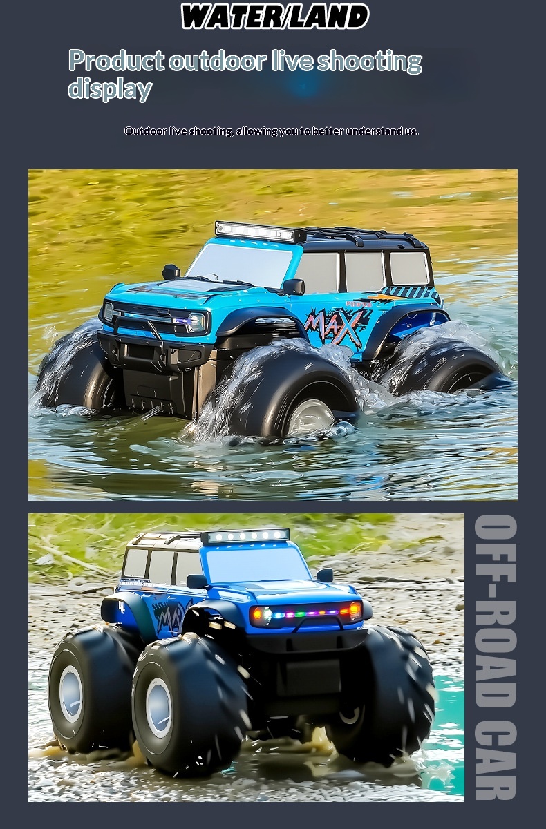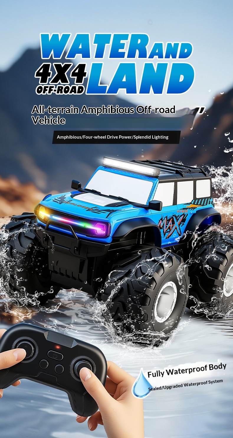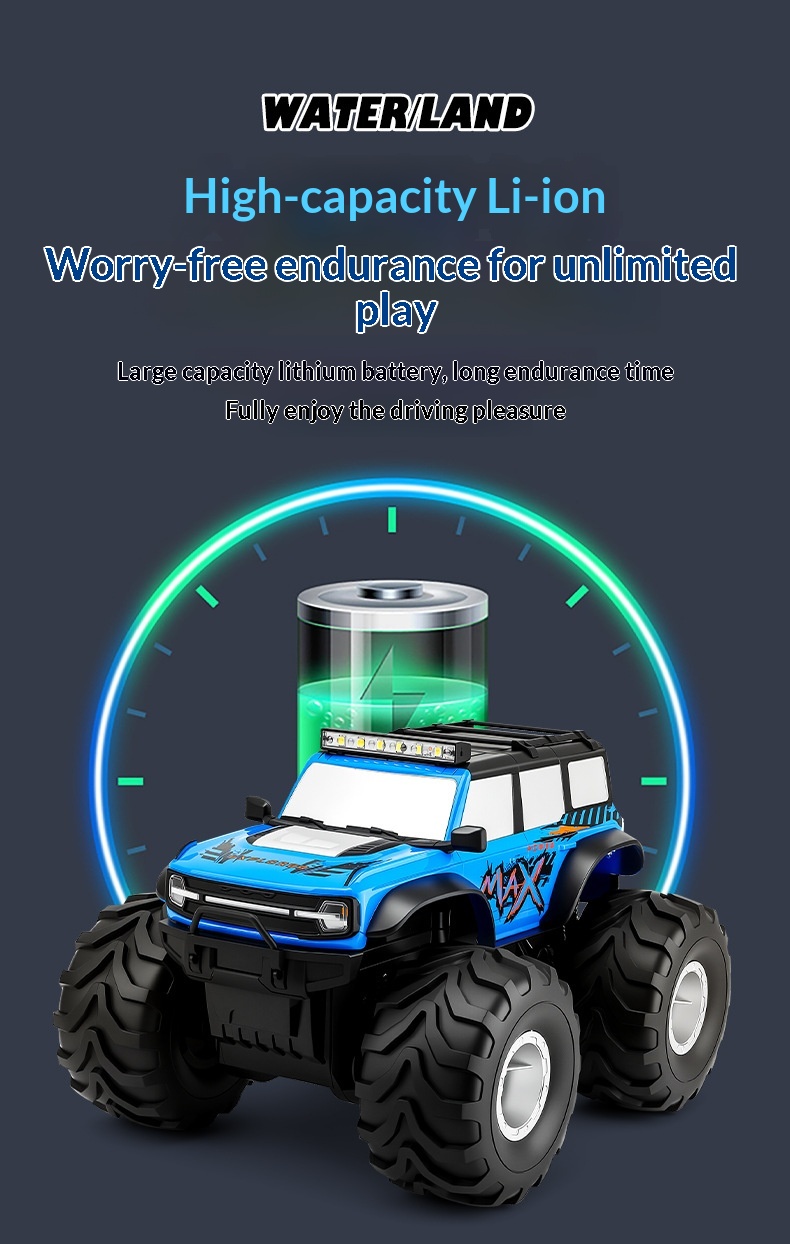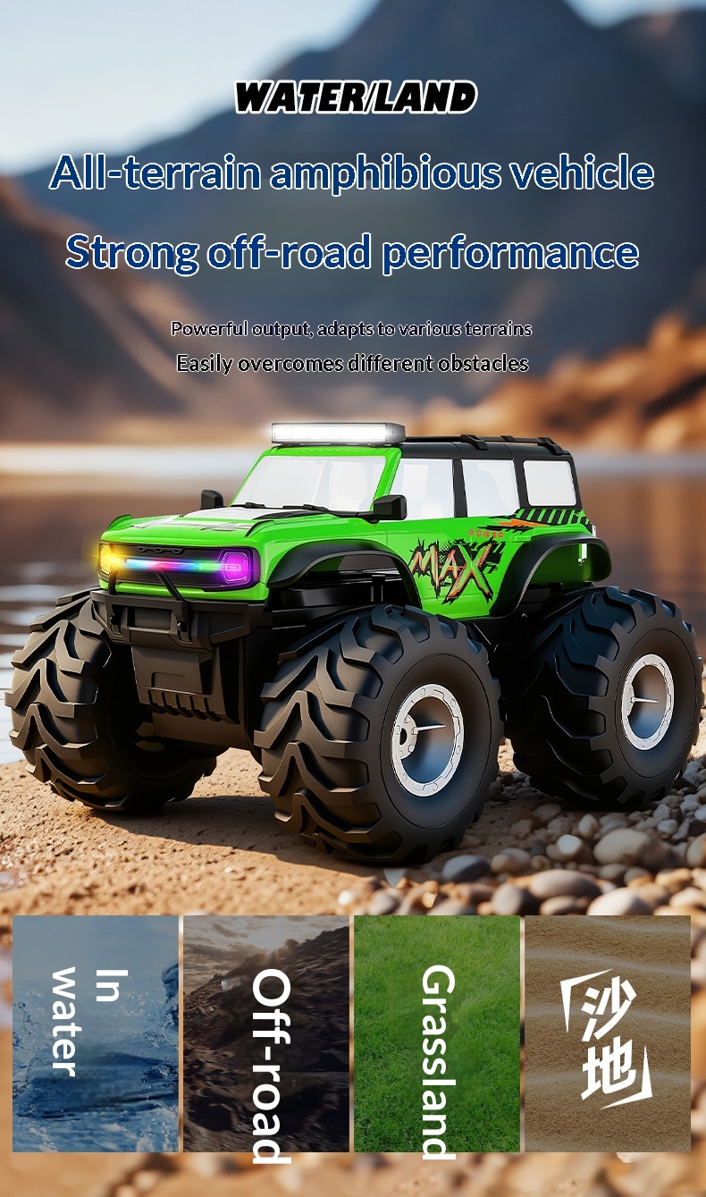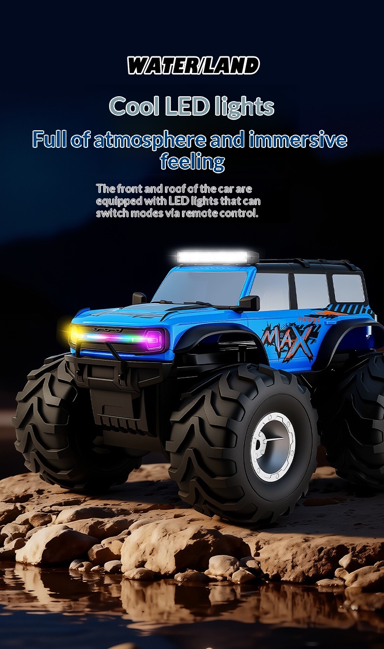 Colors: Blue premium amphibious remote-controlled car with colored lights, Green premium amphibious remote-controlled car with colored lights