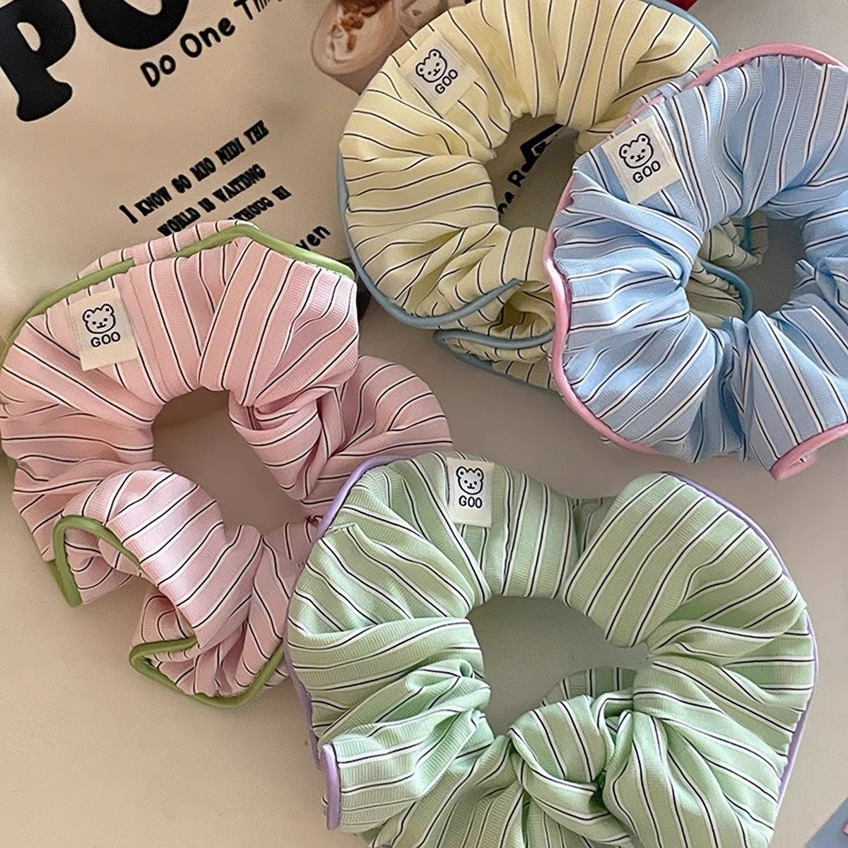 Cream-colored Contrast-striped Hair Accessory With A Sweet Little Bear Designa Chic Scrunchie