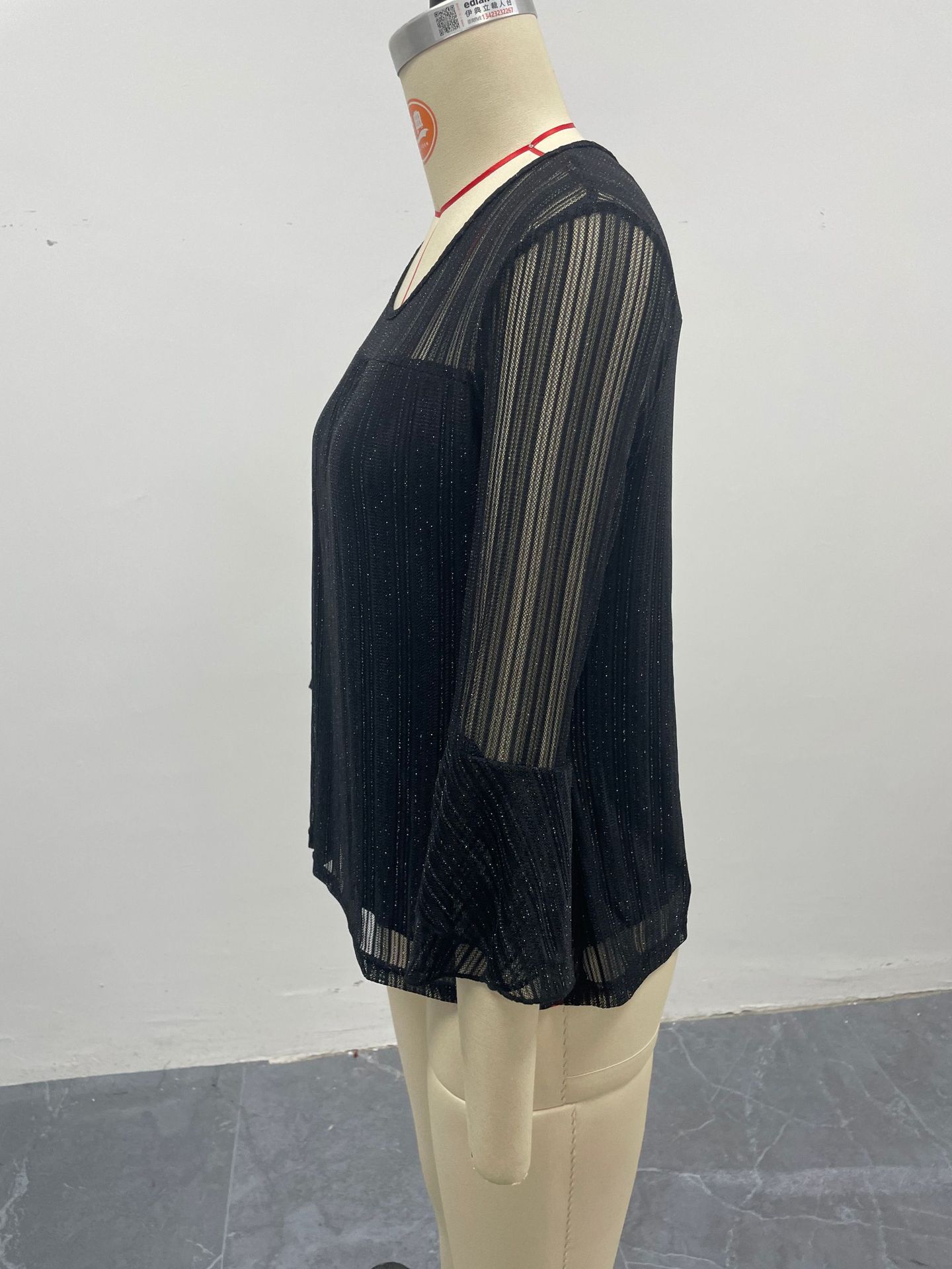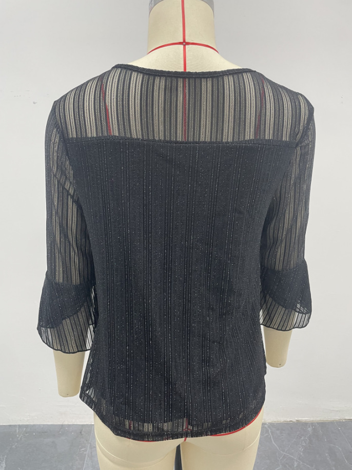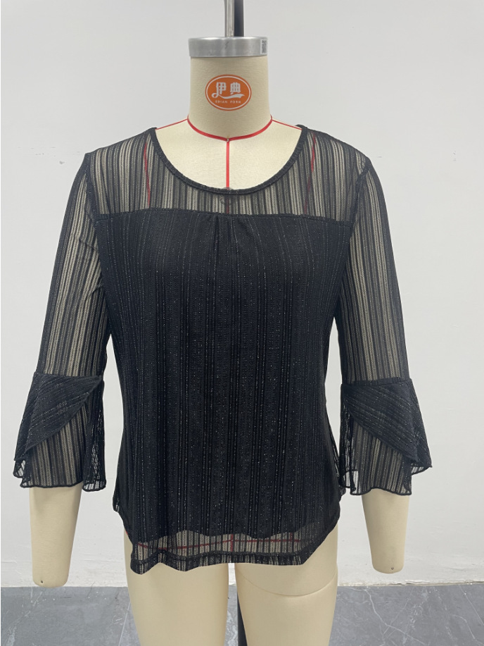 Cross-Border Black Elegant Loose Top With See-Through Long Sleeves And A Round Neck