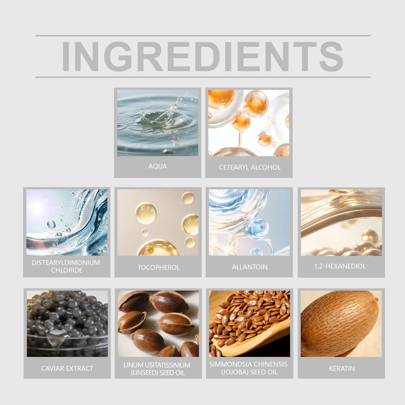 Ingredients: water, cetearyl alcohol, distearyl dimethyl ammonium chloride, 1,2- hexanediol, tocopherol (vitamin E), allantoin, sturgeon caviar extract, linseed oil, jojoba seed oil and keratin.