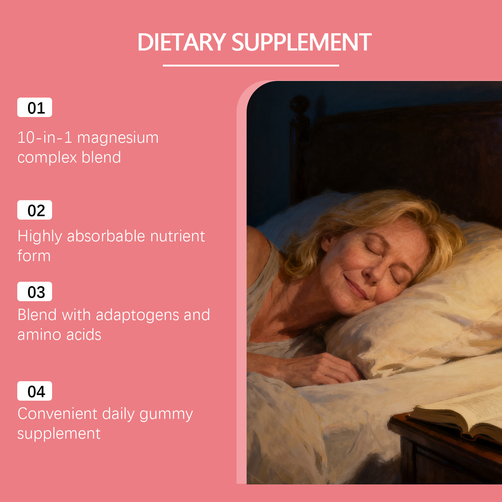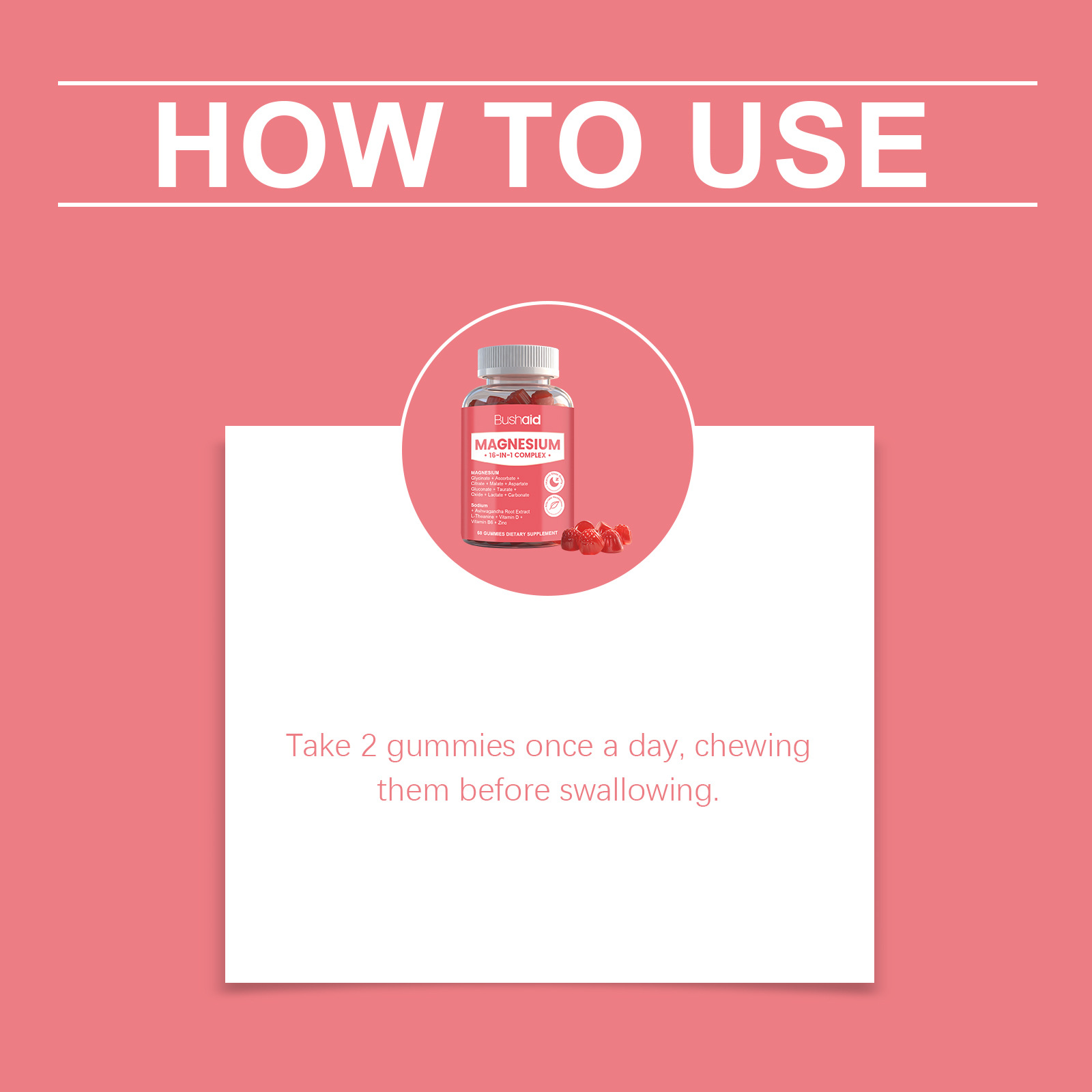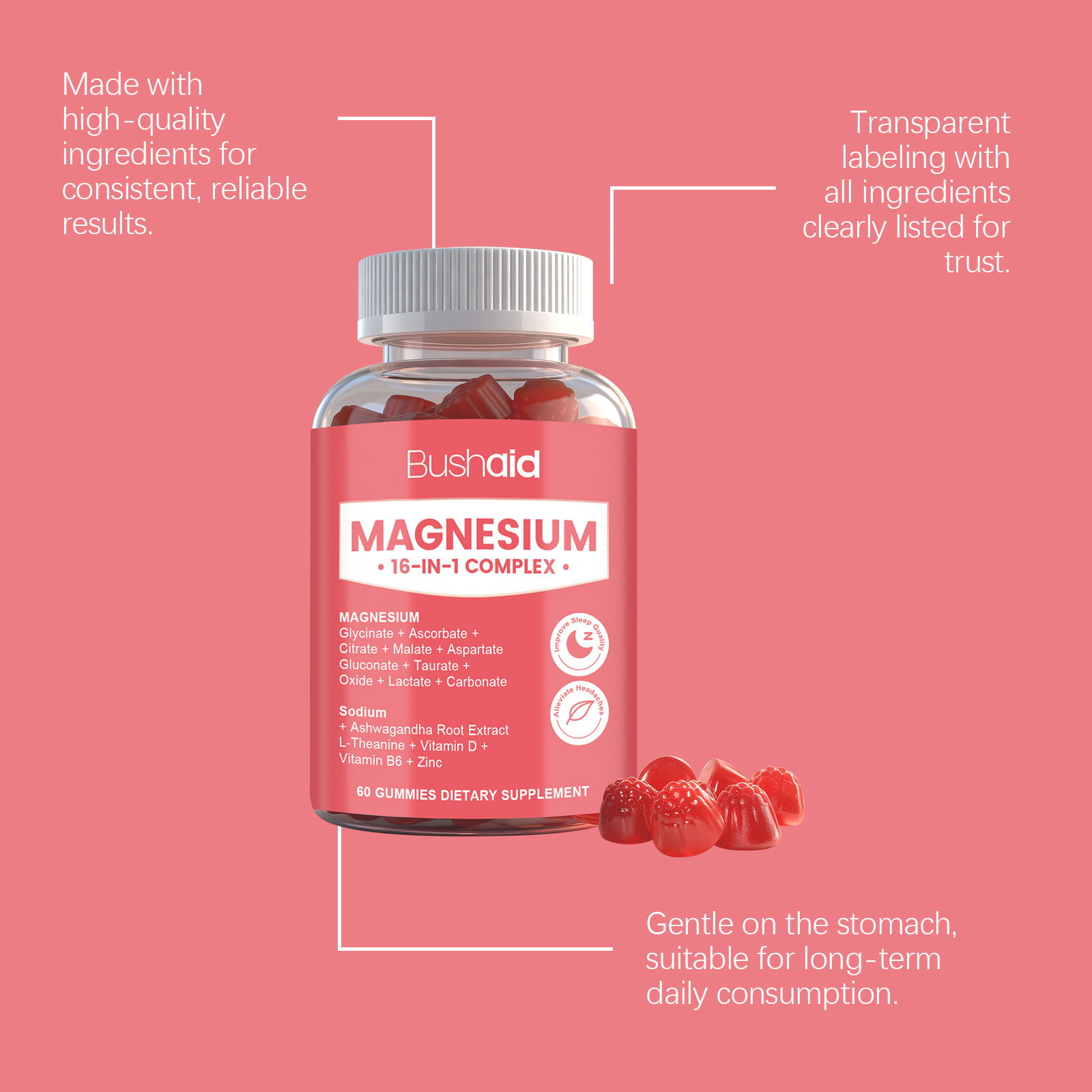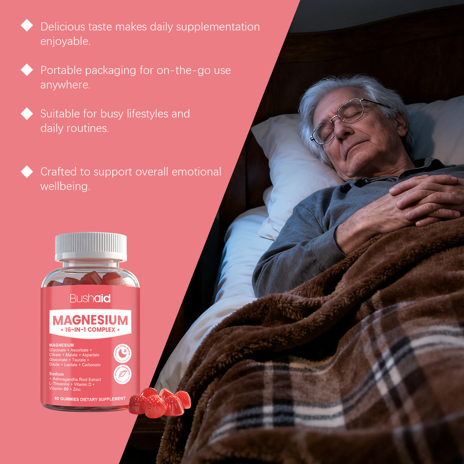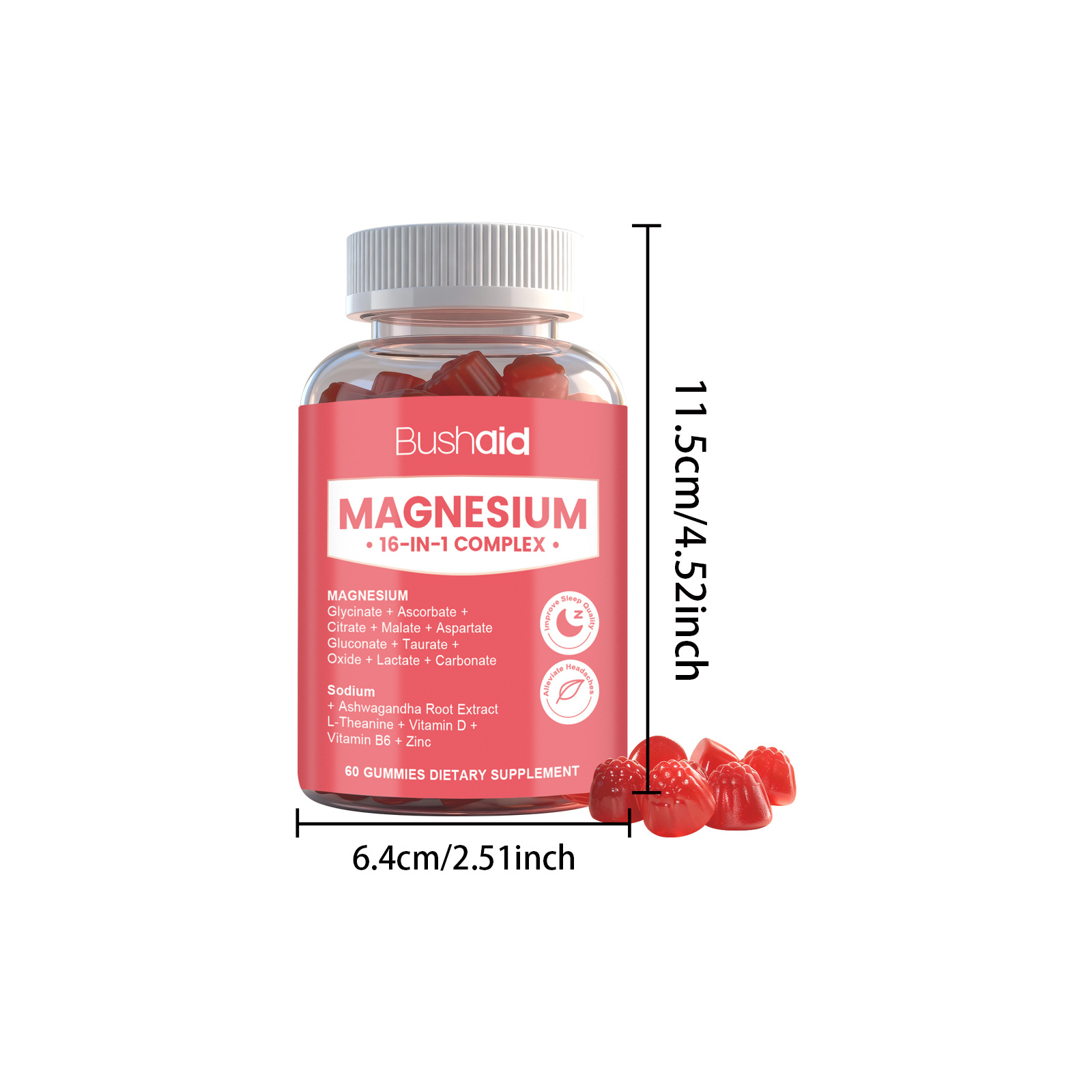 Product information:Ingredients: magnesium complex, vitamin B6, zinc, withania somnifera and L- theanine. Packing list: Soft candy *60gummies Product Image: