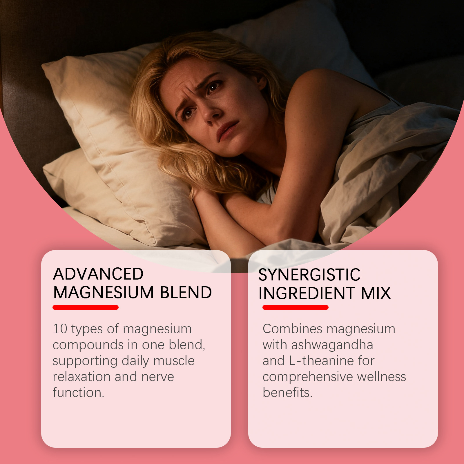 Ingredients: magnesium complex, vitamin B6, zinc, withania somnifera and L- theanine.