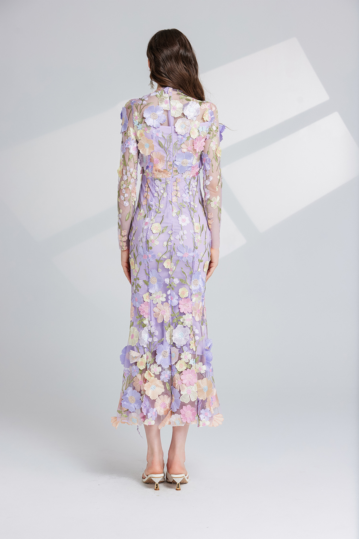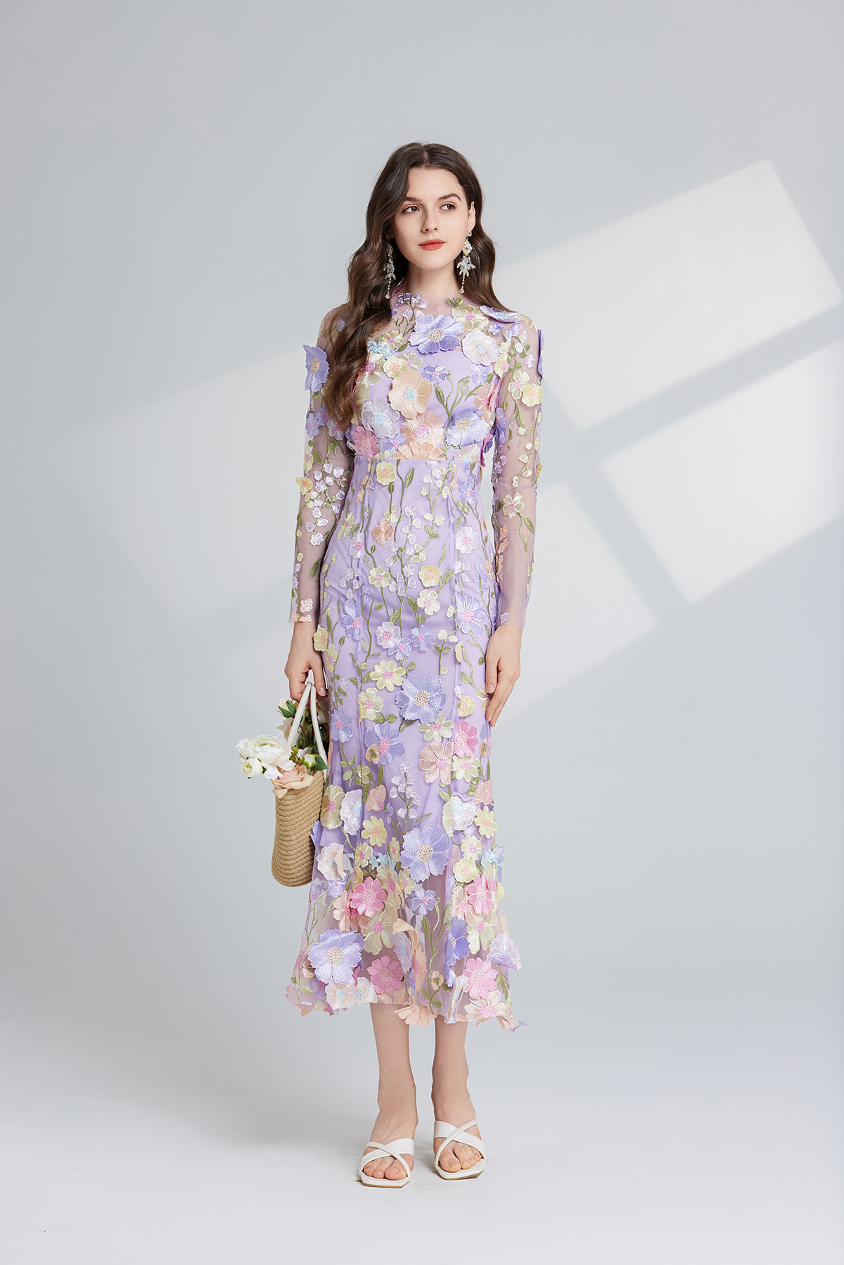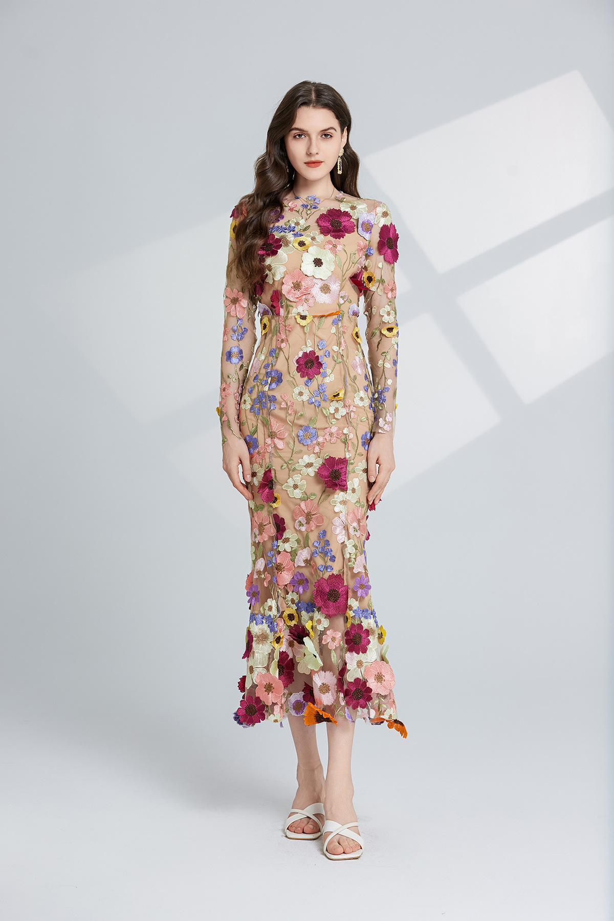 Dress Elegant Embroidered 3D Flower Design, Defined Waistline Long Sleeves