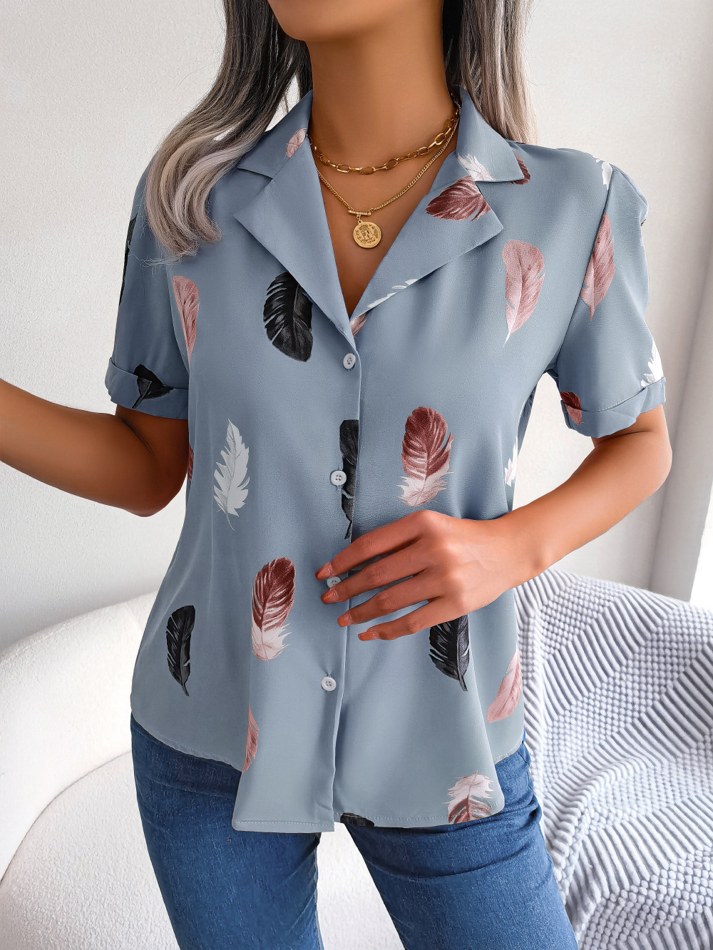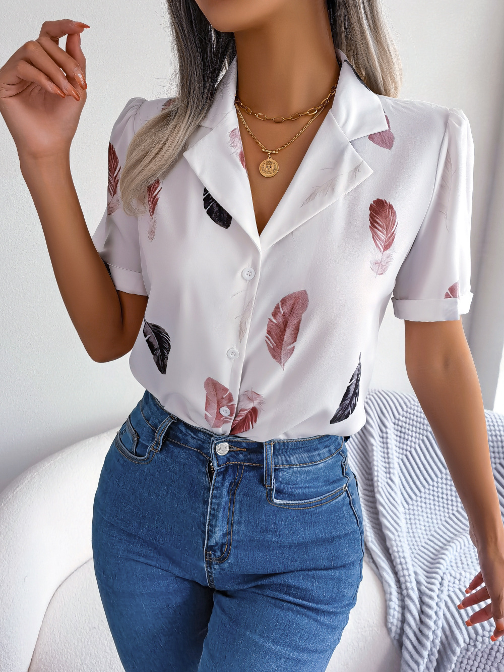 Elegant Womens Blazercollar Feather Top With A RelaxedShortsleeve Design