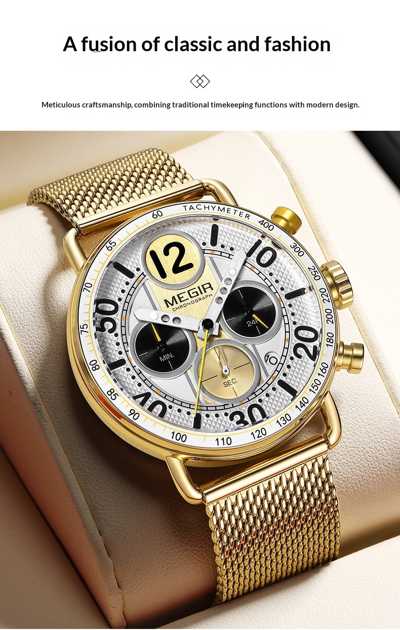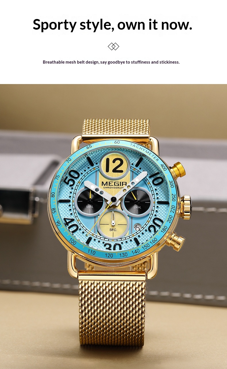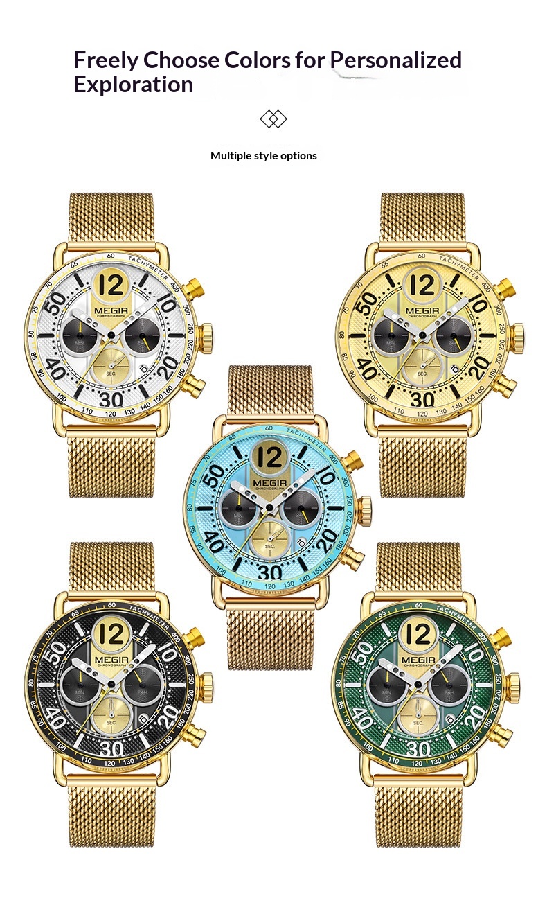 Color: Gold case, gold bezel, gold dial, gold mesh band; gold case, green bezel, gold accents with green dial, gold mesh band; gold case, white bezel, gold accents with white dial, gold mesh band; gold case, black bezel, gold accents with black dial, gold mesh band; gold case, sky-blue bezel, gold accents with sky-blue dial, gold mesh band (around March)