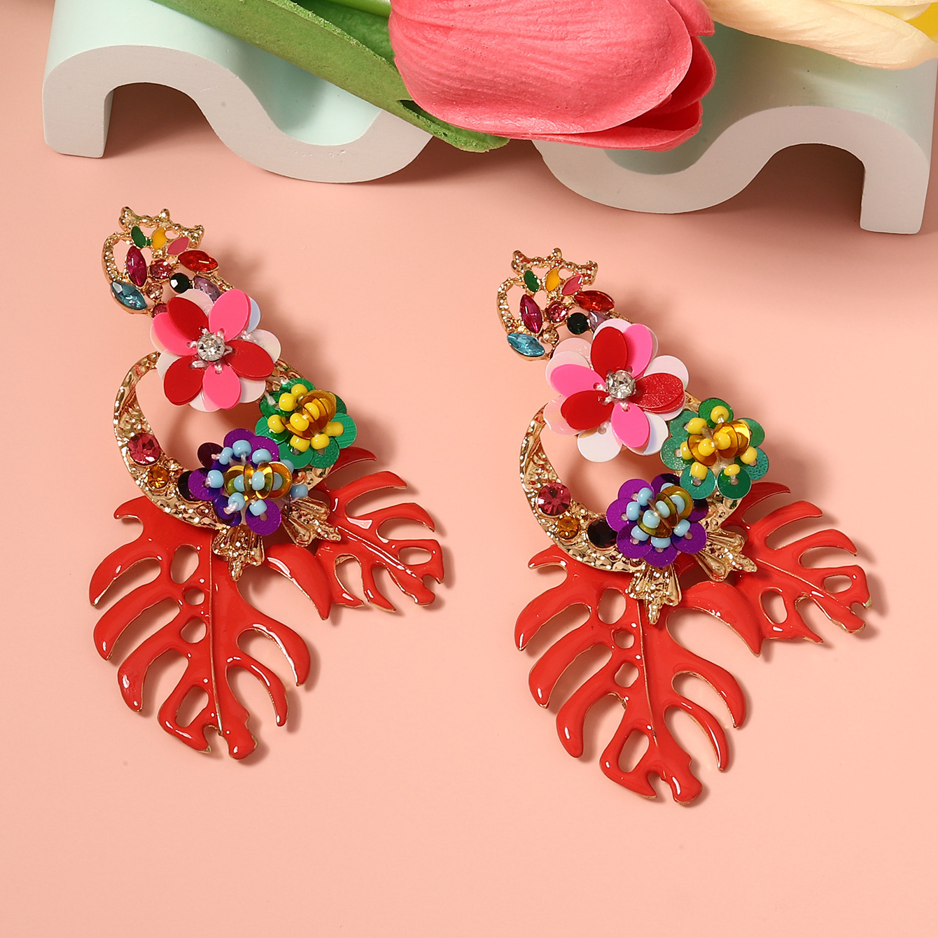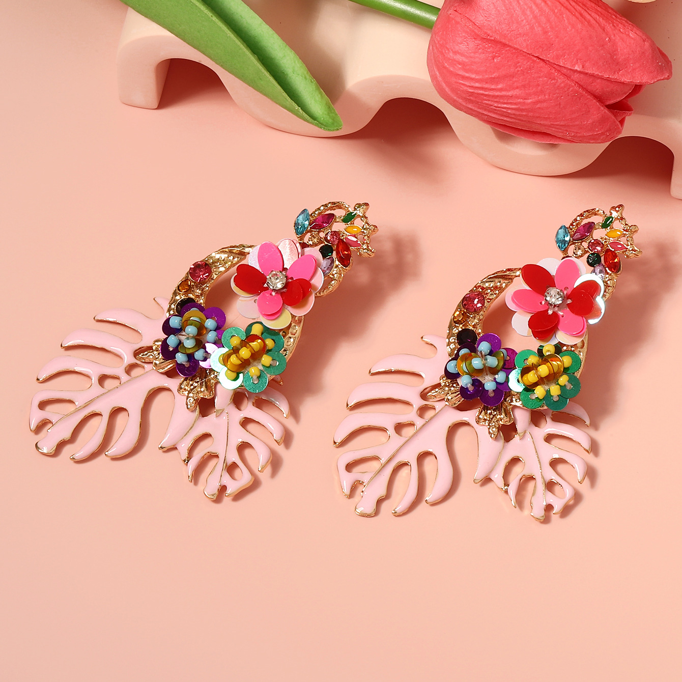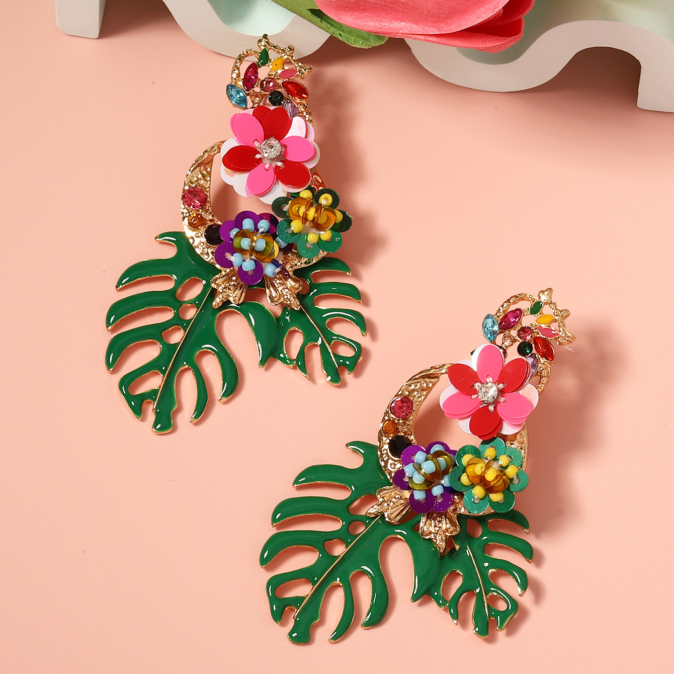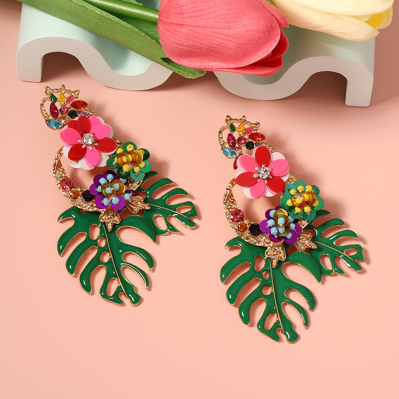 Fashionable Exaggerated Alloy Leaf Earrings With Colorful Rhinestones For Women