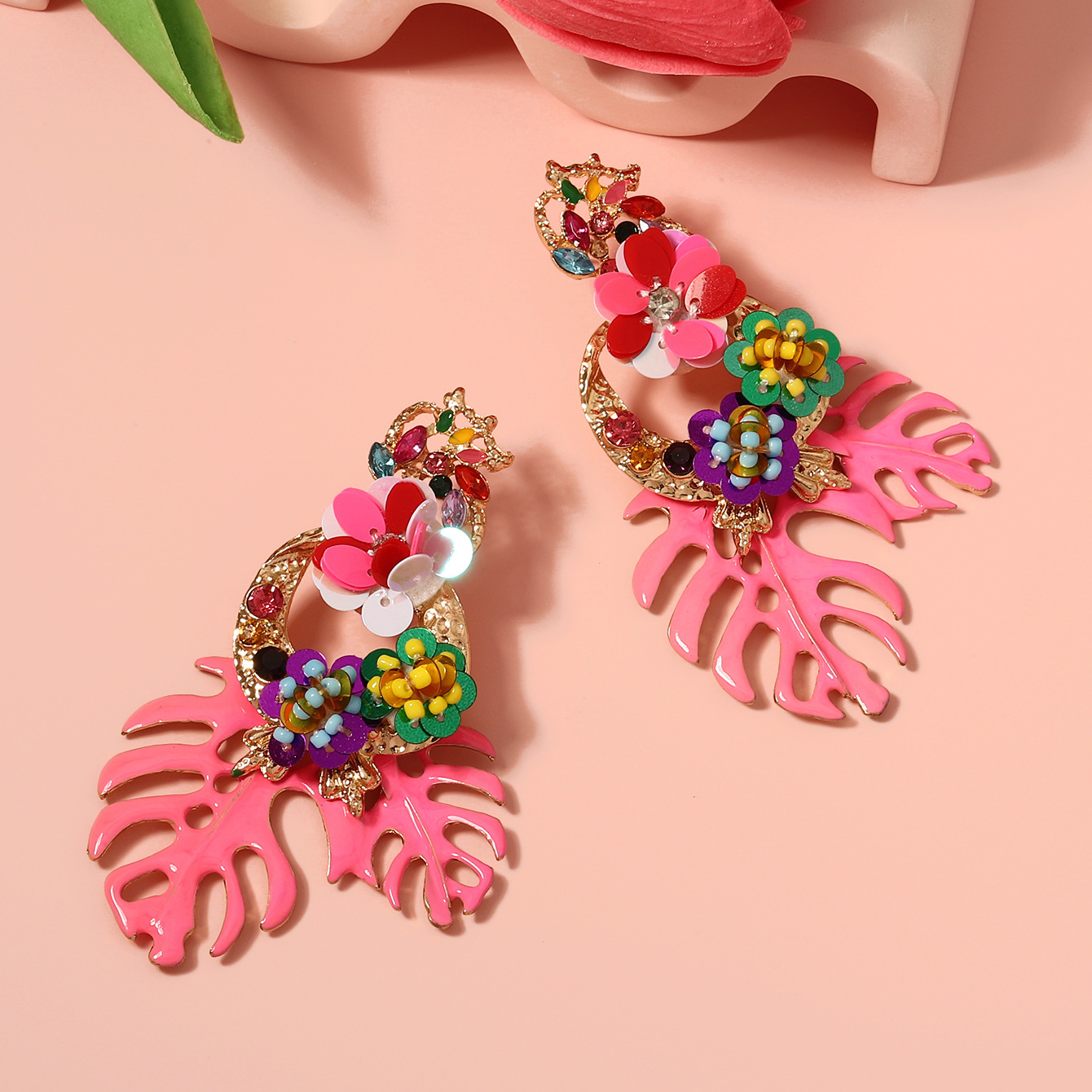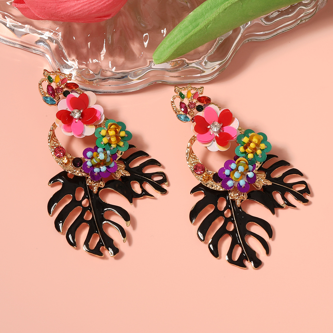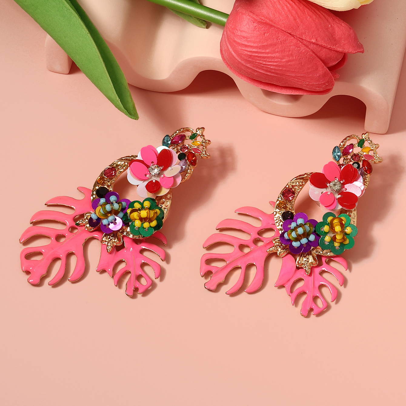 Fashionable Exaggerated Alloy Leaf Earrings With Colorful Rhinestones For Women