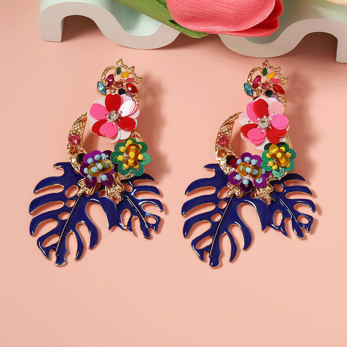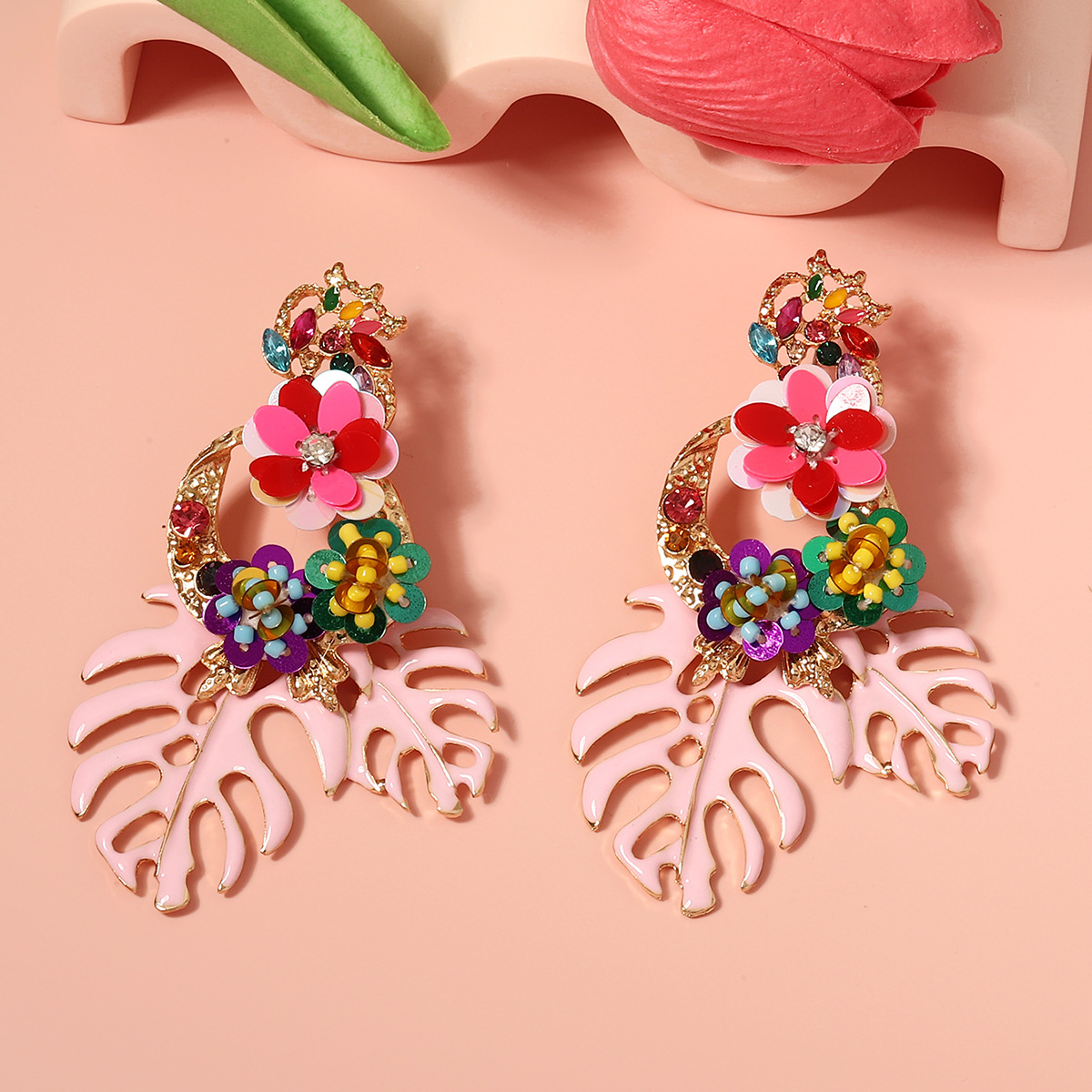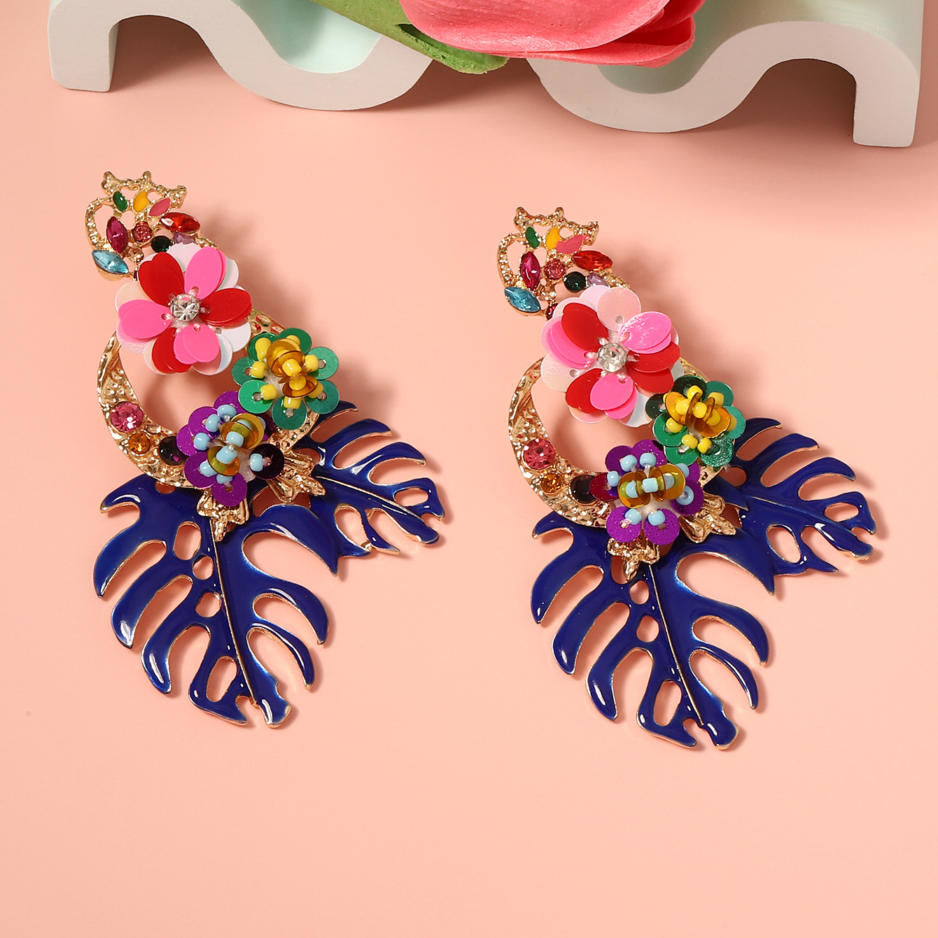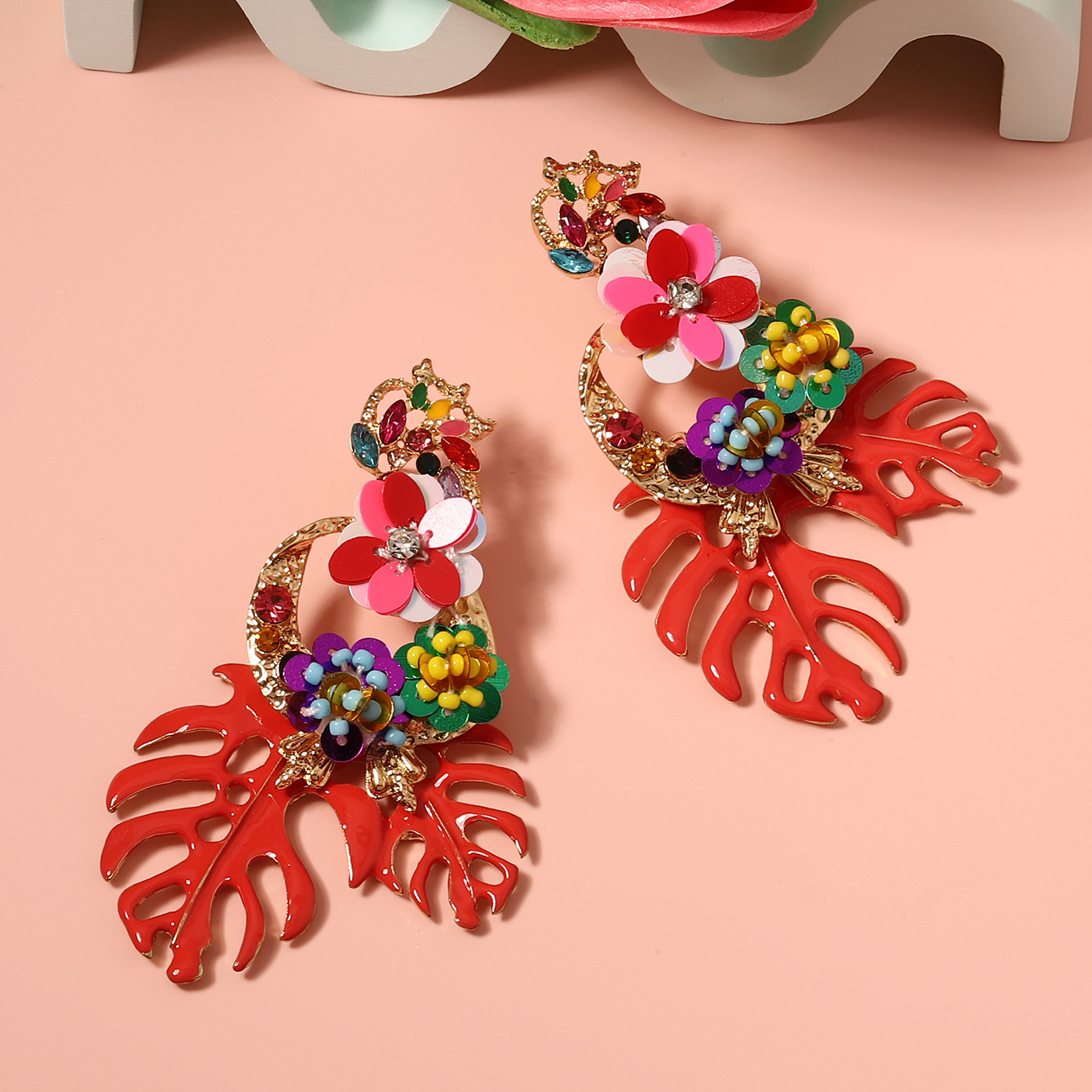 Fashionable Exaggerated Alloy Leaf Earrings With Colorful Rhinestones For Women