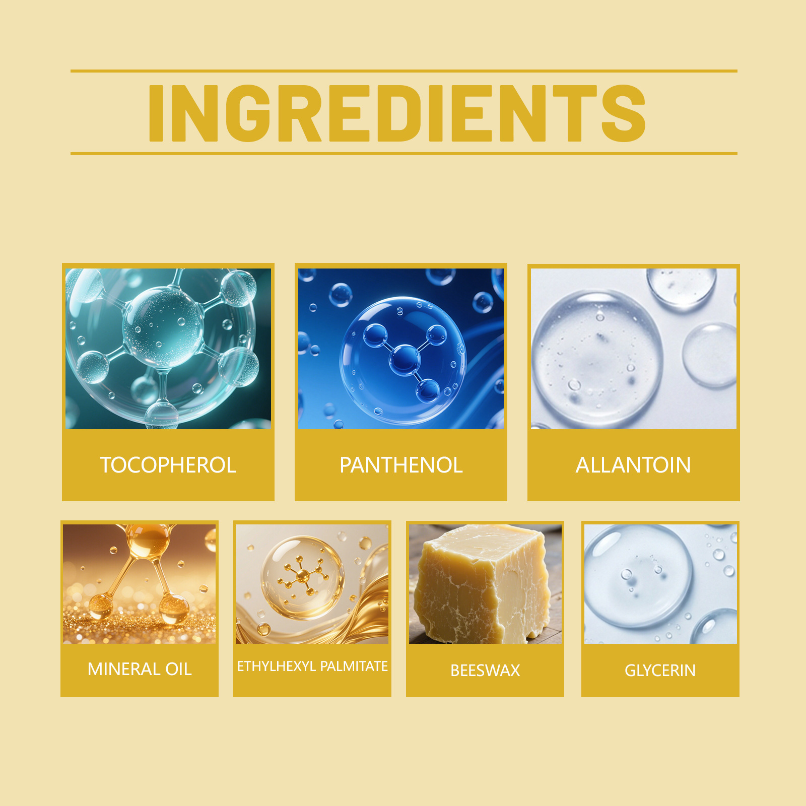 Active ingredients: Tocopherol (Vitamin E), Panthenol, Allantoin