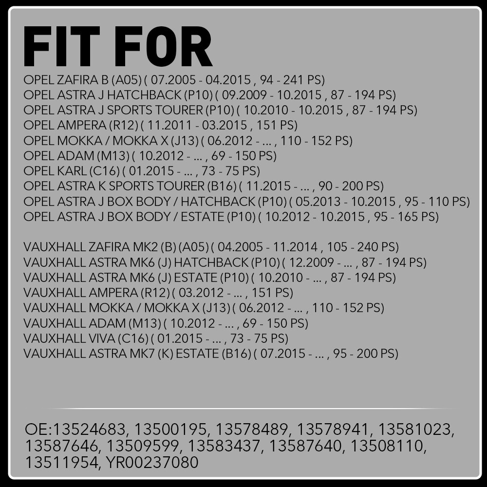 Fit for: OPEL Zafira B (A05) ( 07.2005 - 04.2015 , 94 - 241 PS) OPEL Astra J Hatchback (P10) ( 09.2009 - 10.2015 , 87 - 194 PS) OPEL Astra J Sports Tourer (P10) ( 10.2010 - 10.2015 , 87 - 1...