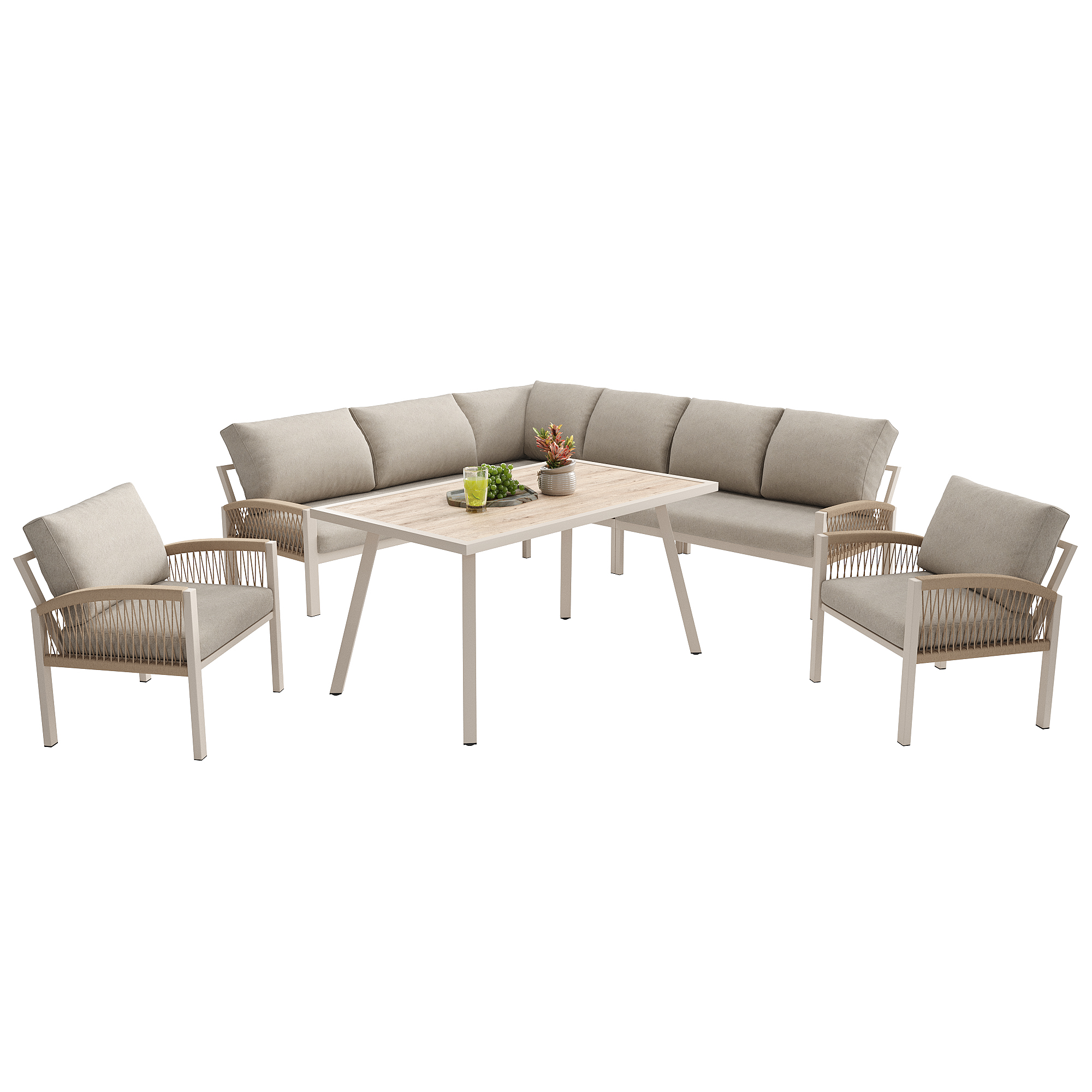 Product Name:Garden Lounge Set, Furniture Set for 8 People, Ropework, Large Table with Wood Grain Finish, Galvanized Iron Frame, Adjustable Legs, All Seat and Back Cushions Included, Beige