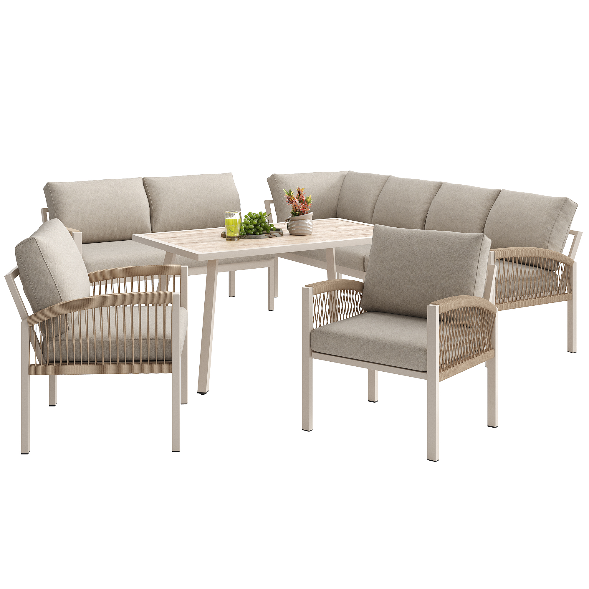 Garden Lounge Set, Furniture Set For 8 People, Ropework, Large Table With Wood Grain Finish, Galvanized Iron Frame, Adjustable Legs, All Seat And Back Cushions Included, Beige