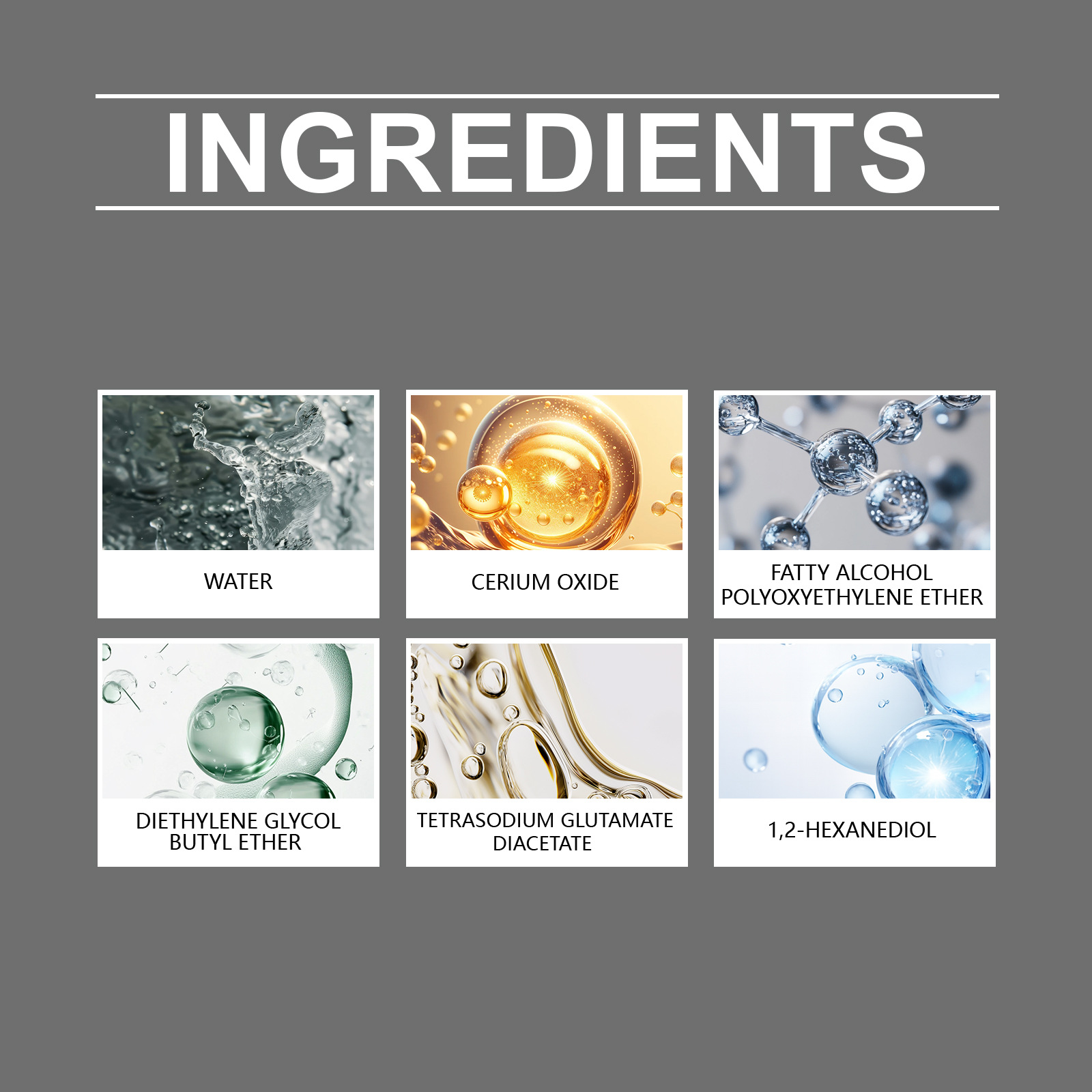 Main ingredients: water, cerium oxide, fatty alcohol polyoxyethylene ether, diethylene glycol butyl ether, tetrasodium glutamate diacetate and 1,2- hexanediol.