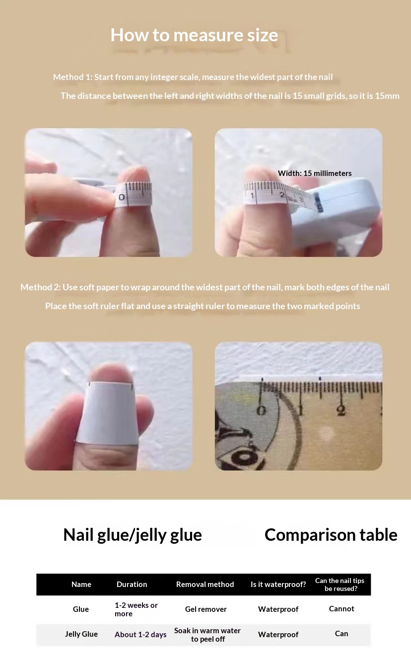 Color Options: XS (ideal for very small hands/tiny builds/very small nail beds), S (standard size/moderate hand size/first-time wearers), M (suitable for fuller hands/larger hands/wide, flat nail beds)