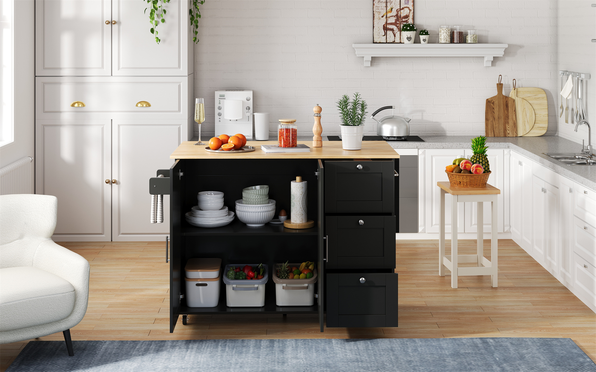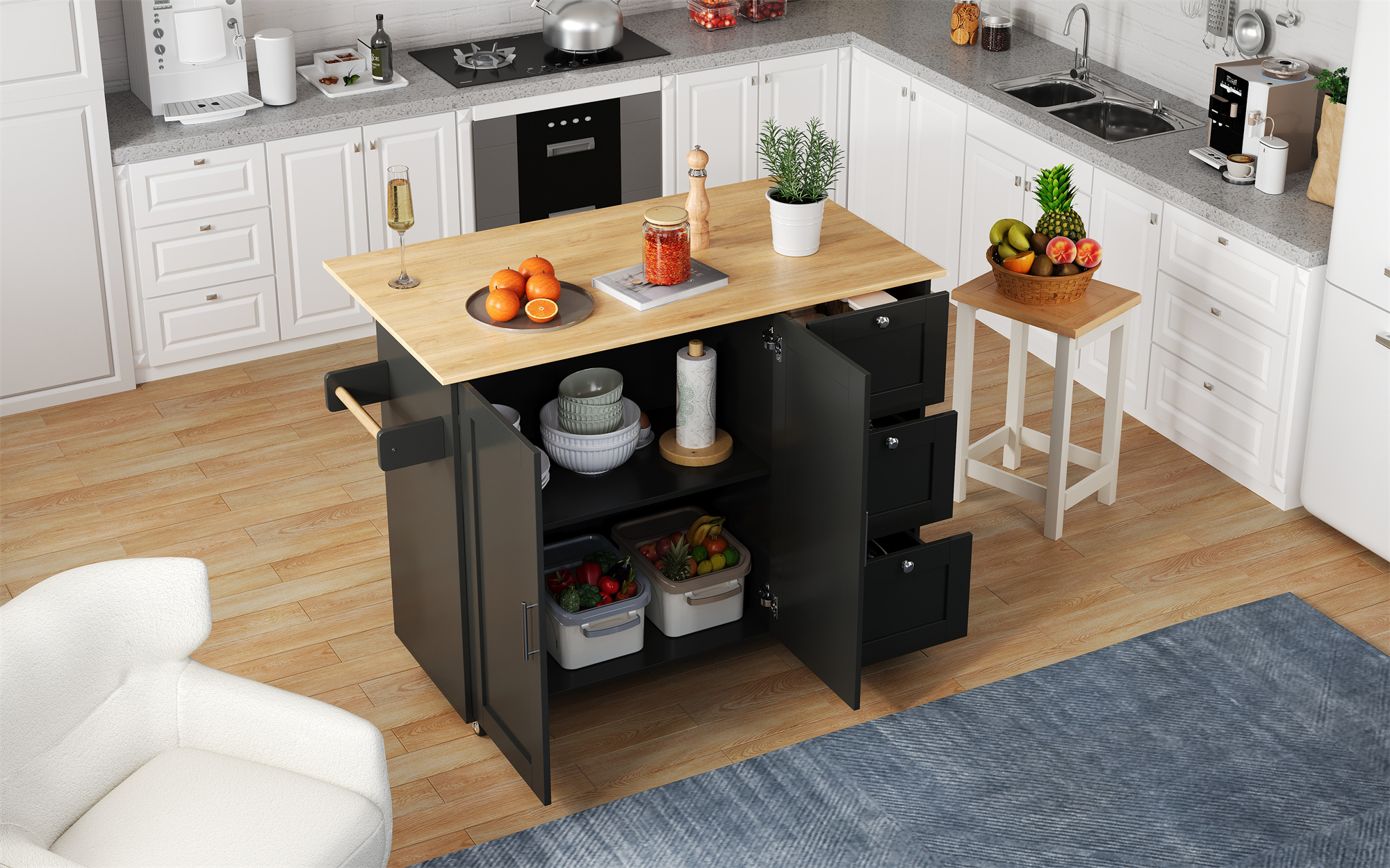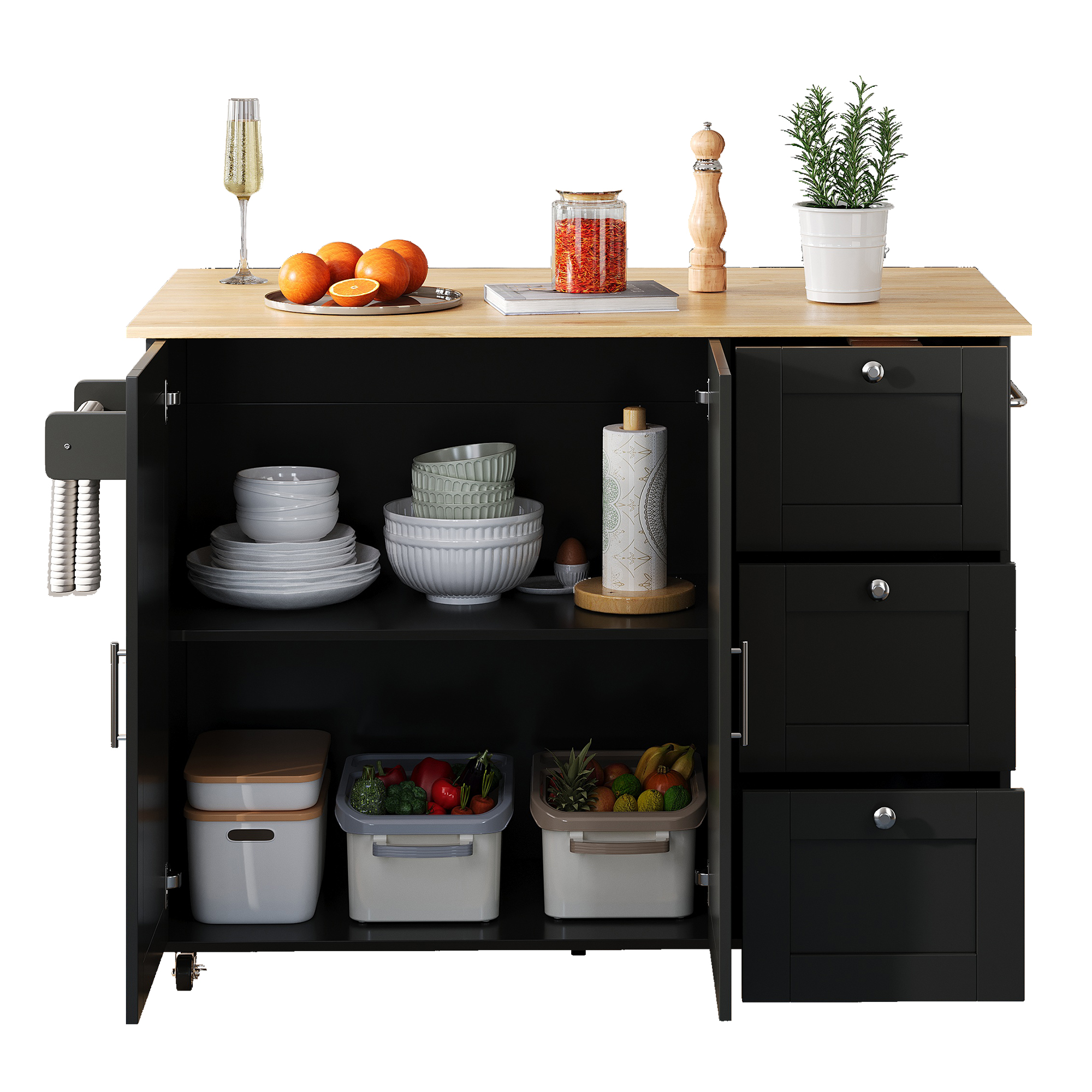 SpecificationProduct InformationProduct Type :Combo ItemProduct Name:Kitchen Island on Wheels, Rolling Storage Trolley with Foldable Tabletop, 3 Drawers, 2 Doors, Lockable Swivel Wheels, Towel Rack –...