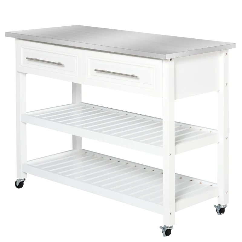 Kitchen Island With Stainless Steel Top, Traditional Kitchen Island With Storage, Butcher Block Cart 2-Tier Open Shelves, Drawers, White