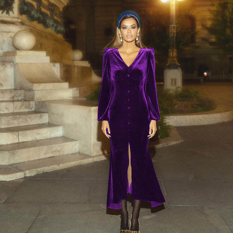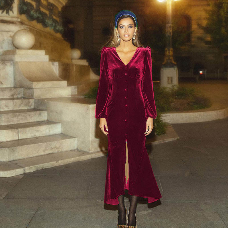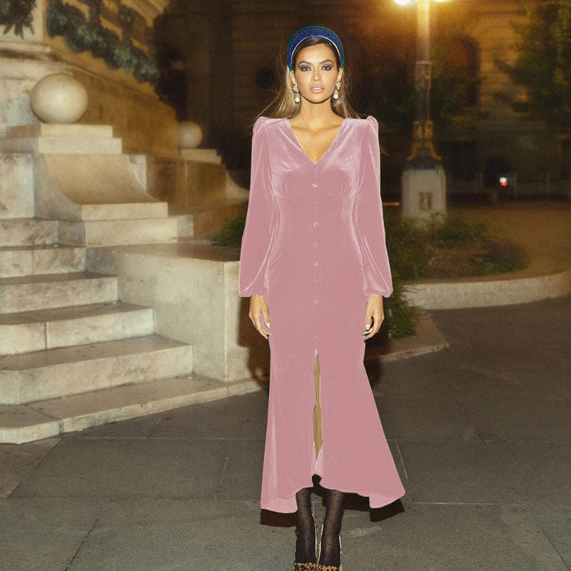 Knitted V-neck Padded-shoulder Long-sleeve Dress