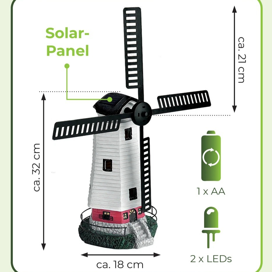 -This is an LED solar windmill light designed for outdoor use. It is a unique solar light for the garden, featuring automatic on/off functionality, with a height of approximately 53 cm.
