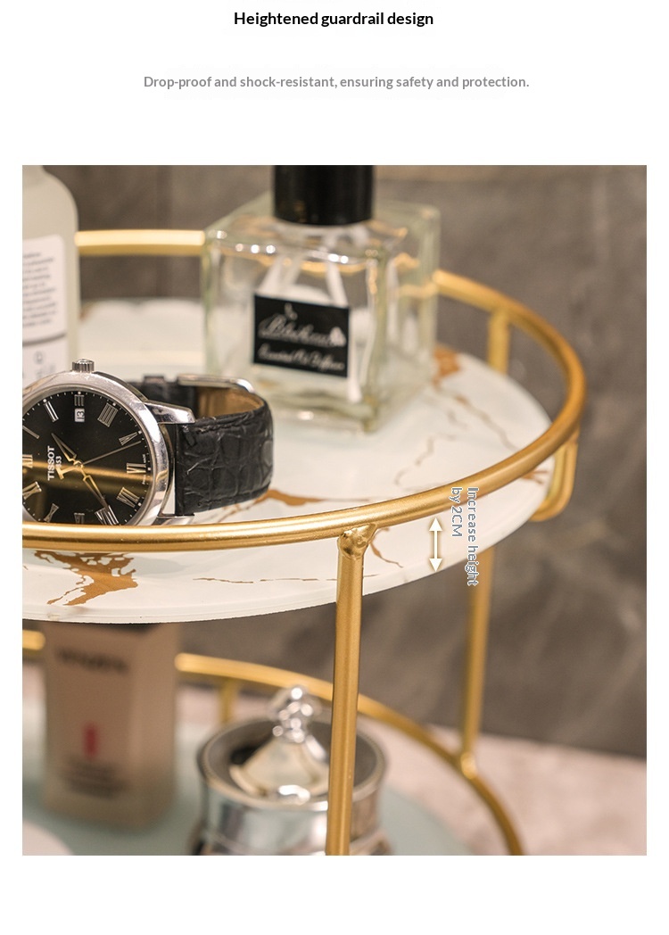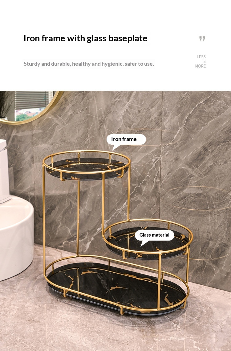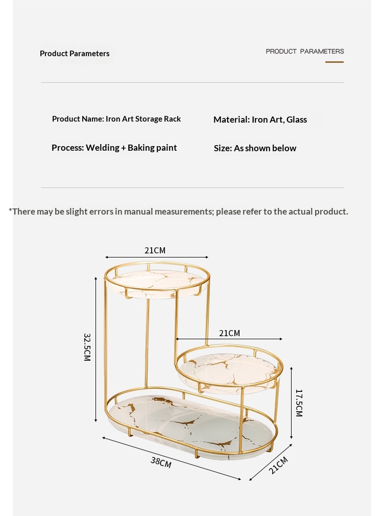 Product information:Number of floors: 3 Shape: Oval Material: Glass, iron Dimensions: Three-tiered round tray with gold patterns on a white base; three-tiered round tray with gold patterns on a black...