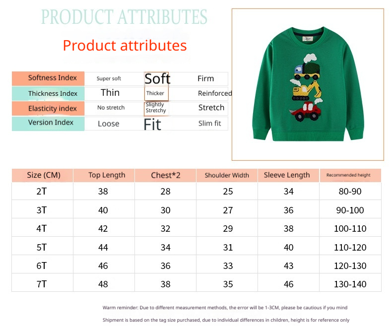 Recommended Height: 2T—80–90 cm; 3T—90–95 cm; 4T—95–100 cm; 5T—100–110 cm; 6T—110–120 cm; 7T—120–130 cm