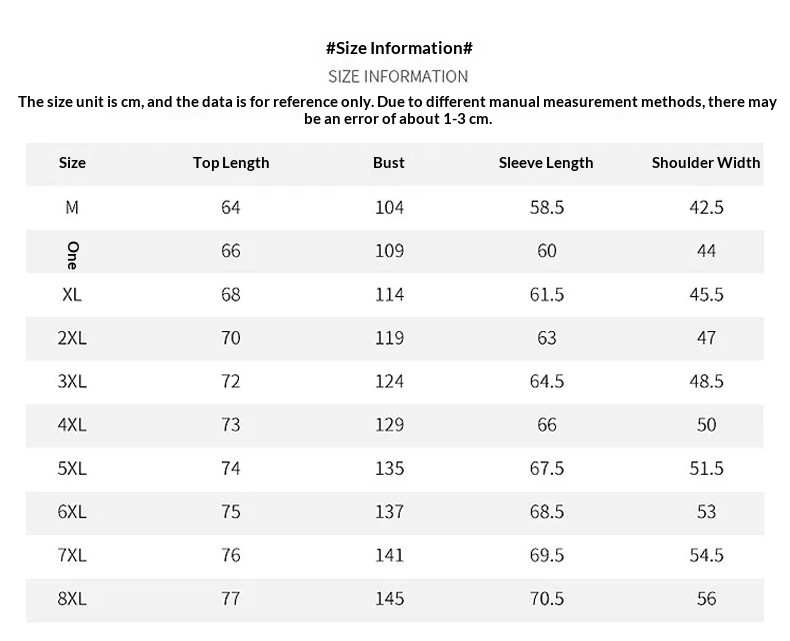 Sizes: M, L, XL, 2XL, 3XL, 4XL, 5XL, 6XL, 7XL, 8XL