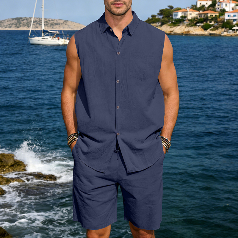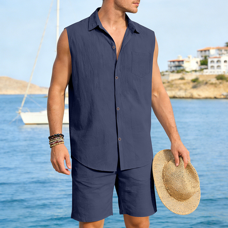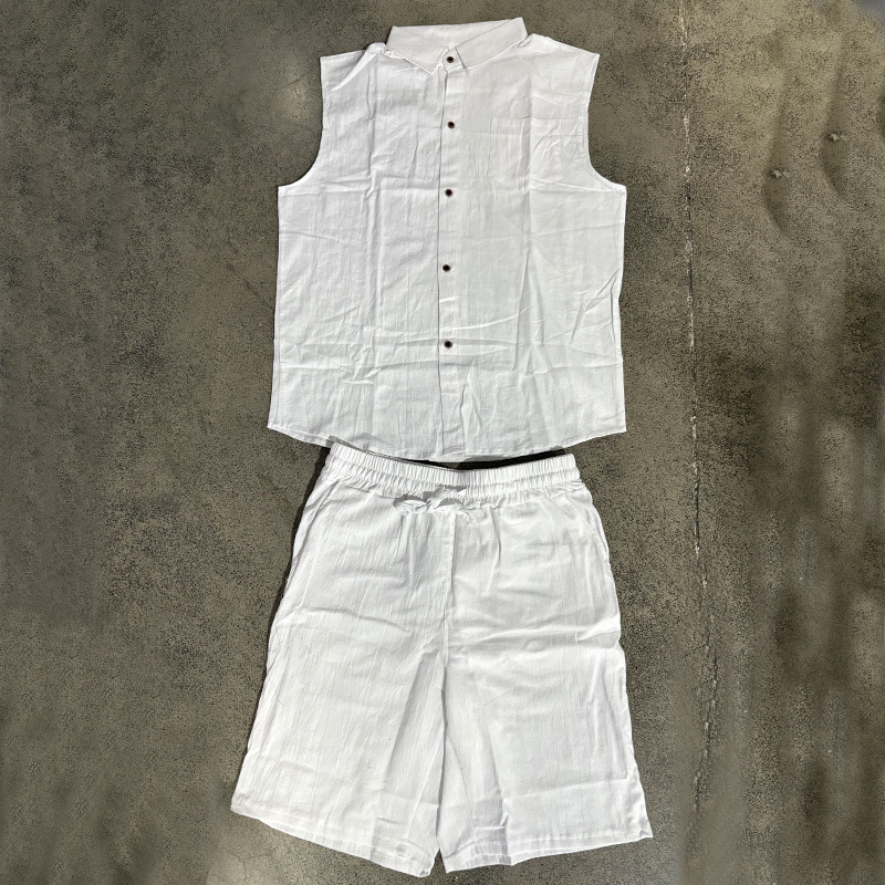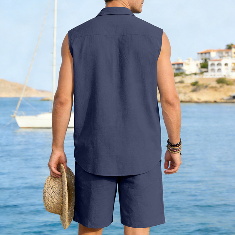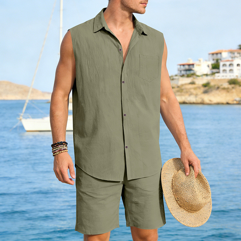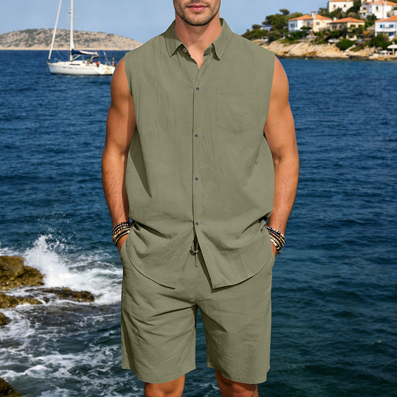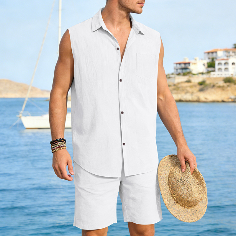 Mens Linen Sleeveless Shirt And Shorts Set