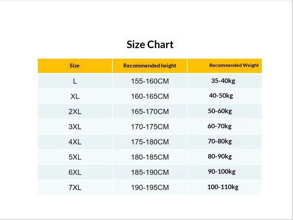 Sizes: L, XL, 2XL, 3XL, 4XL, 5XL, 6XL, 7XL