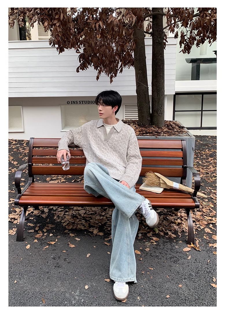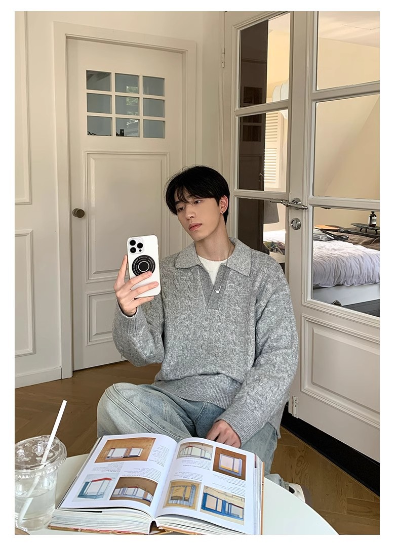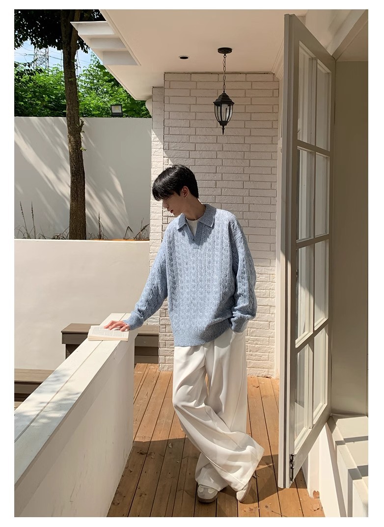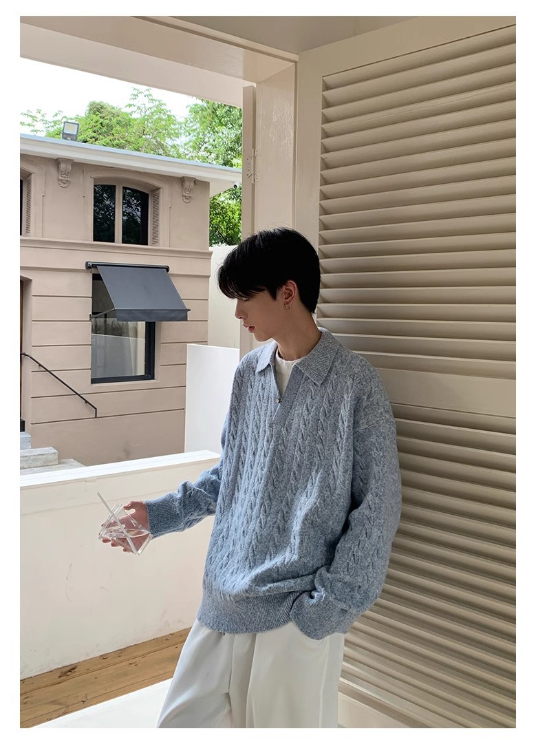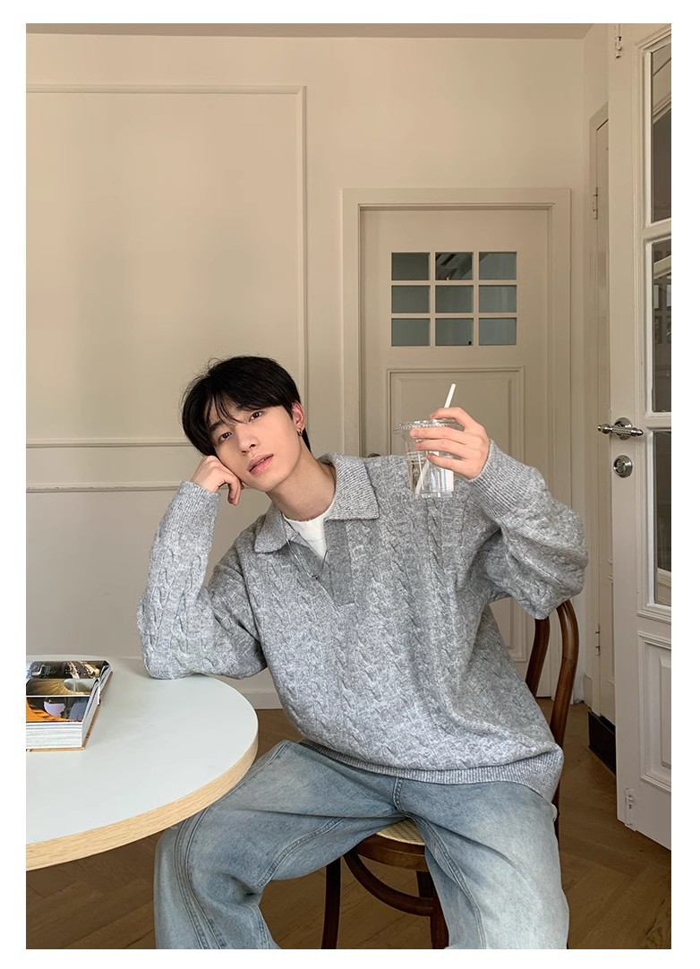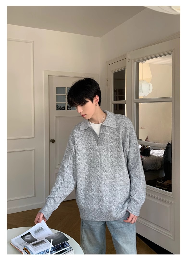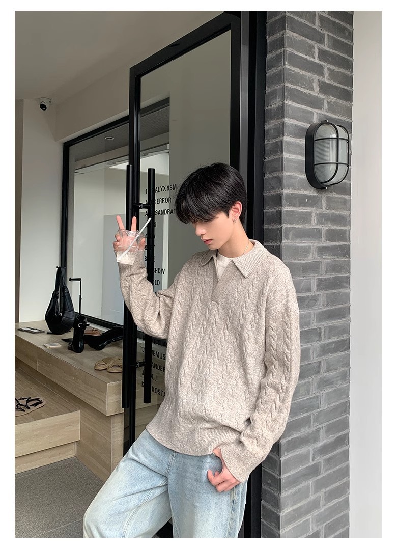 Mens Retro Herringbone Textured Lapel Pullover Sweater