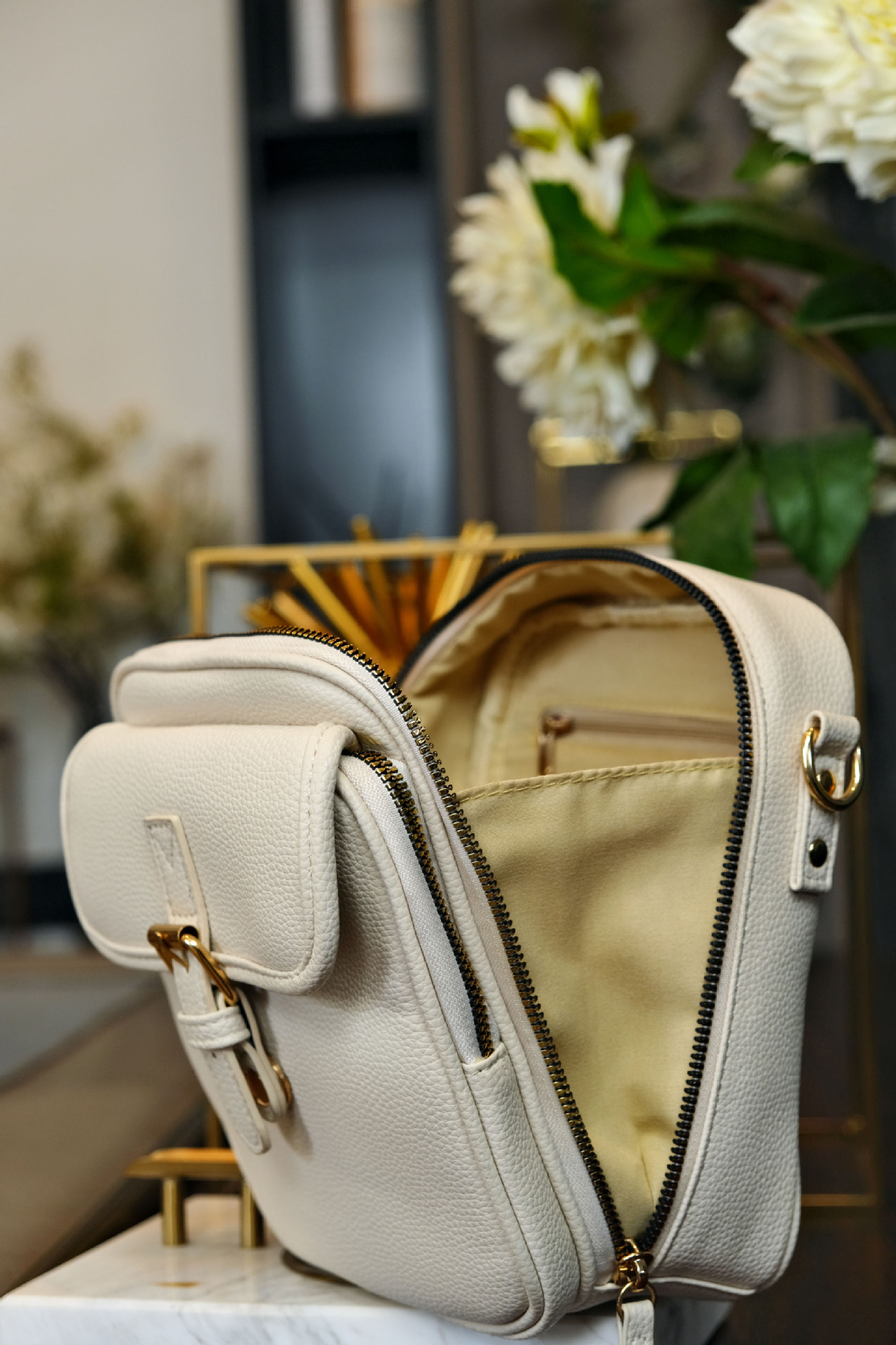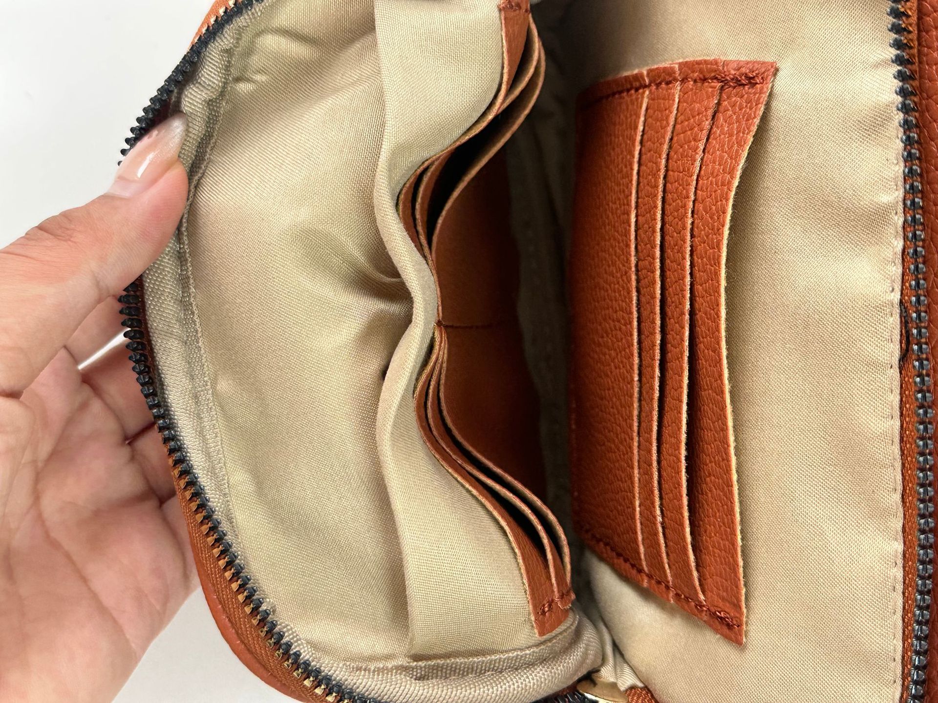Internal bag structure: zippered hidden pocket, phone pocket, compartment with zippered pocket