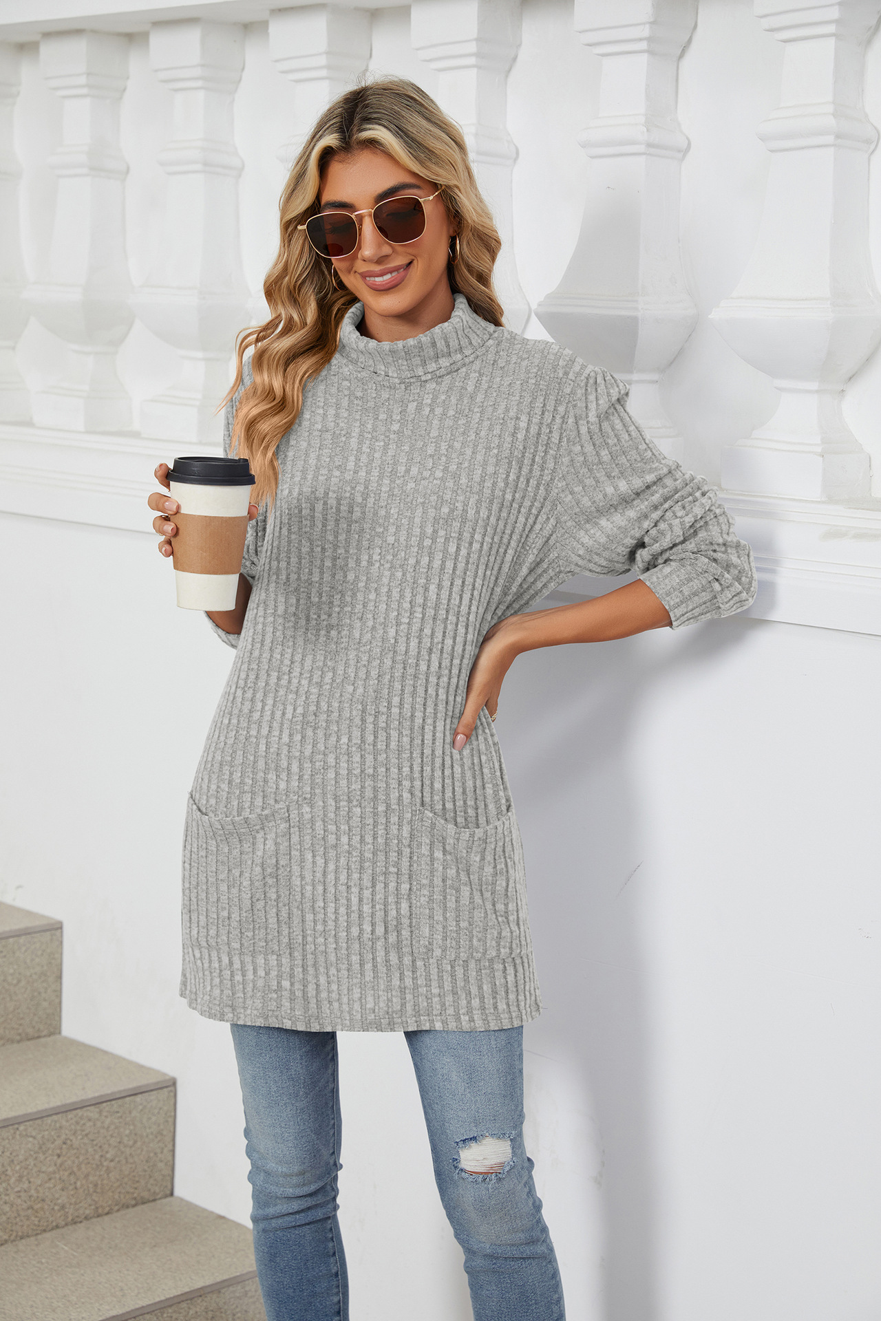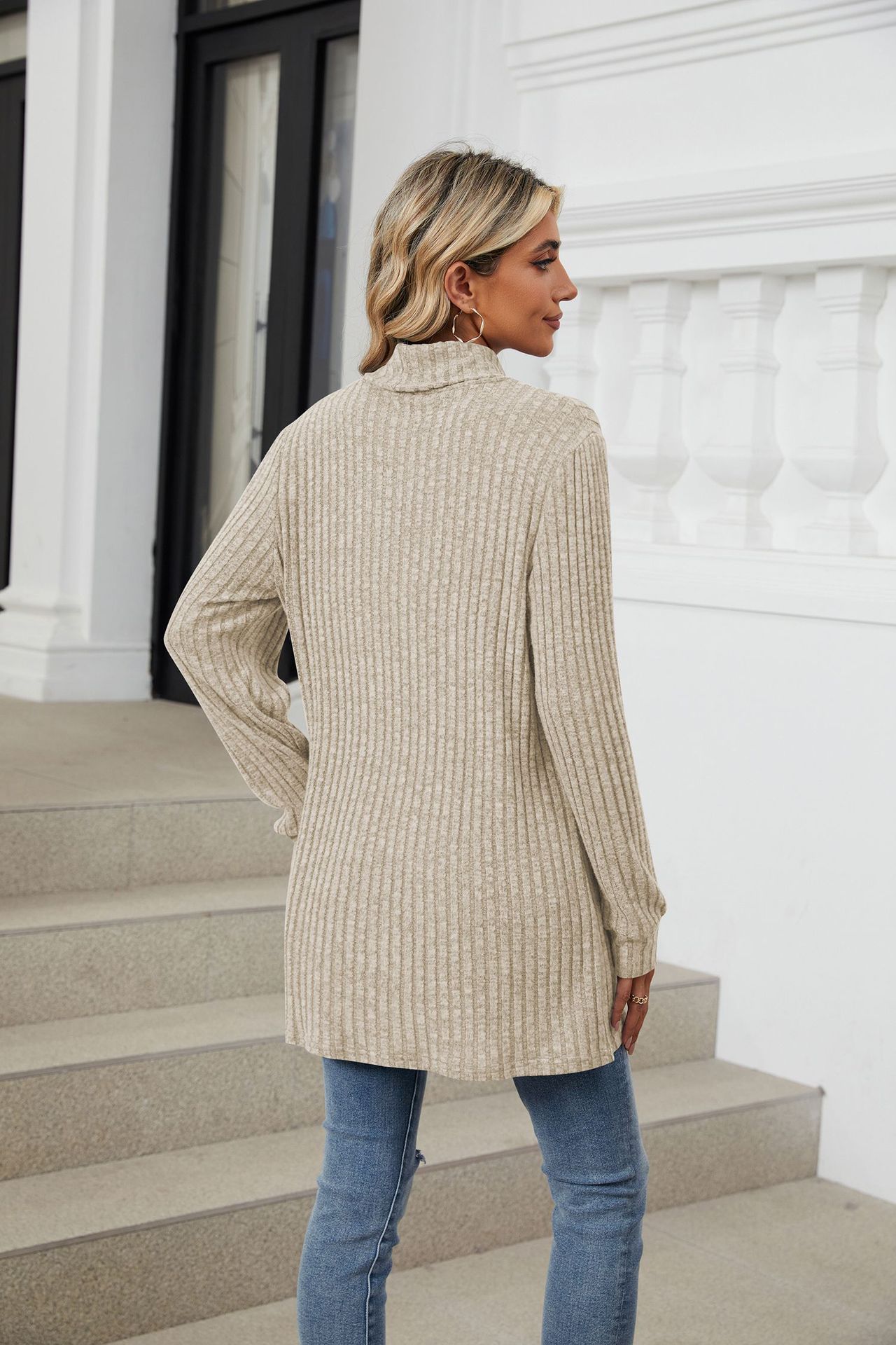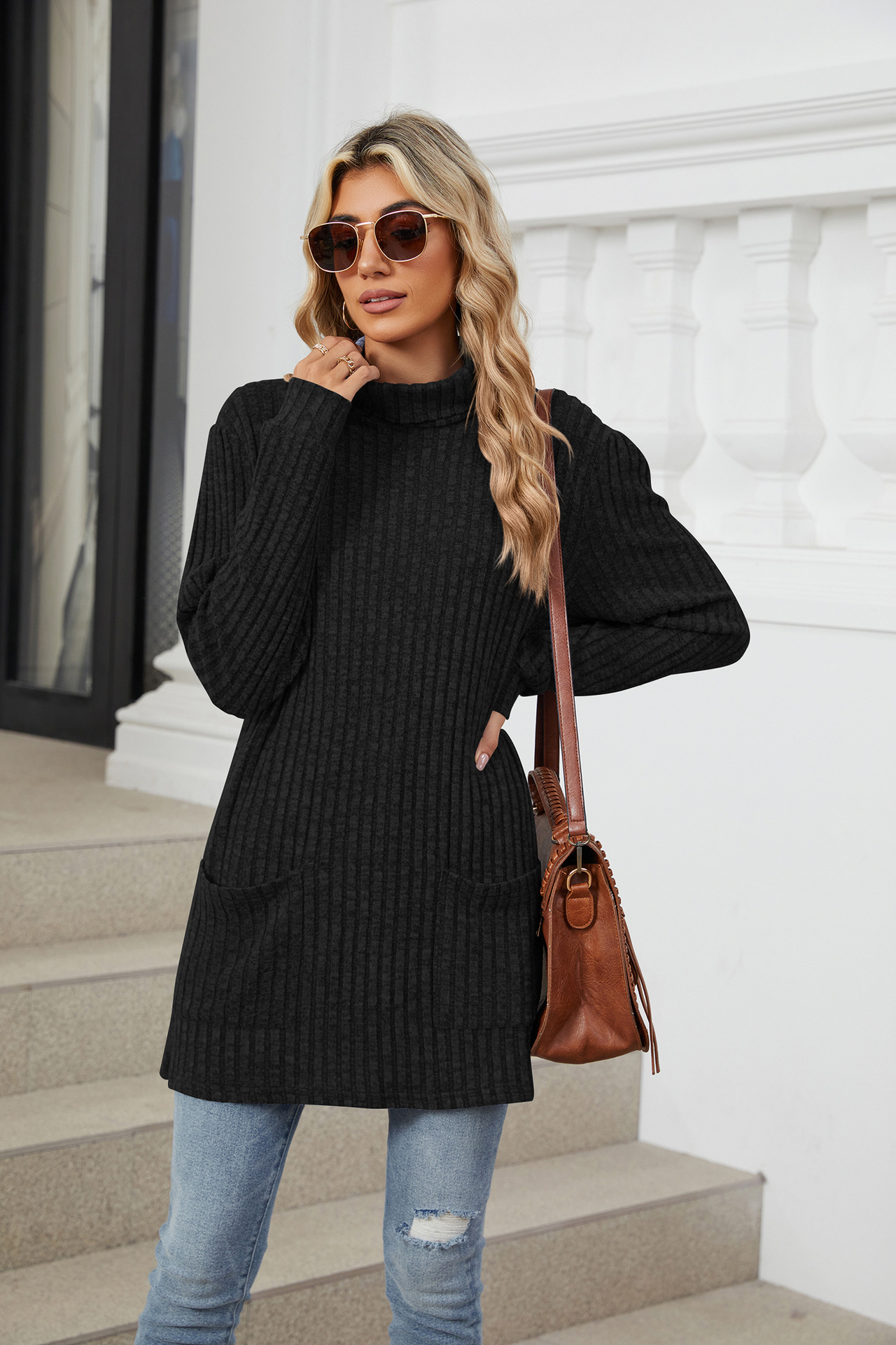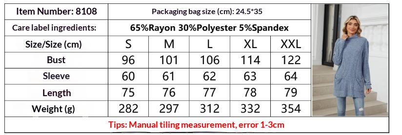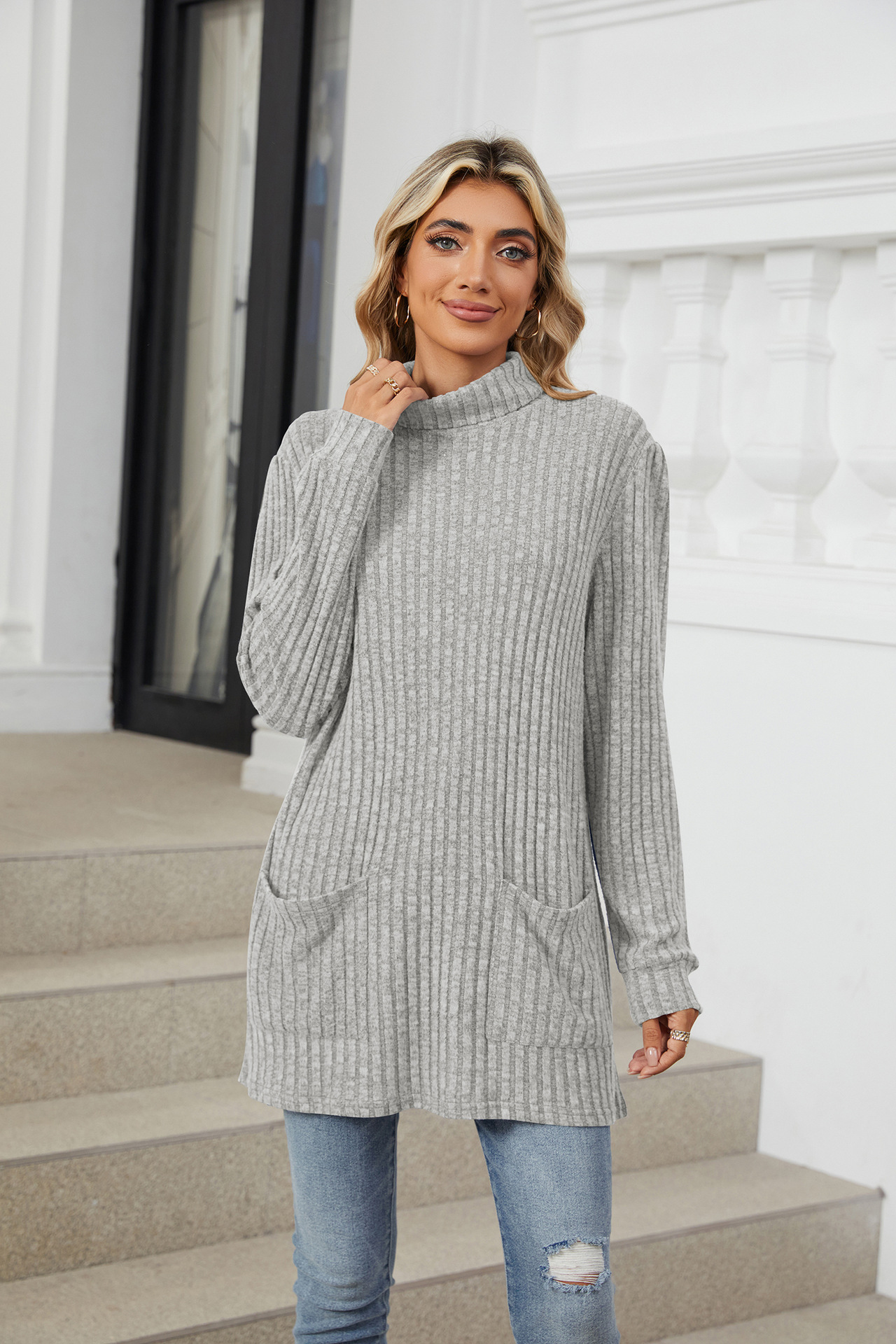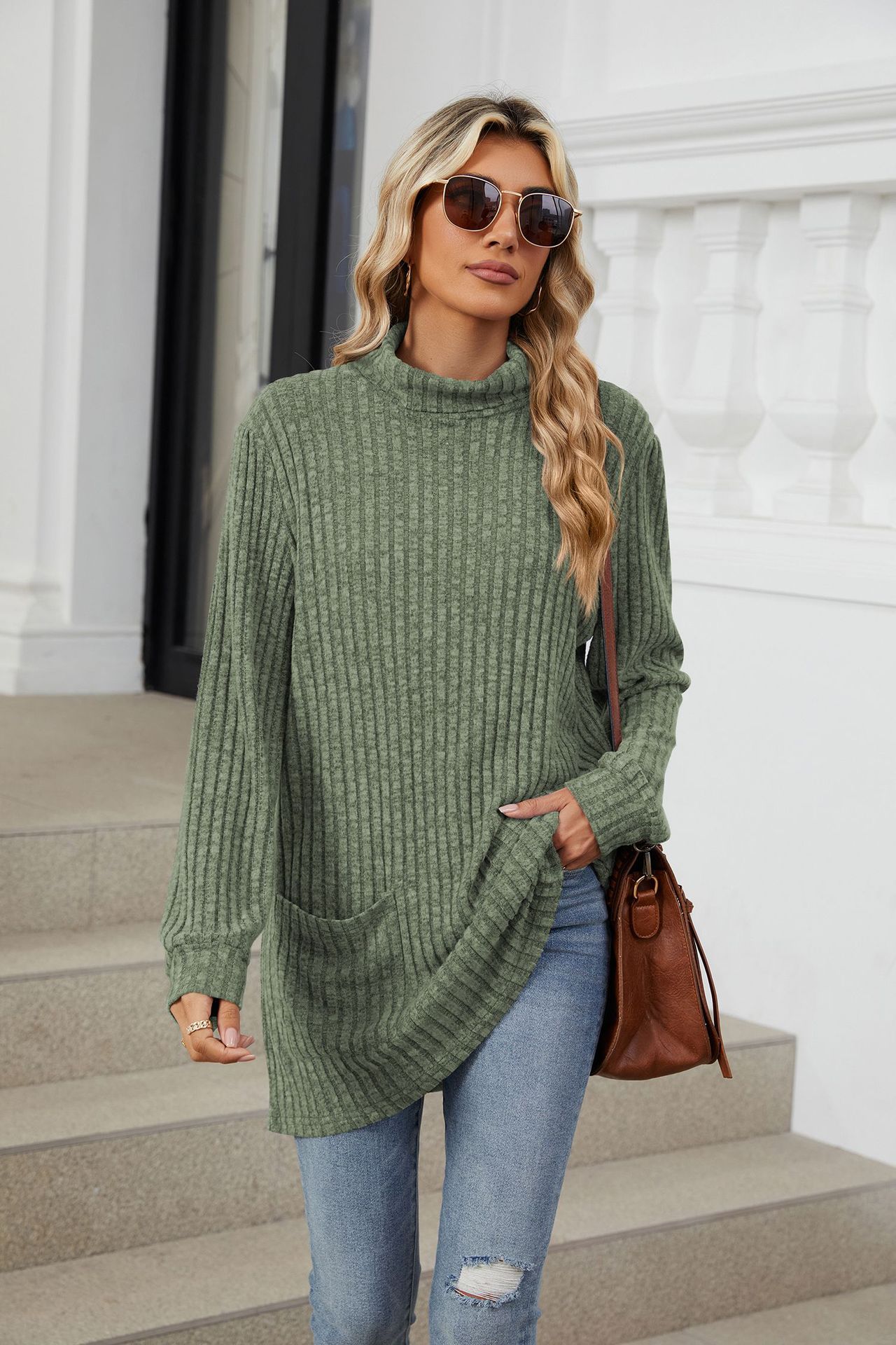 Mock-neck Long-sleeve Casual Womens Top With Pockets