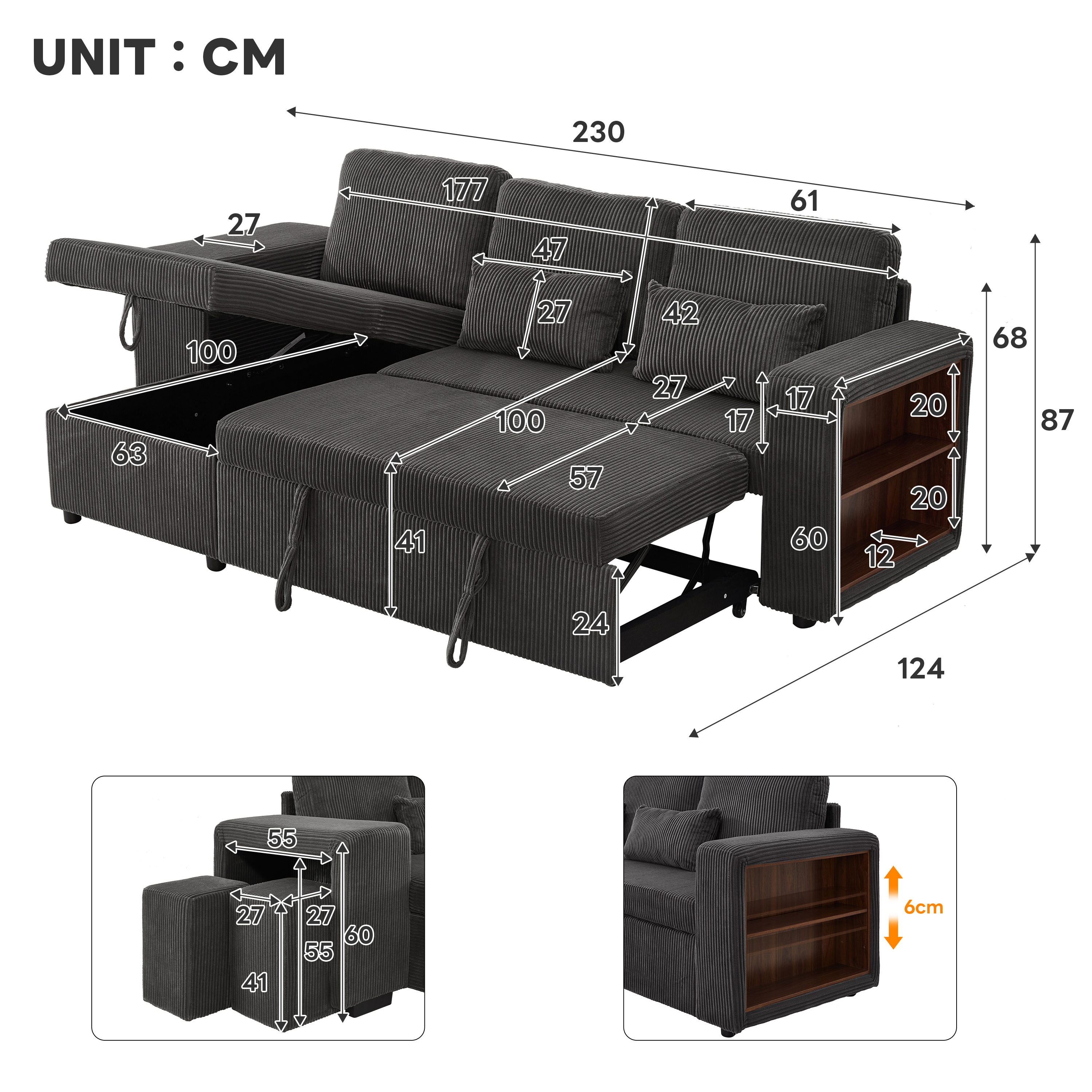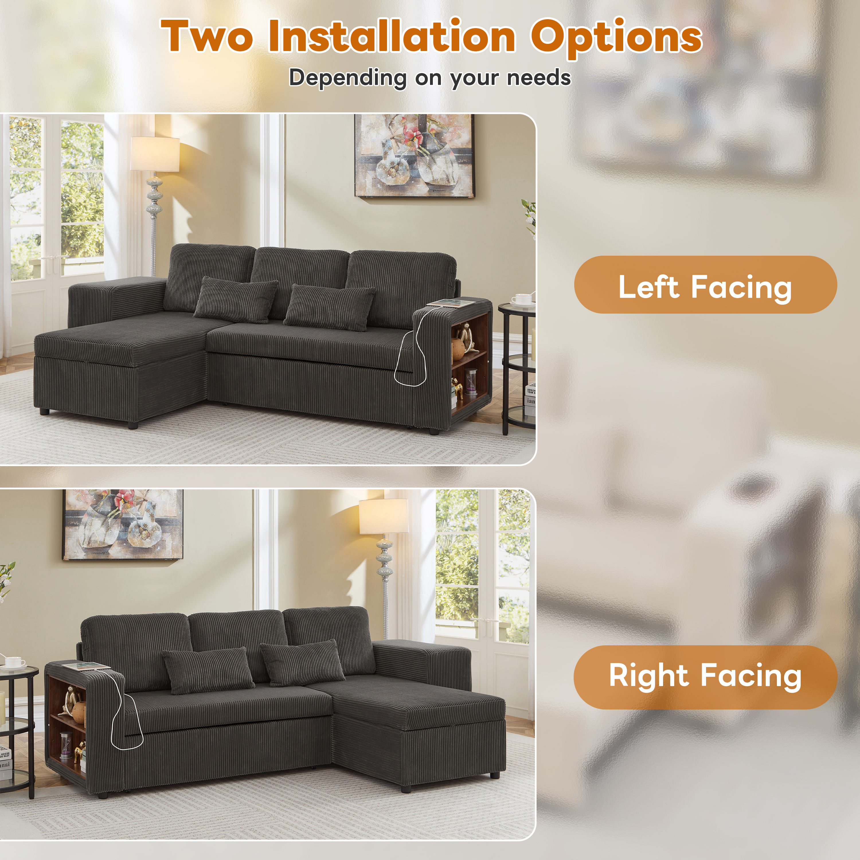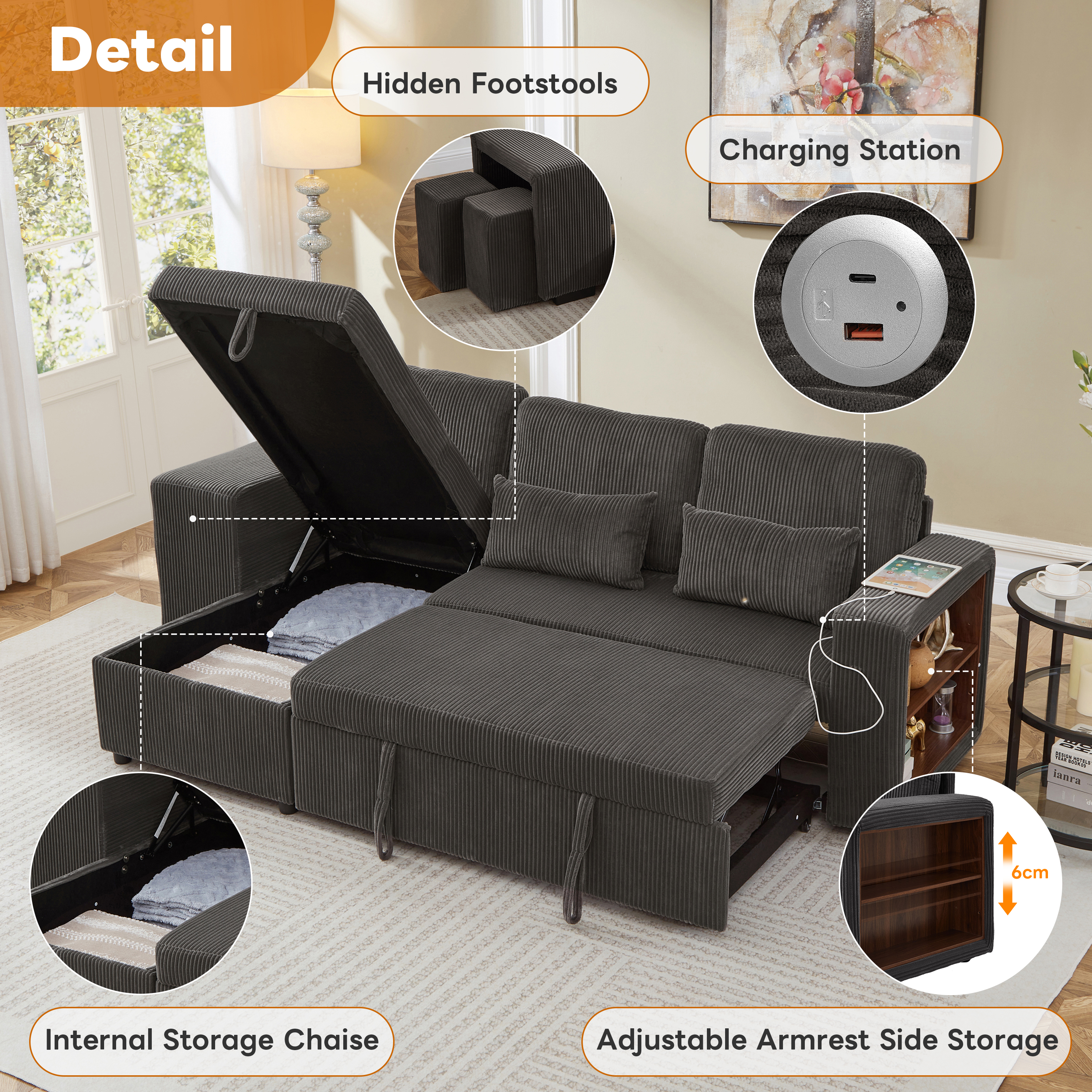 | Special Features | Reversible chaise & Storage spaces & Charging station & Adjustable armrest storage & Soft corduroy fabric & Comfortable pillows |