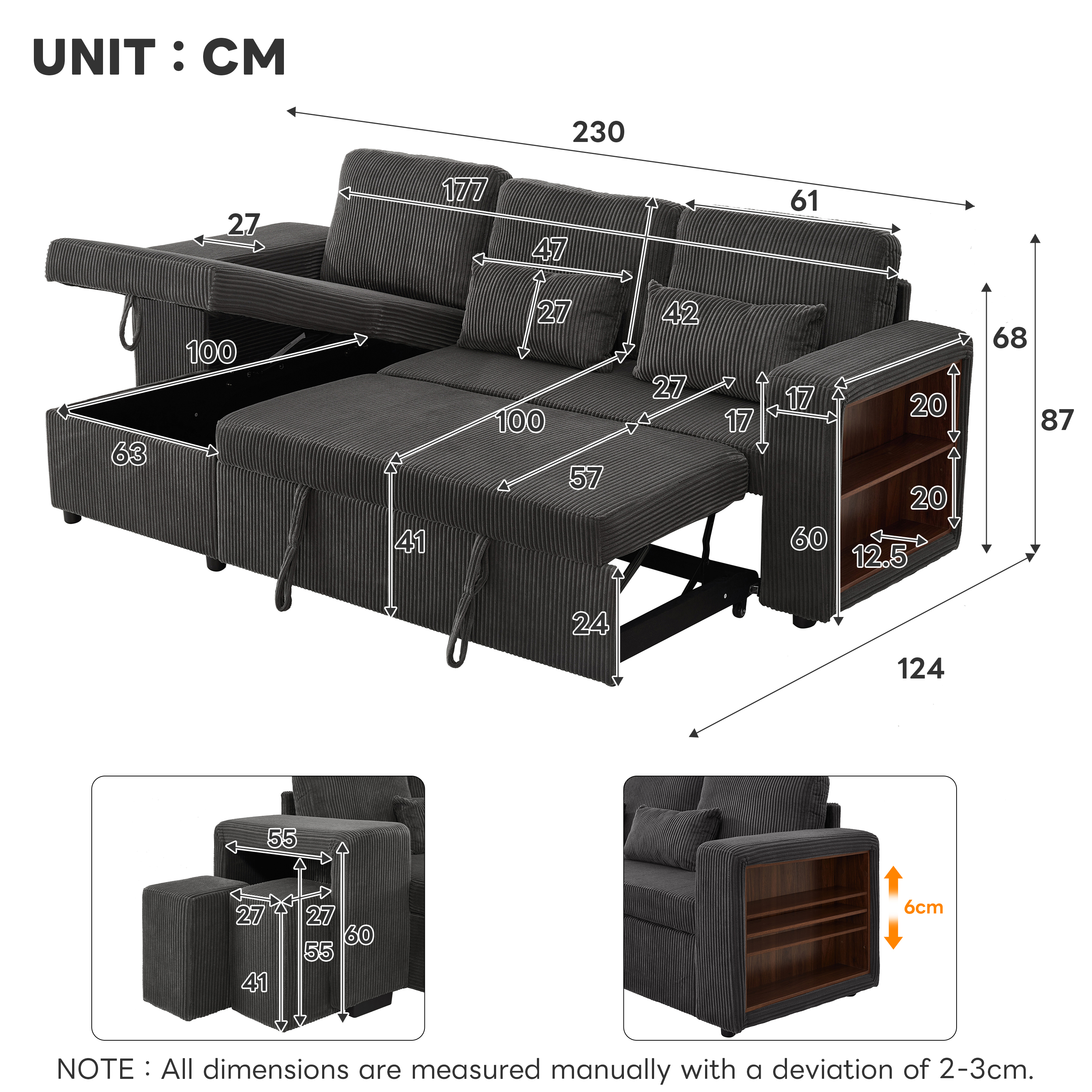 - [Adjustable Armrest Side Storage] Maximise your organization with the adjustable armrest side storage shelving, featuring a 6cm vertical adjustment range to perfectly accommodate items of various sizes. This multi-tier unit is perfect for storing remotes, magazines, and home decor, keeping your lounge essentials neatly organized.