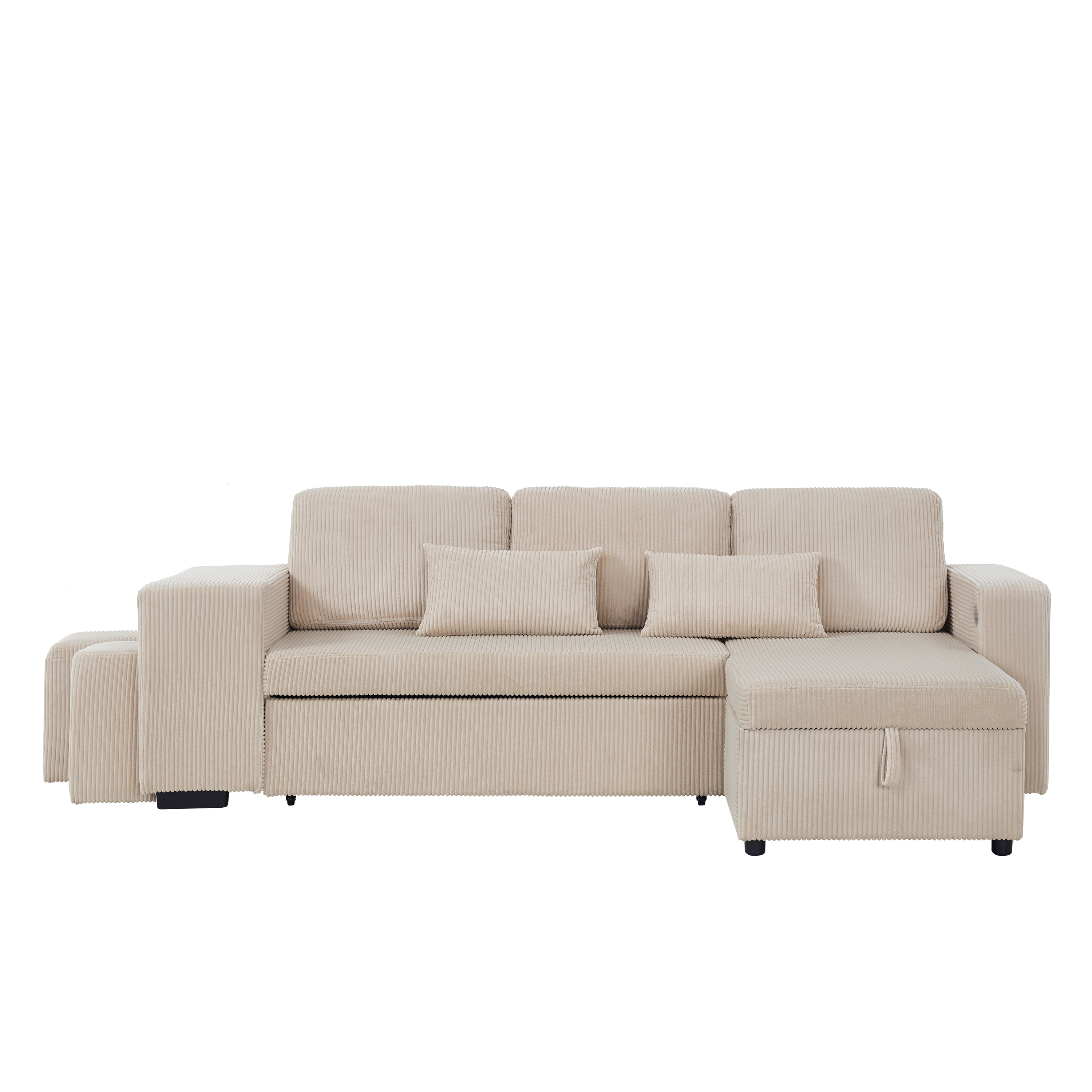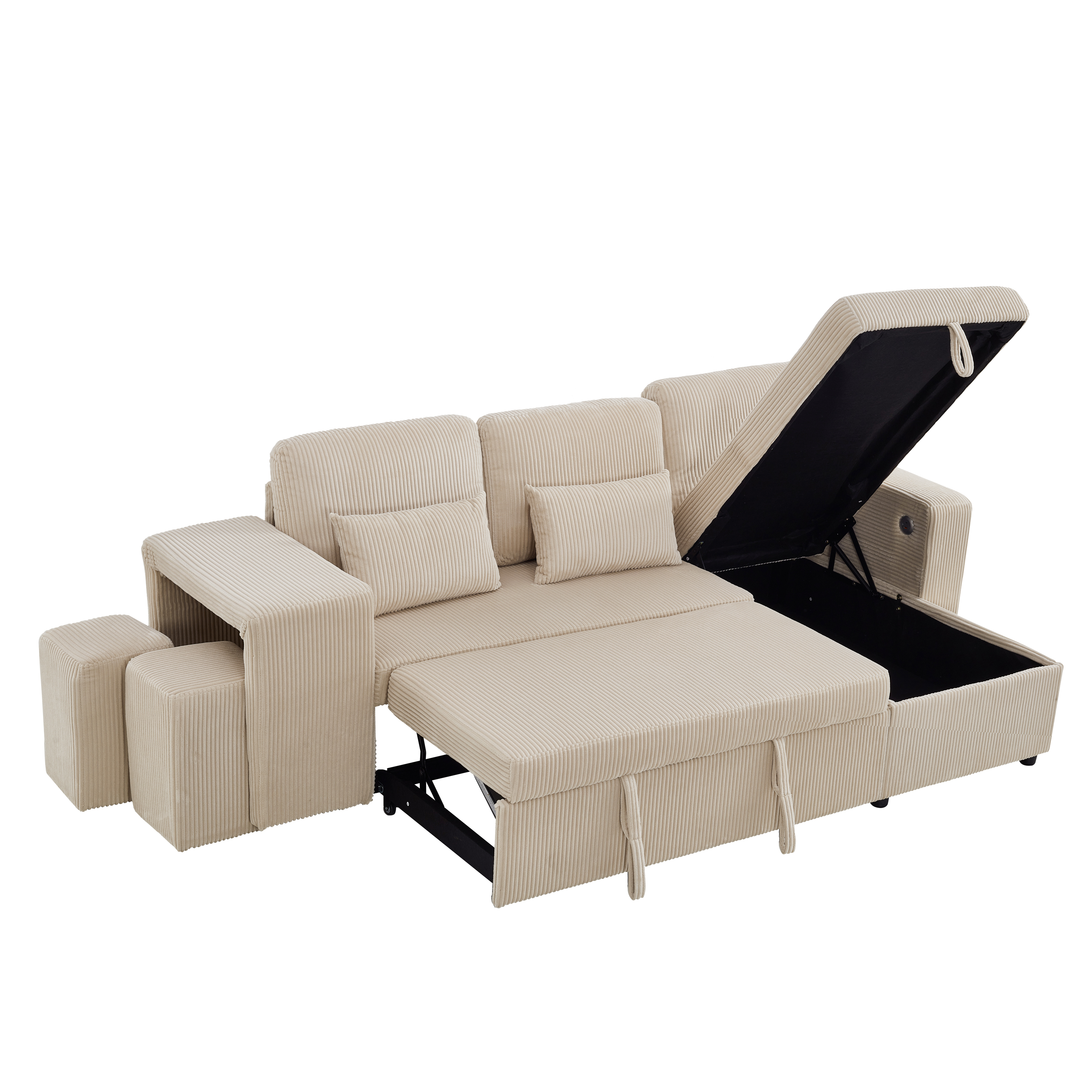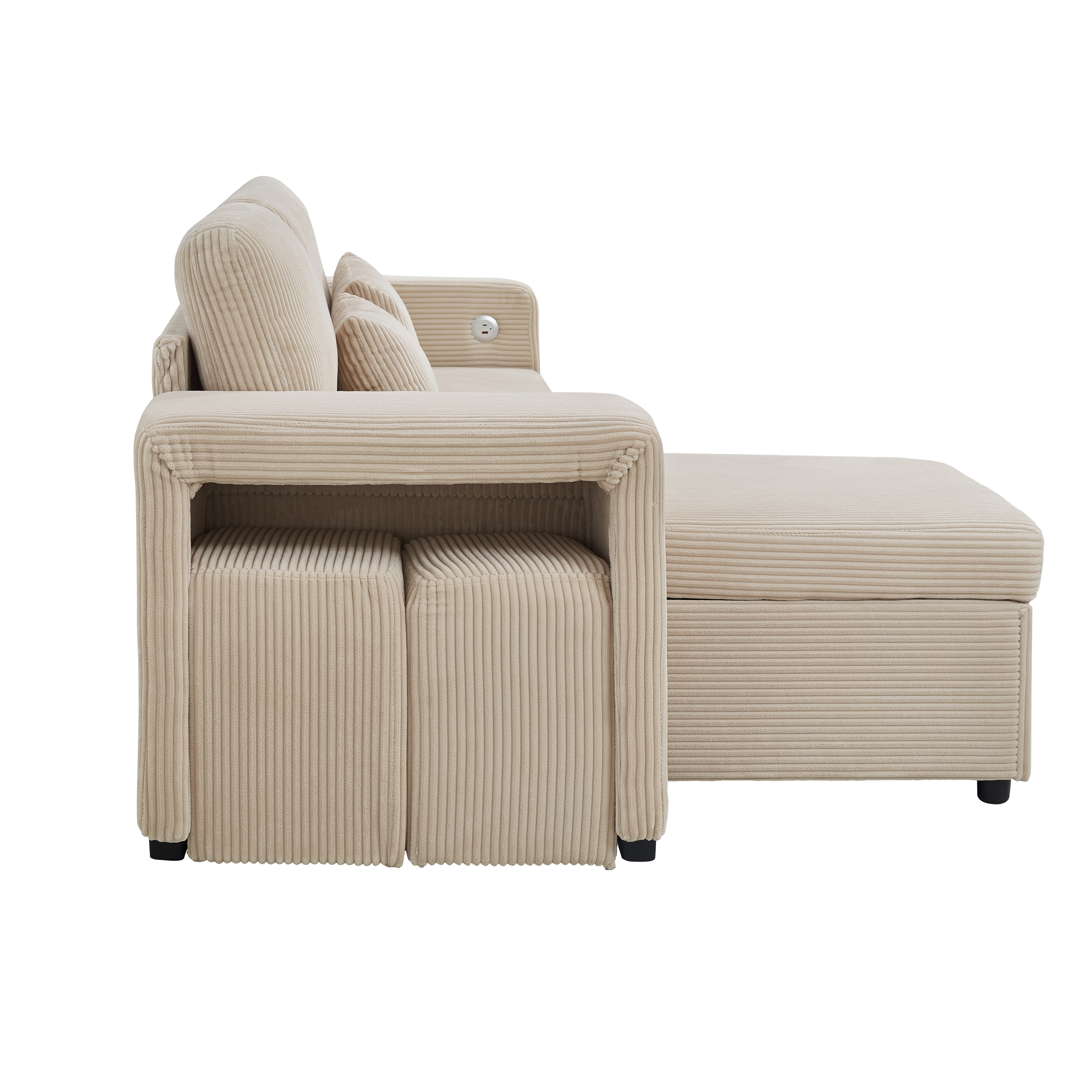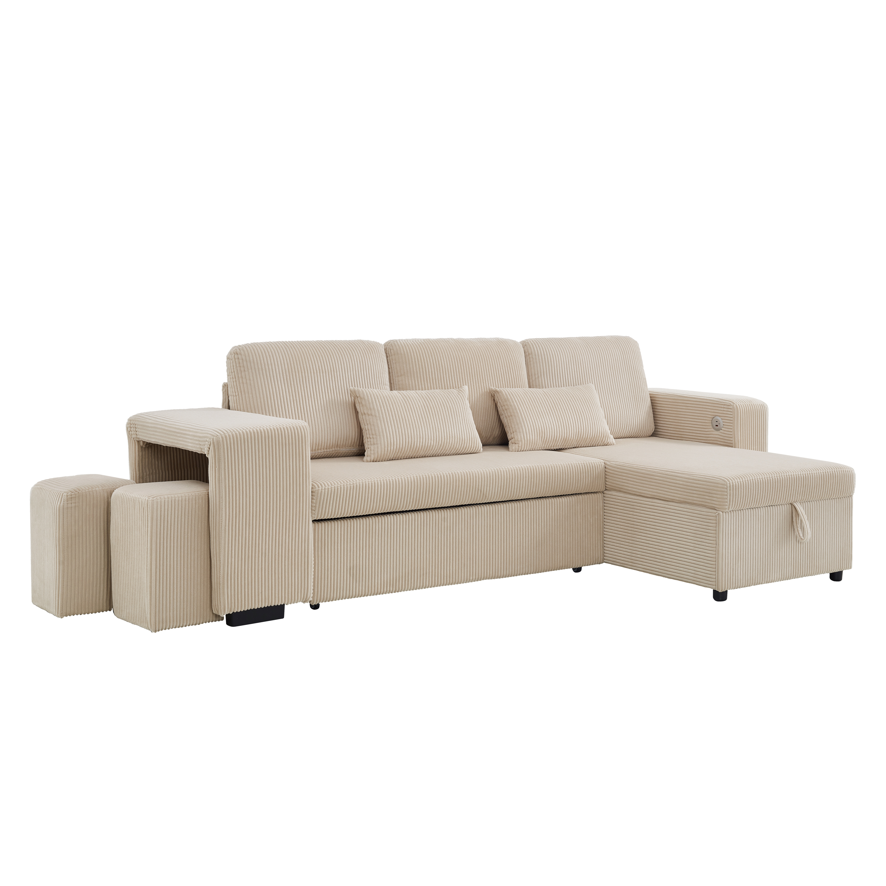 Product Name:Modern L-Shaped Convertible Sofa Bed, 3-in-1 Convertible Sofa Bed with Internal Storage Chaise, Nesting Footstools, Integrated Charging Station & Adjustable Armrest Side Storage, Corduroy Fabric,Beige