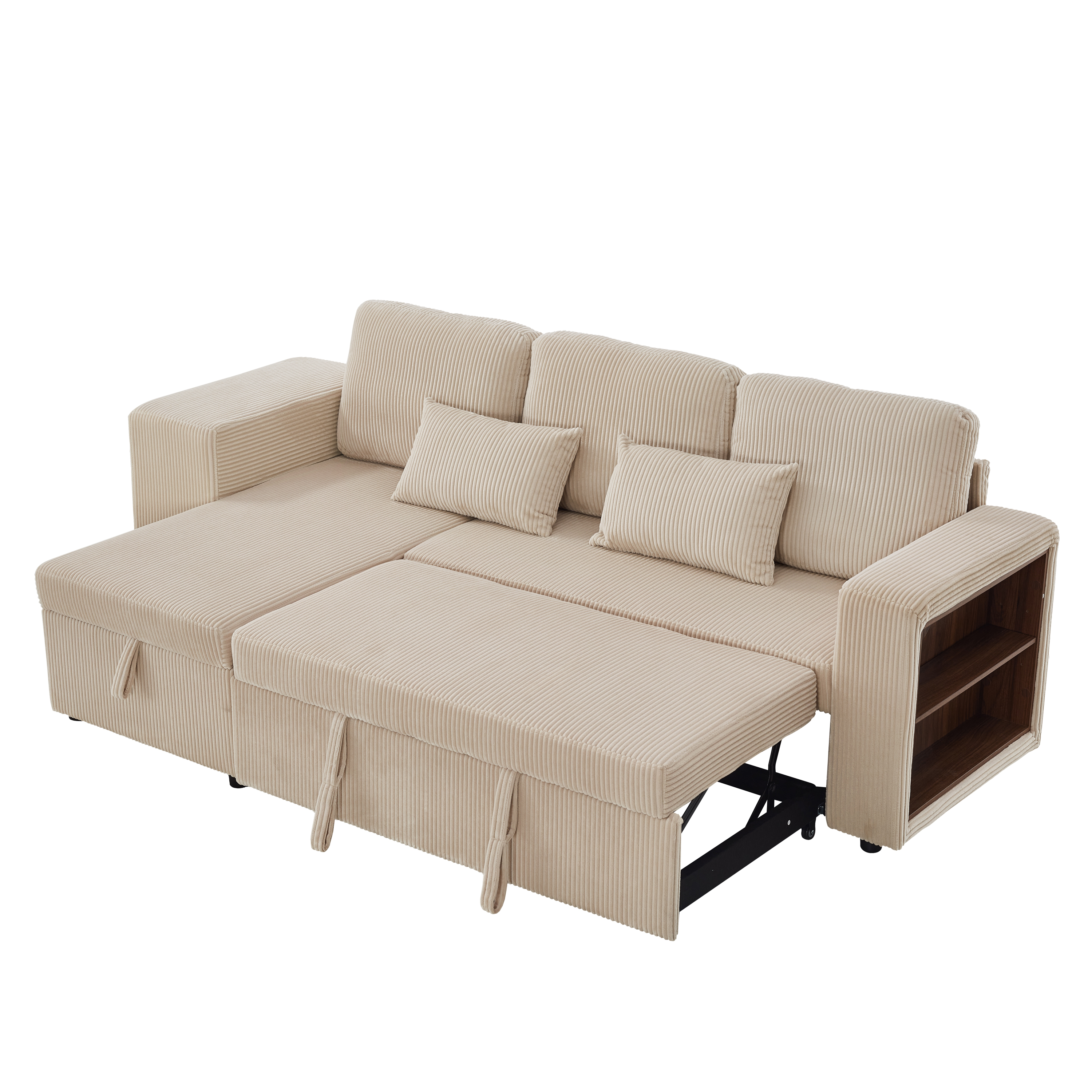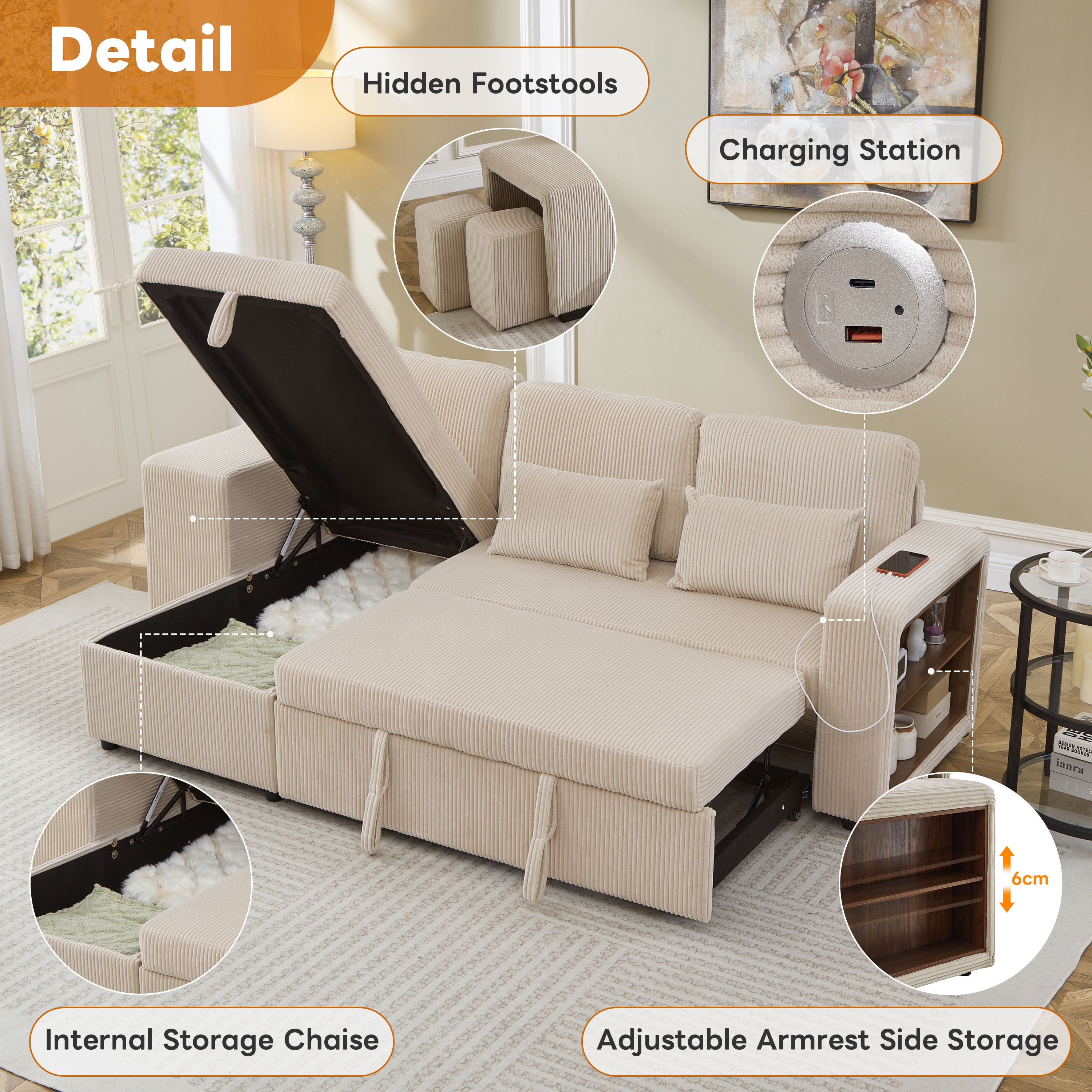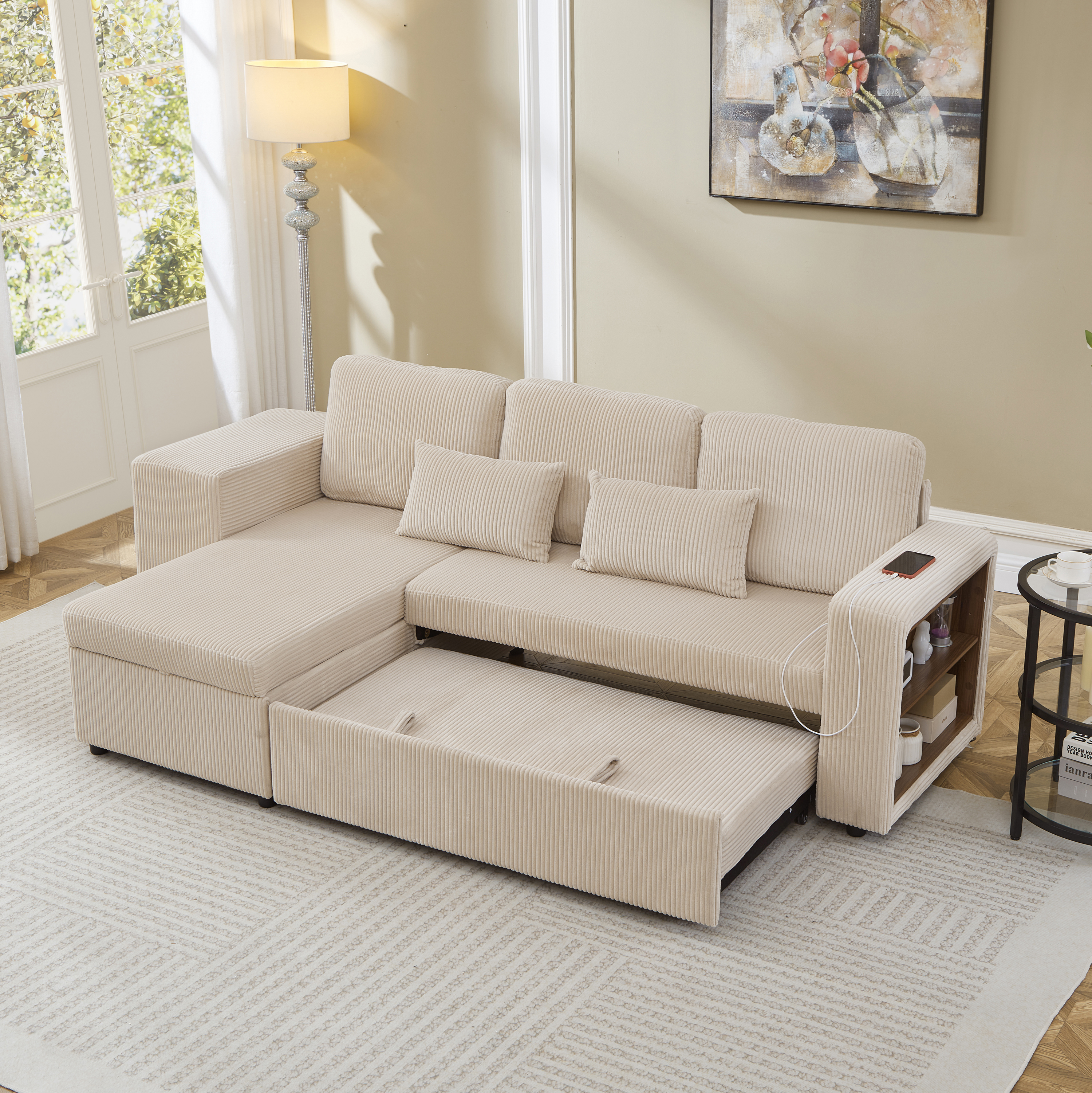 Product Name:Modern L-Shaped Convertible Sofa Bed, 3-in-1 Convertible Sofa Bed with Internal Storage Chaise, Nesting Footstools, Integrated Charging Station & Adjustable Armrest Side Storage, Corduroy Fabric,Beige