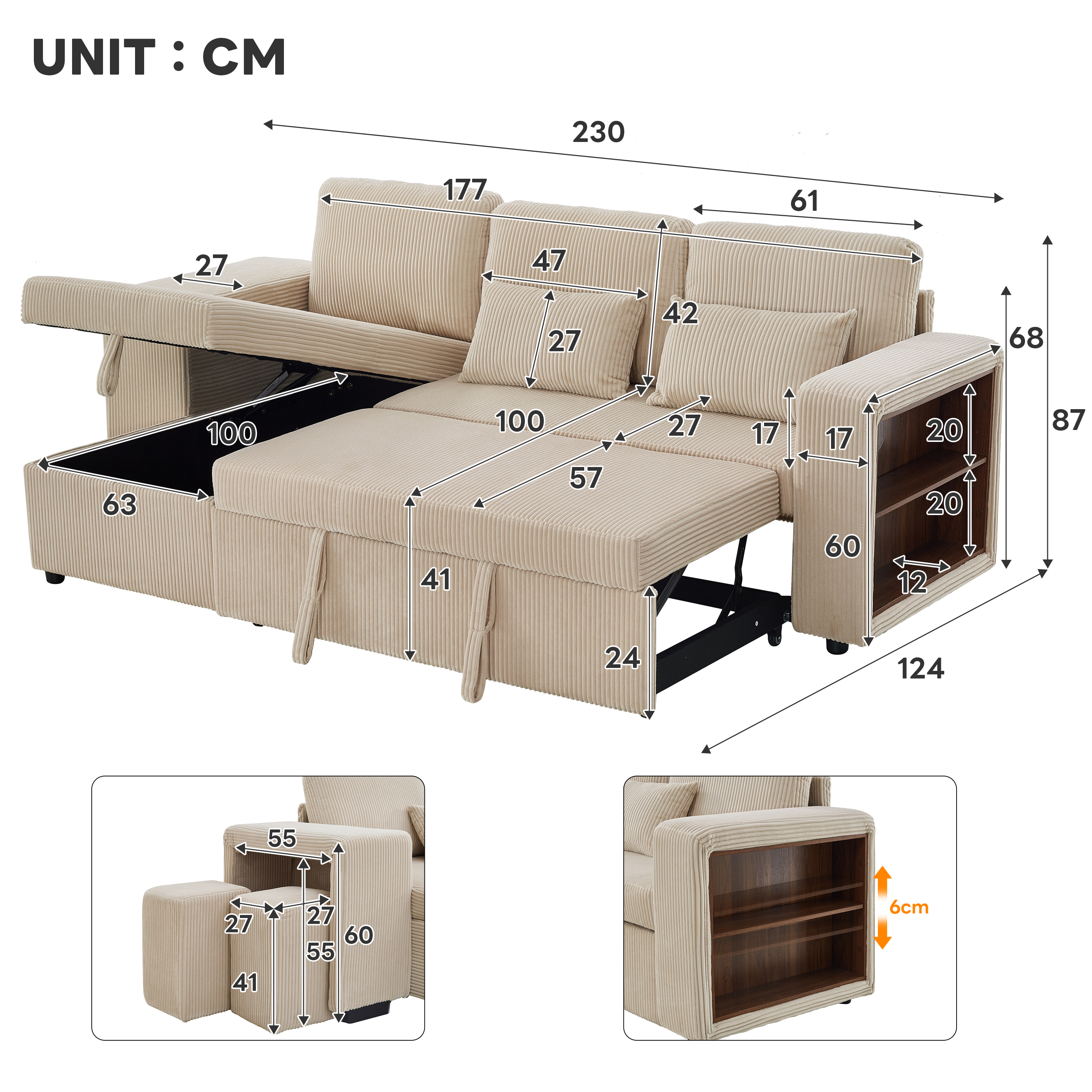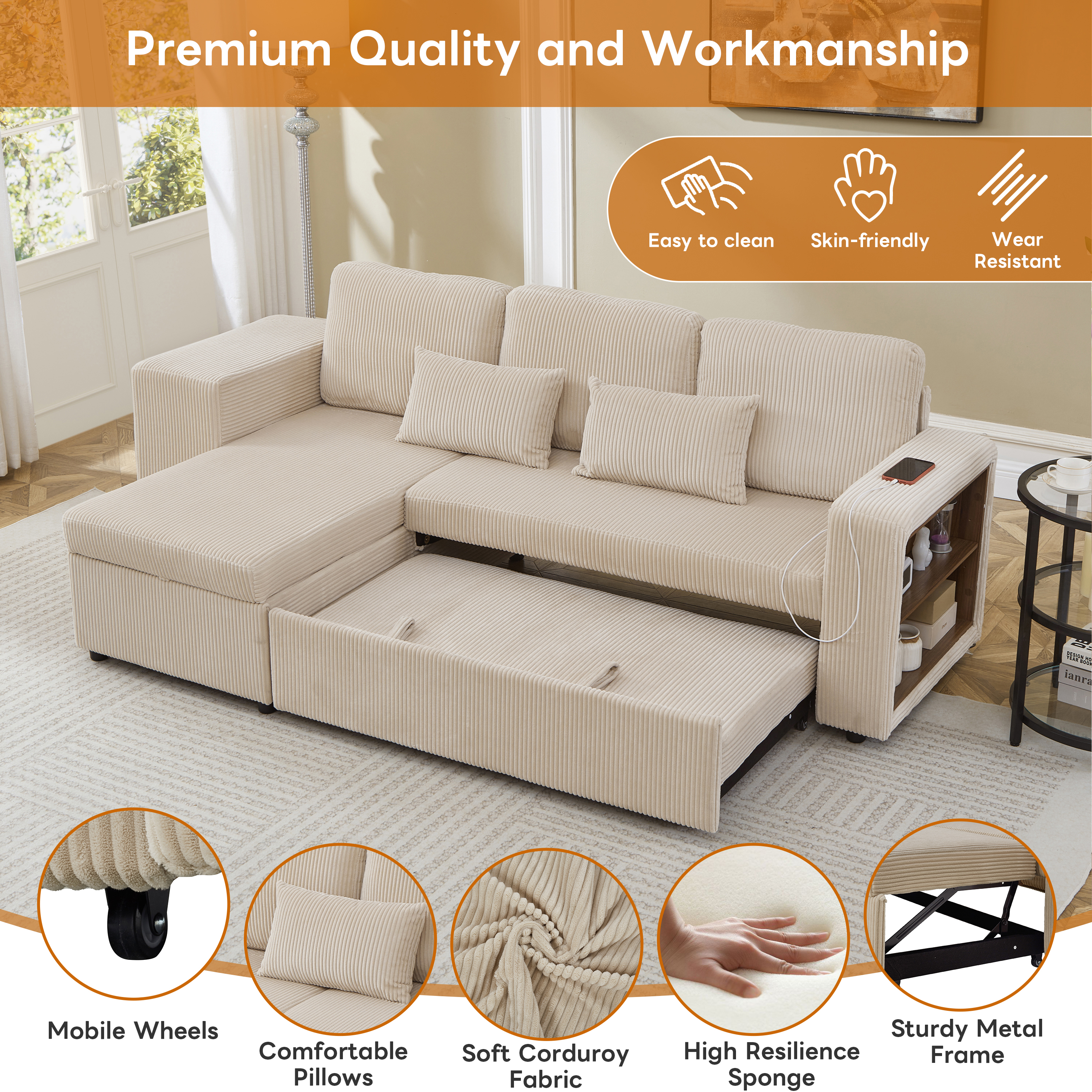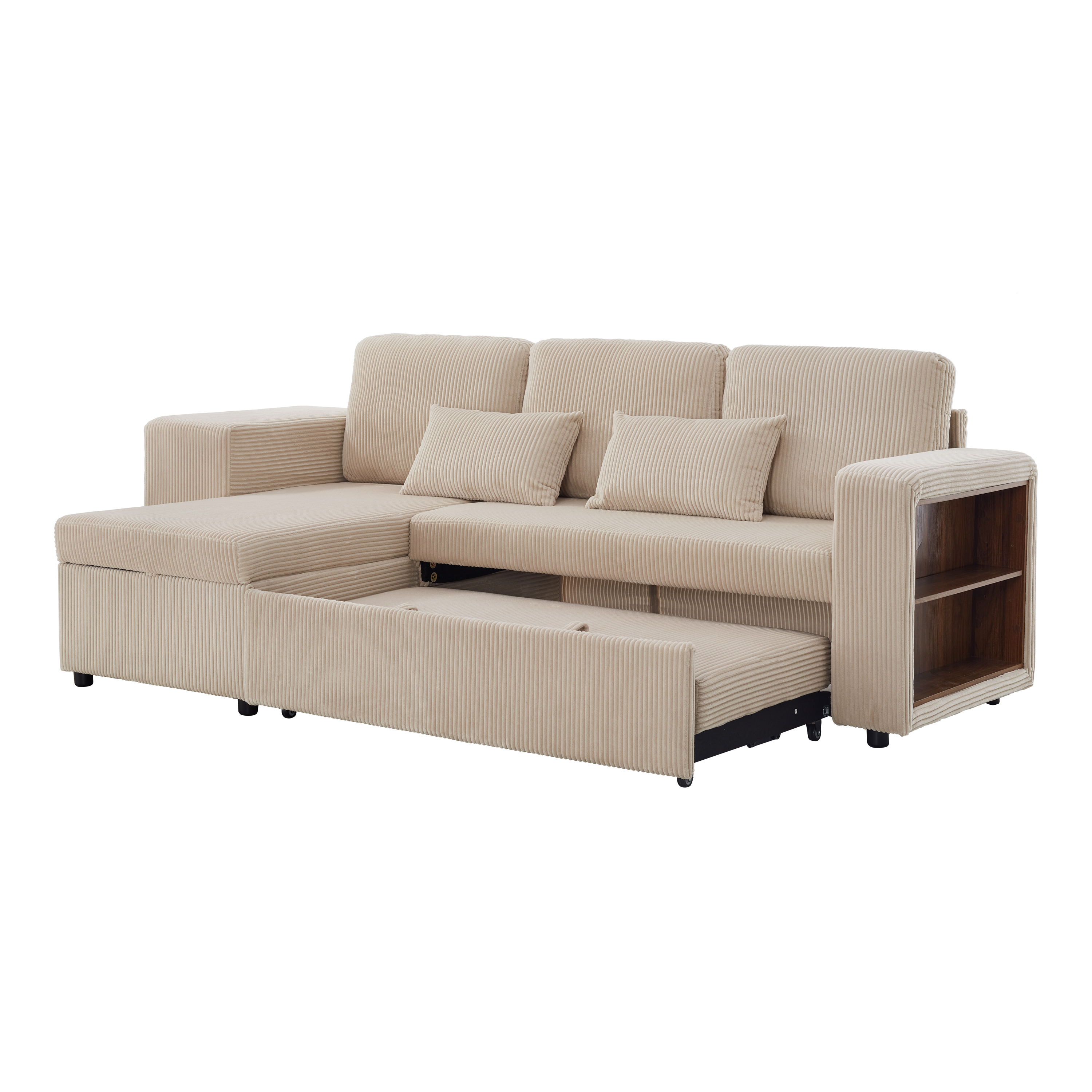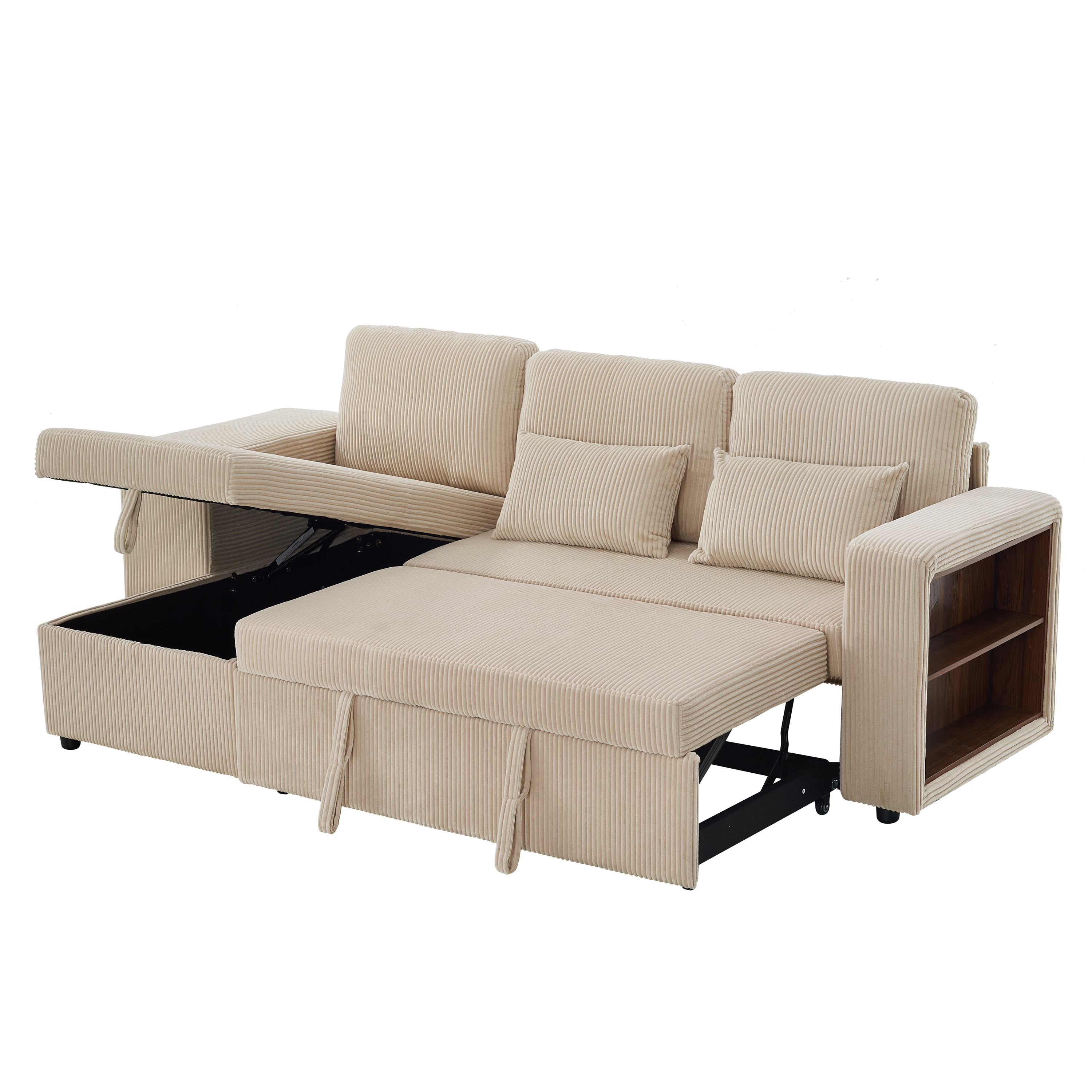 Product Name:Modern L-Shaped Convertible Sofa Bed, 3-in-1 Convertible Sofa Bed with Internal Storage Chaise, Nesting Footstools, Integrated Charging Station & Adjustable Armrest Side Storage, Corduroy Fabric,Beige