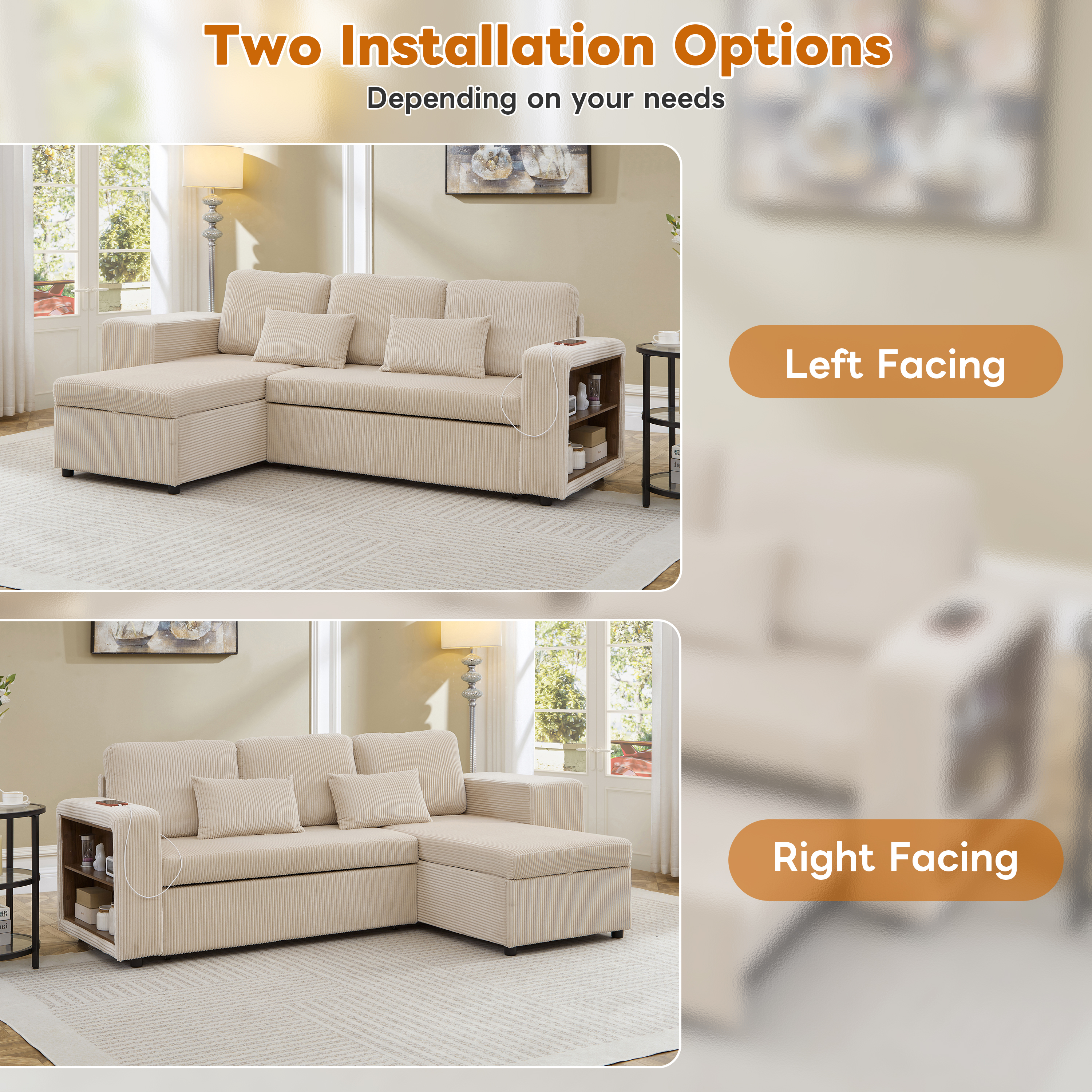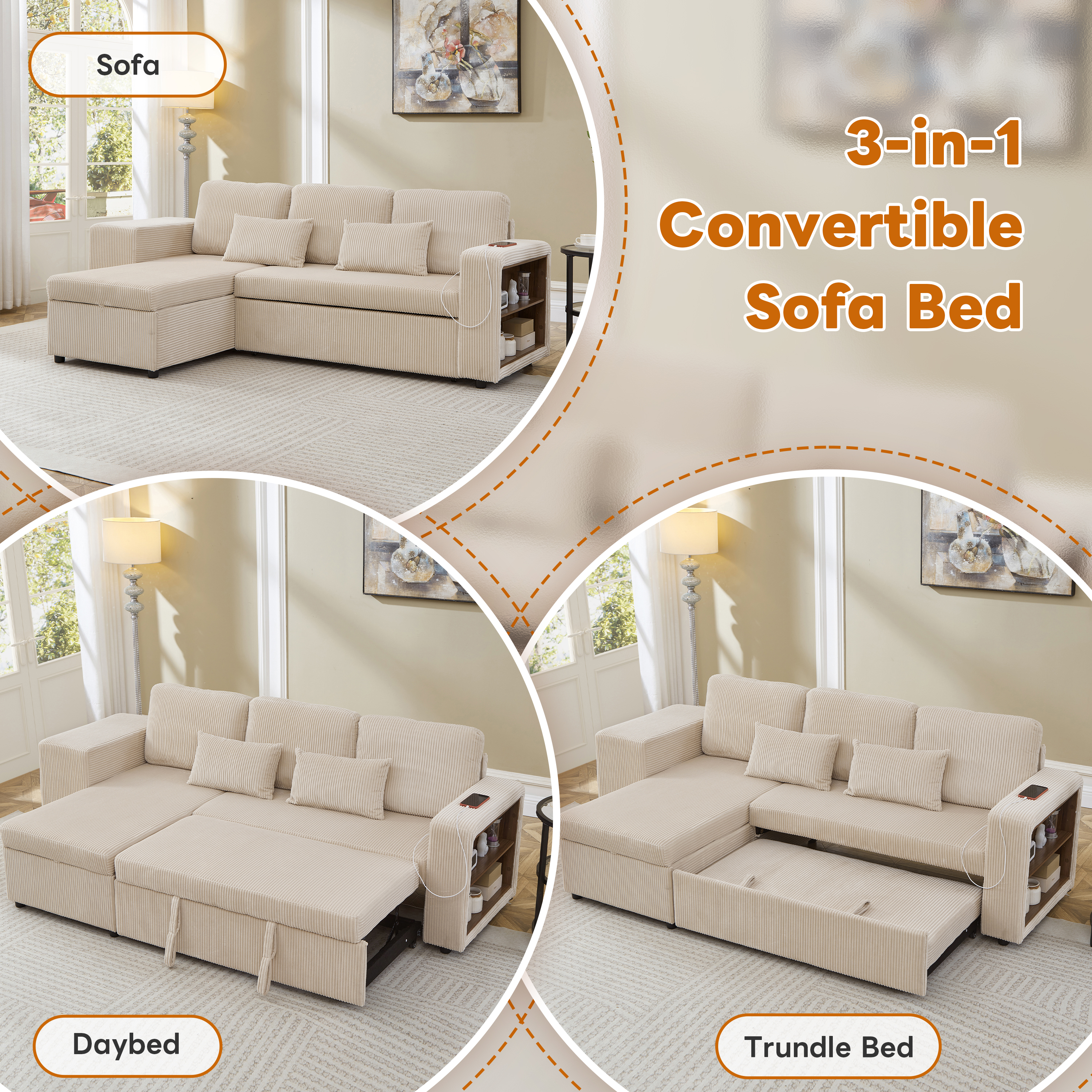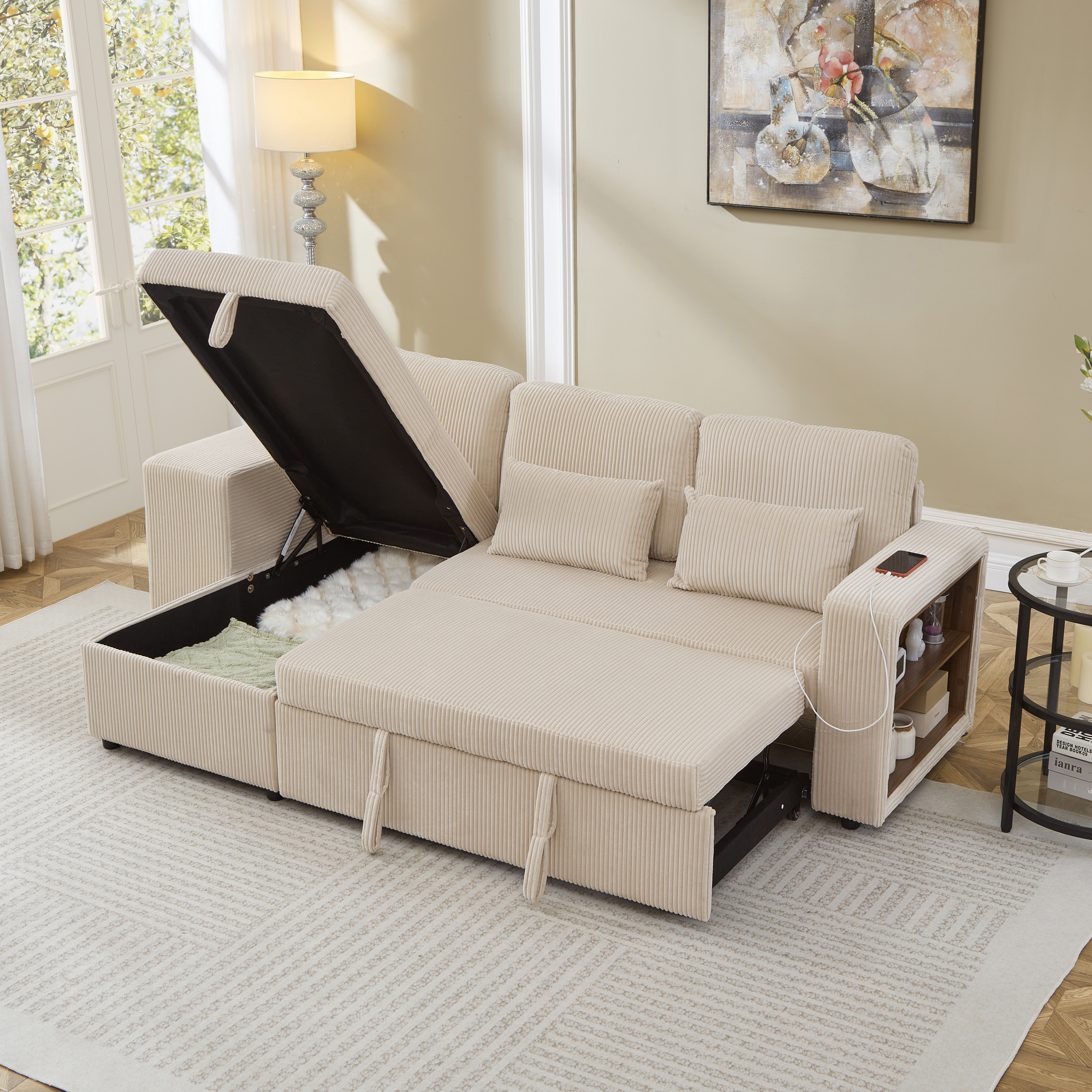 Experience the perfect blend of luxury and utility with this L-shaped sectional. Wrapped in premium corduroy, this 3-in-1 sofa bed transitions effortlessly from a chic settee to a cosy daybed or guest sleeper. Designed for maximum efficiency, it features a reversible configuration for two installation options and a spacious internal storage chaise to maintain a clutter-free home. With an integrated charging station and side shelving adjustable by 6cm, your essential is within reach. This is more than furniture; it is a complete hub for relaxation and modern convenience. Special Features - Three convertible forms: sofa, trundle bed and daybed - Reversible chaise: two ways installation - Chaise with internal storage - Smart charging station - Adjustable armrest storage - Space-saving nesting footstools - Soft corduroy fabric and high-density foam - Appearance design suitable for various home styles