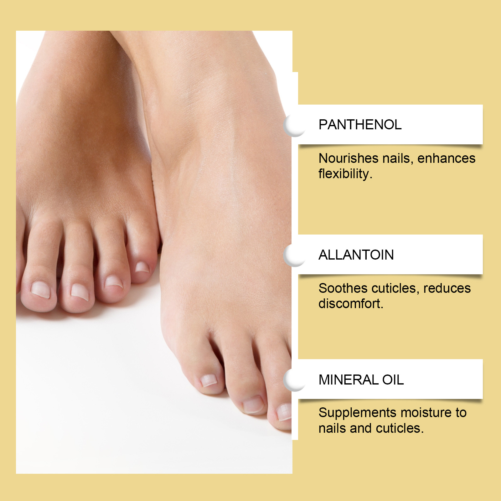 Active ingredients: Tocopherol (Vitamin E), allantoin, garlic bulb extract, kochia fruit extract, cnidium fruit extract, tea tree oil