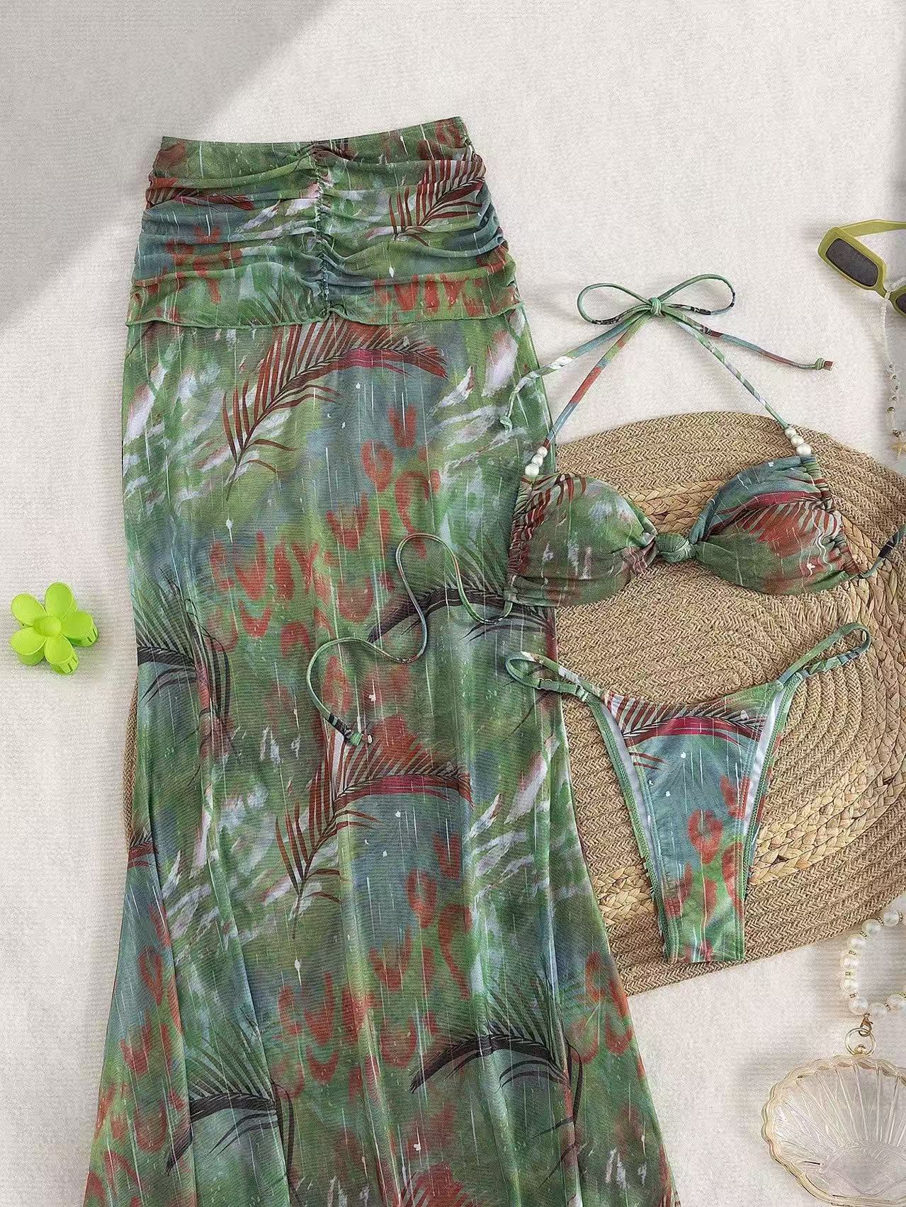 Necklace-style Beaded Halter Top Body-hugging Skirt Three-piece Set Split Bikini