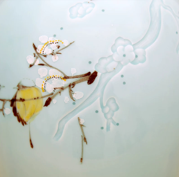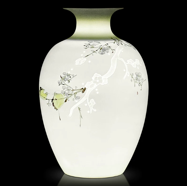 Color: Hand-painted pastel shadow-carved plum blossom with “Five Blessings” design moonlight vase (comes with base, certificate, and brocade box); hand-painted pastel shadow-carved “Joy on the Brow” moonlight vase (comes with base, certificate, and brocade box)