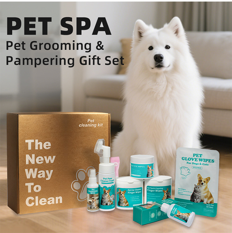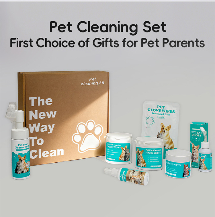 Product information:Material: Plastic Suitable for: Dogs Net content: Foot cleaning foam: 150 ml, Deodorant spray: 60 ml, Ear wash solution: 60 ml Packing list: Teeth cleaning finger cots x 50pcs +...