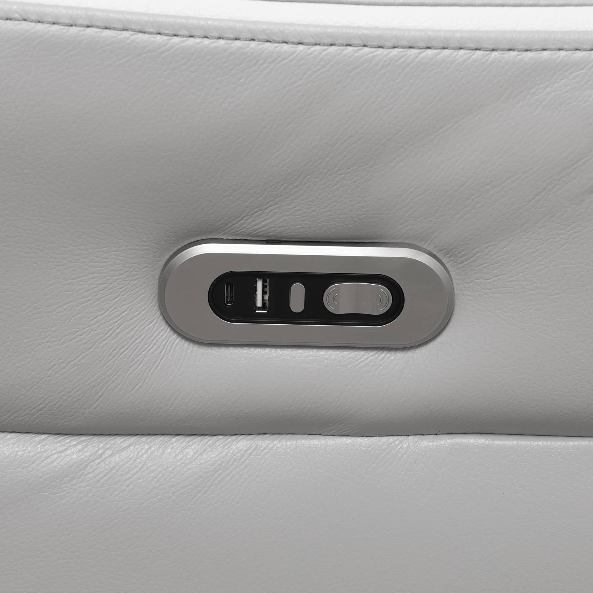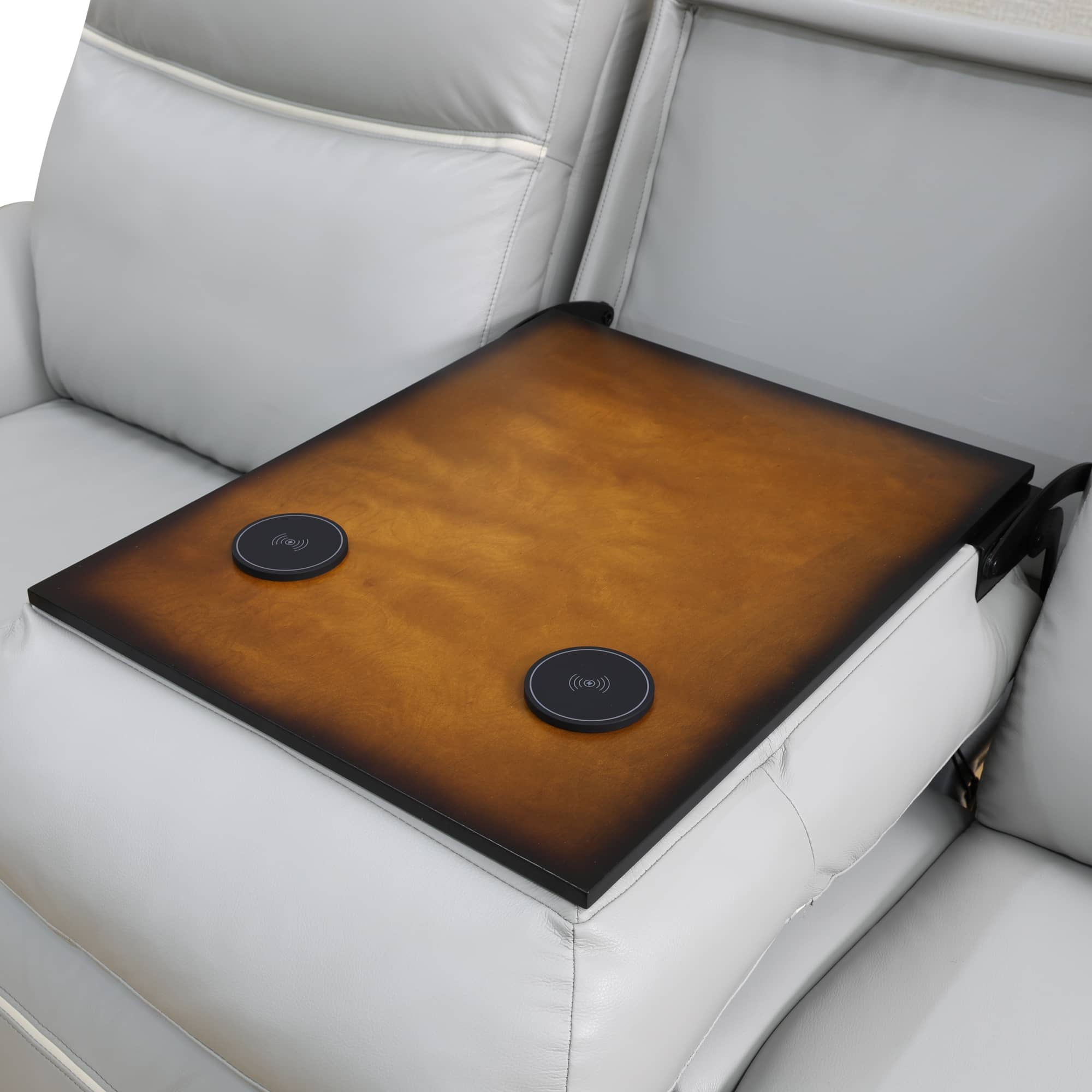 | CHARACTERISTIC | a. The product (Light Grey) with intelligent functions. The backrest tilts back can reach 110-115° for comfortable sitting, and also can reach the angle for sleeping. Control the switchgear for adjustable angle in your needs b. The loveseat with storage bucket for daily using items storage and cup-holder for drinks settlement c. The middle of sofa with reversible coffee table. The table with wireless chargers for phone charging d. The bottom of sofa with ambient LED lighting, incredible design makes the life colorful |