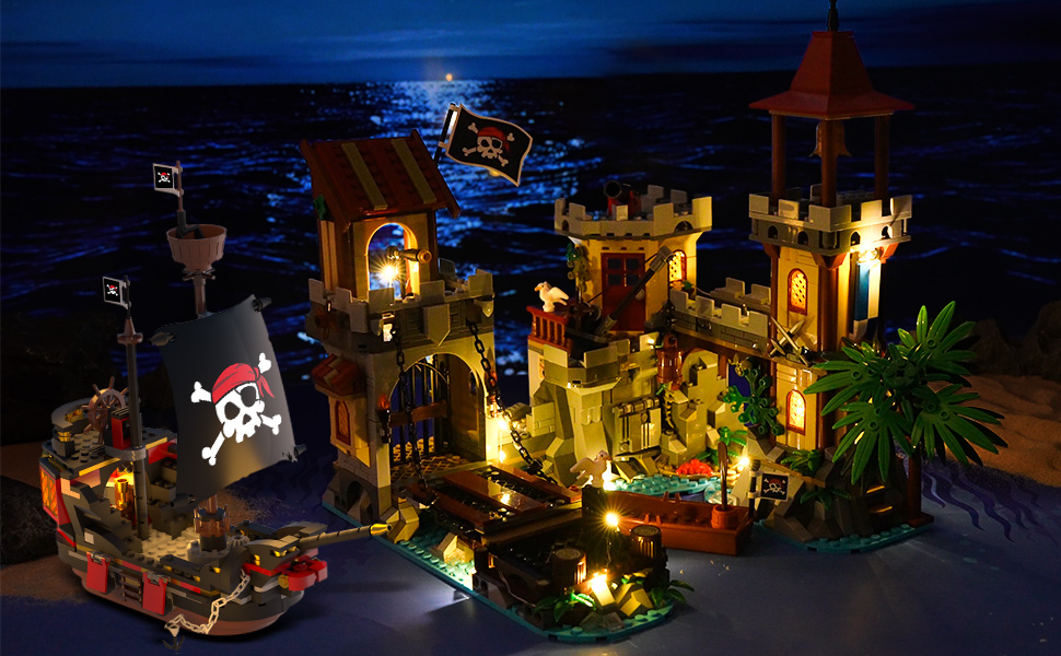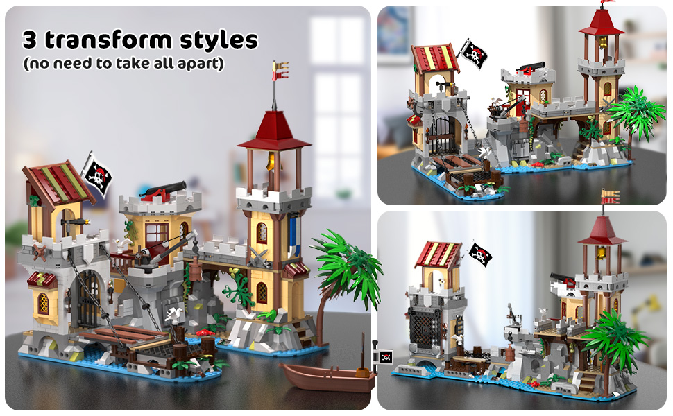 Designed with captivating details, INSOON pirate building set brings the legendary era of piracy to life! With three transformable styles, it keeps the excitement fresh every time. LED lights light up your creation, turning your pirate bay into a breathtaking spectacle, even in the dark. Perfect for reenacting epic pirate vs. navy battles or crafting your own swashbuckling tales, this building block set is a treasure trove of creativity and adventure for aspiring buccaneers aged 10+!