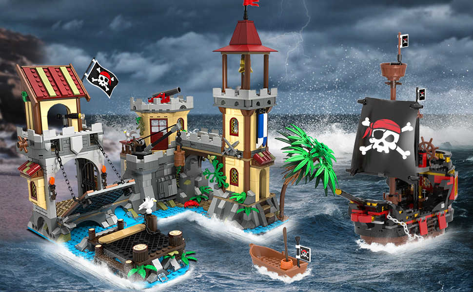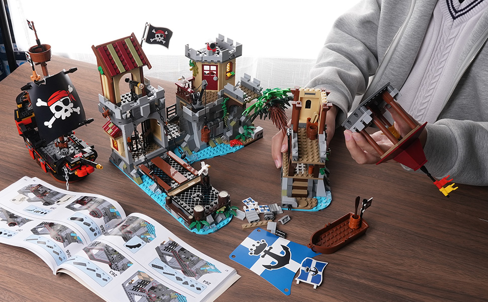 INSOON pirate bay building set is designed to captivate both young adventurers and seasoned builders alike. With 1502 premium pieces, this set offers a rewarding challenge for teens and adults, while still being accessible for kids aged 10 and up. Its intricate details, like the fully rigged pirate ship, fortified bay with cannons, and interactive fortress features, provide hours of engaging fun. Whether you're bonding with family, honing problem-solving skills, or simply reliving the thrill of pirate tales, this set is a treasure trove of creativity and excitement for all ages!