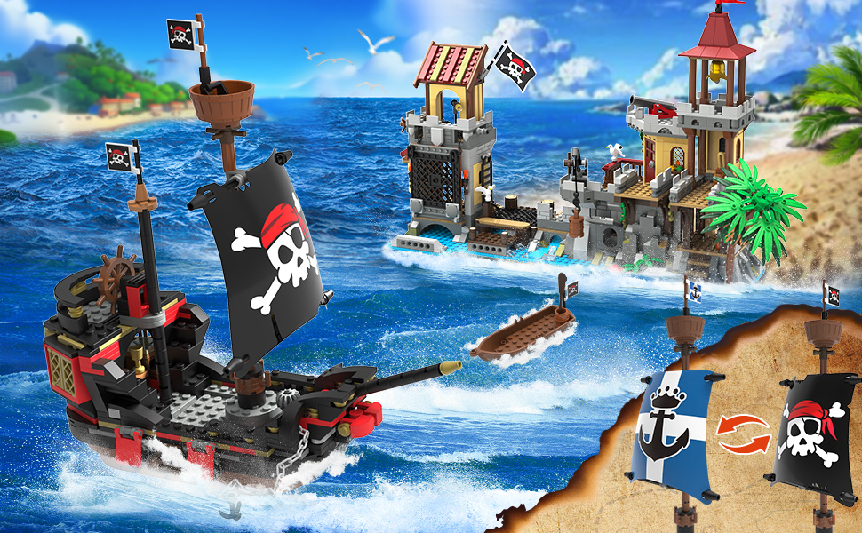 Equipped with 2 sets of flags, you can switch between pirate and navy, transforming your story from daring raids to heroic defenses. Will you rule the seas as a fearless pirate or uphold order as the navy? This dynamic feature adds endless storytelling possibilities to your pirate bay adventures!