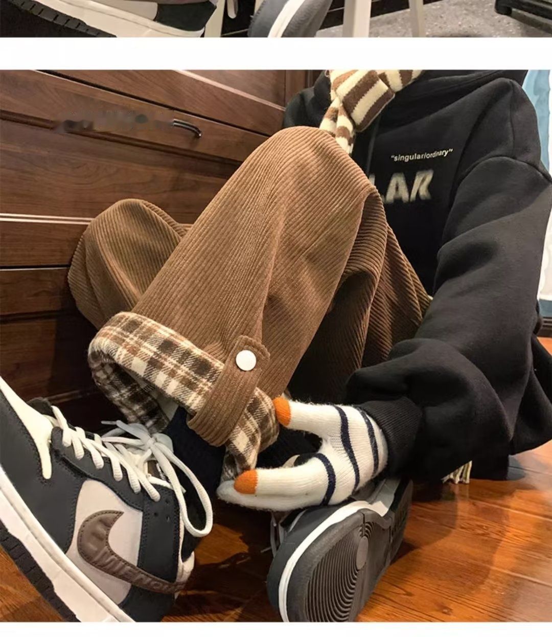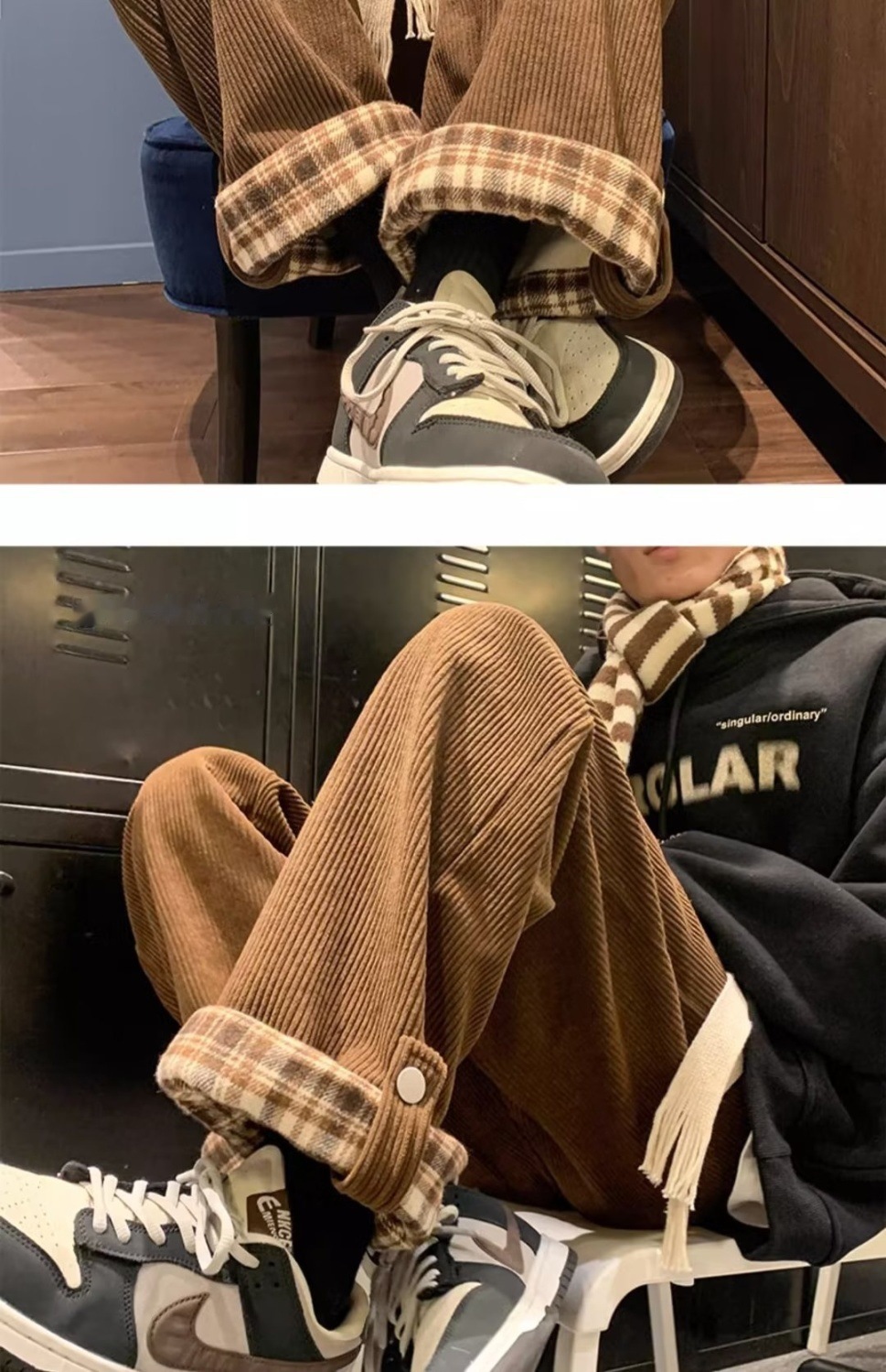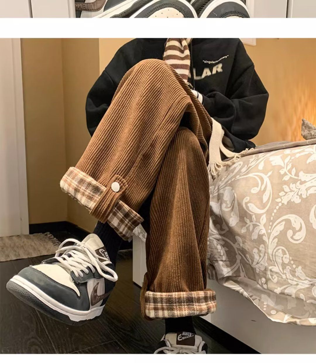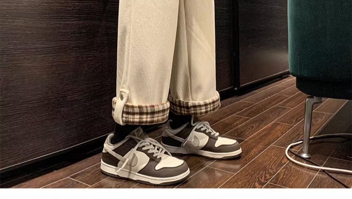 Plaid-cuffed Straight-leg Loose-fit Vintage Mens Casual Trousers