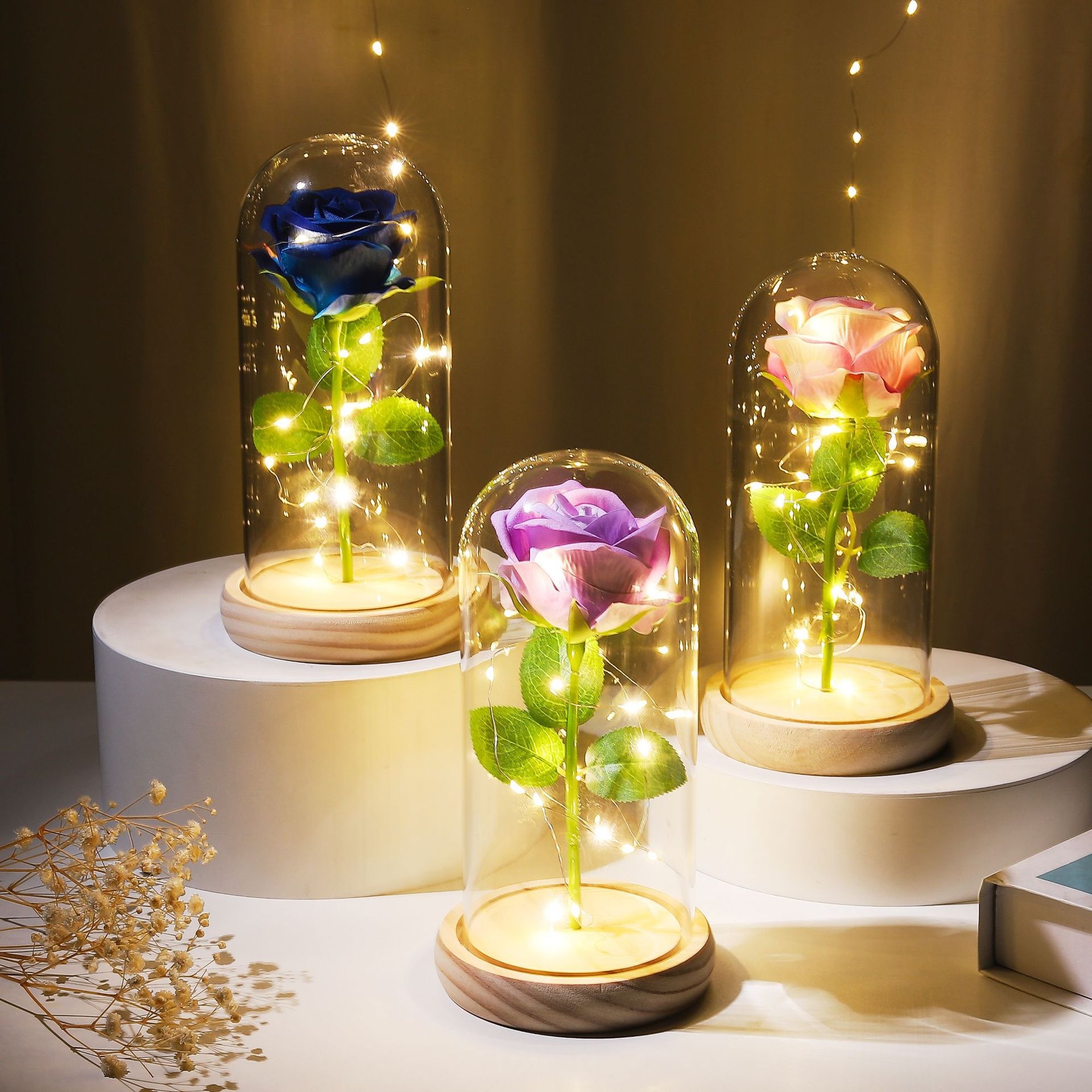 Preserved Flower Glass Dome Artificial Rose Night Light For Christmas