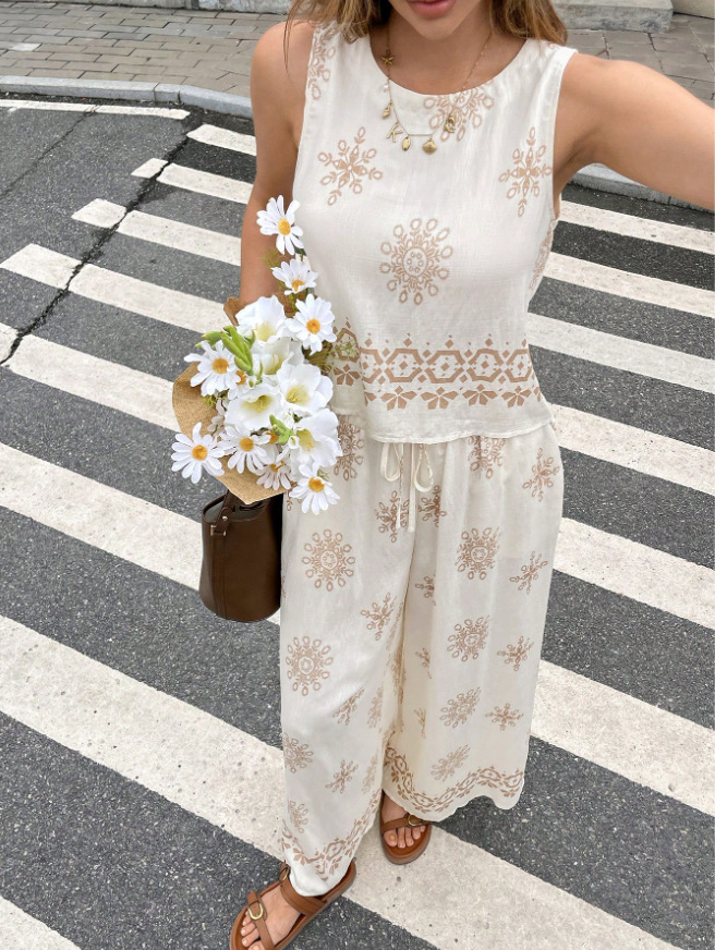 Printed Crew-Neck Sleeveless Tank Top And Pants Two-Piece Set