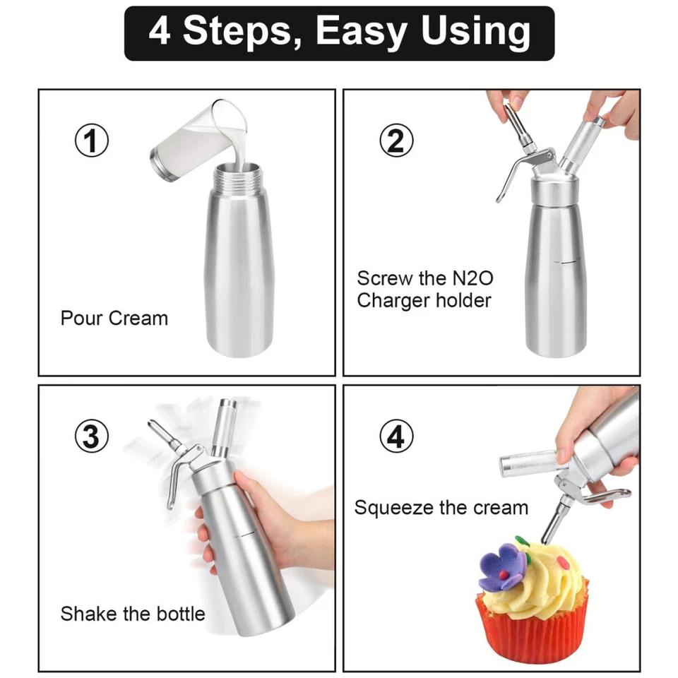 - Aluminum and Stainless Steel Material in Food Grade: The body of the cream whipper is made of food-grade aluminum material, which is robust and durable. Compared to traditional plastic nozzles, our nozzles are made of stainless steel, which is easier to sterilize, safe, and hygienic.